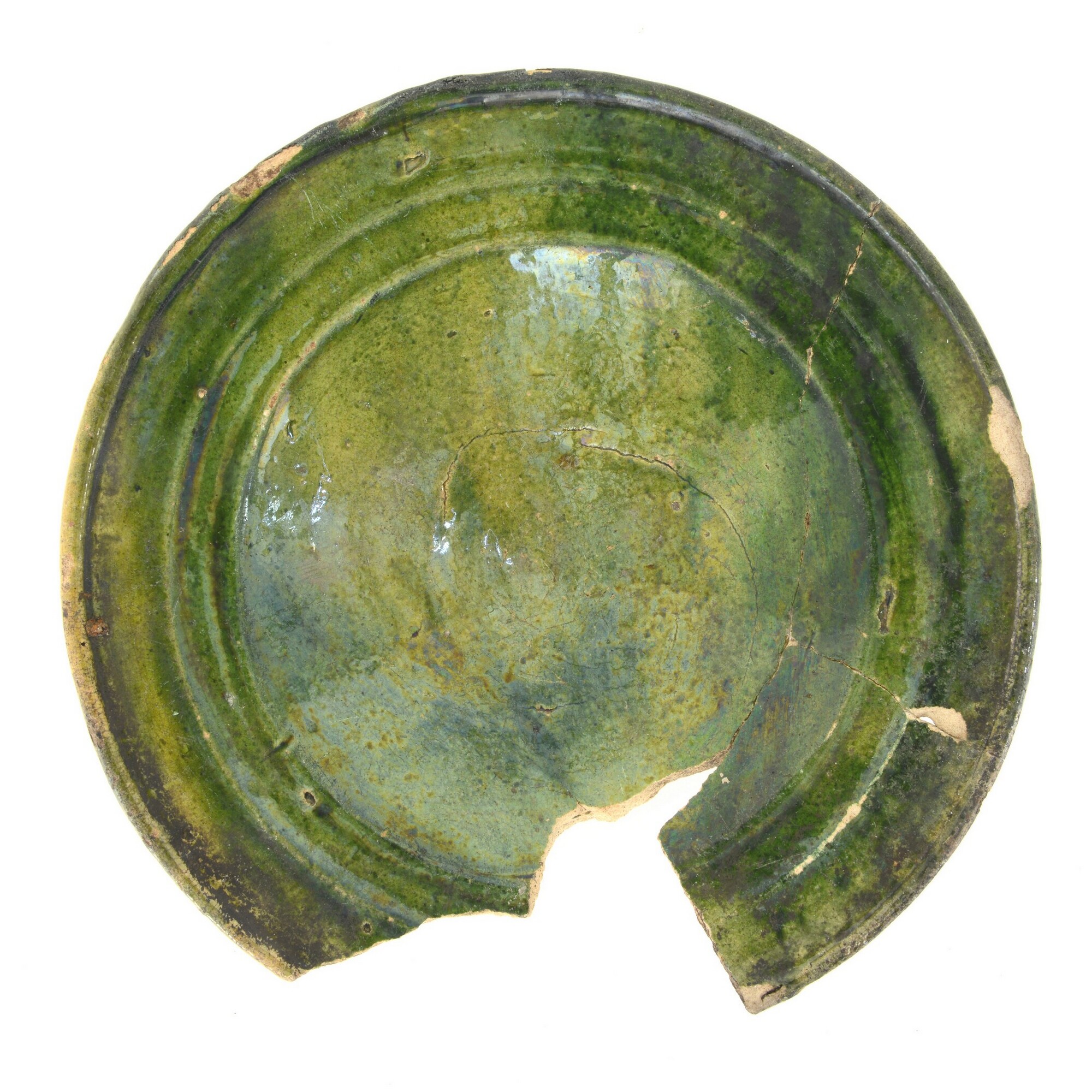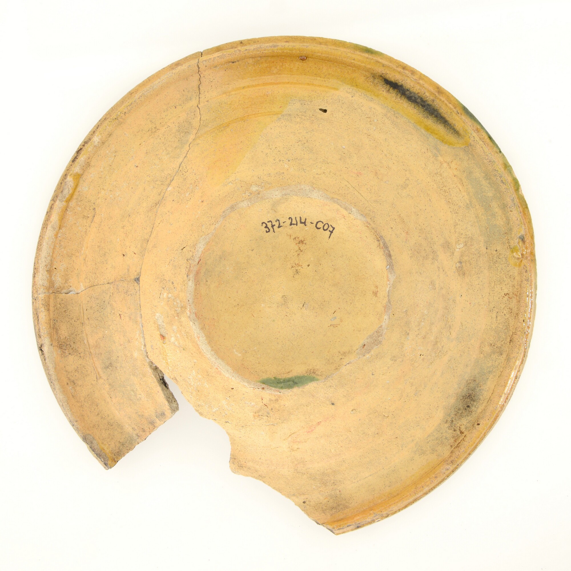 Bord; w-bor-12; bord met vlag met dubbele knik en van buiten aangedrukte rand; witbakkend aardewerk; bovenzijde loodglazuur met koperoxide; standring