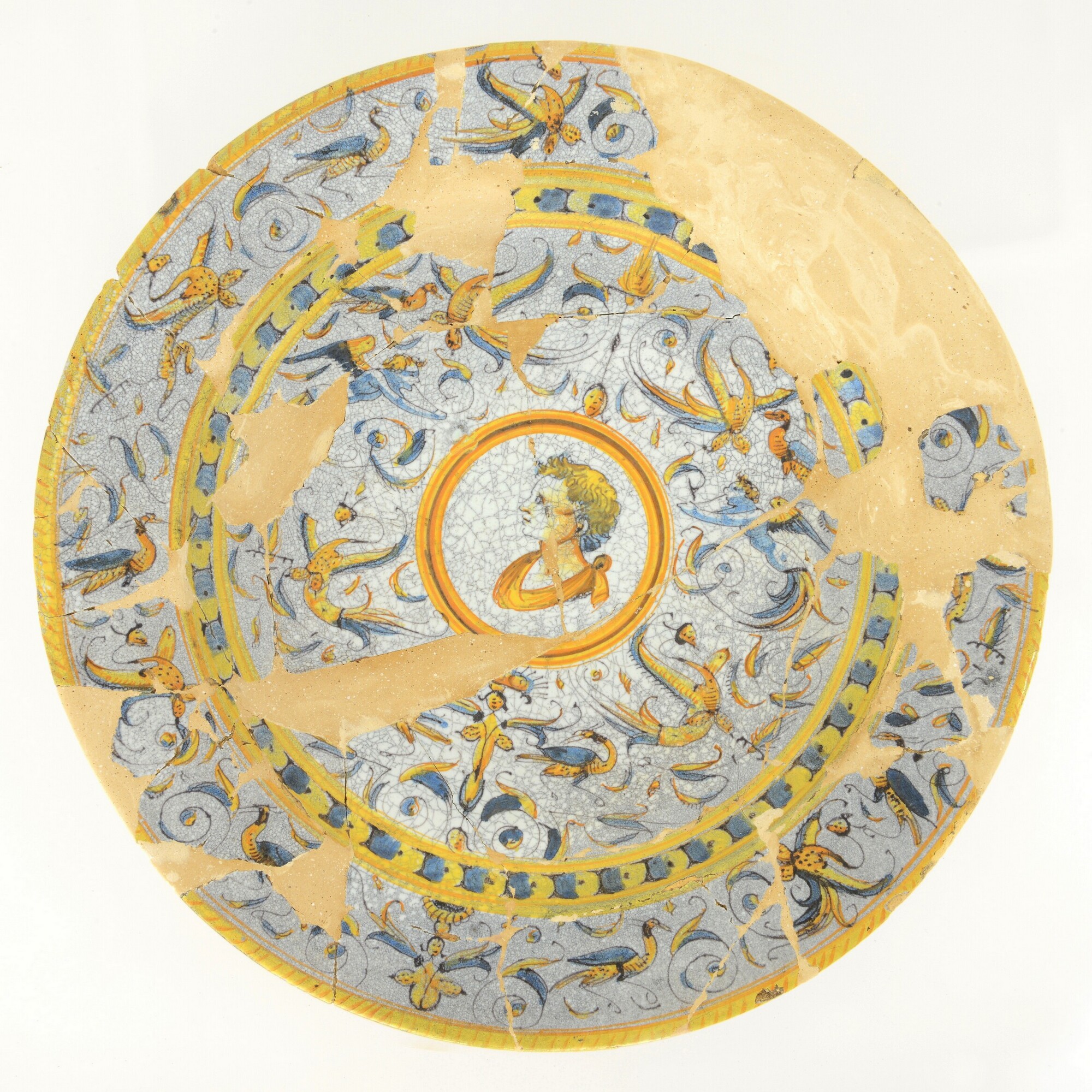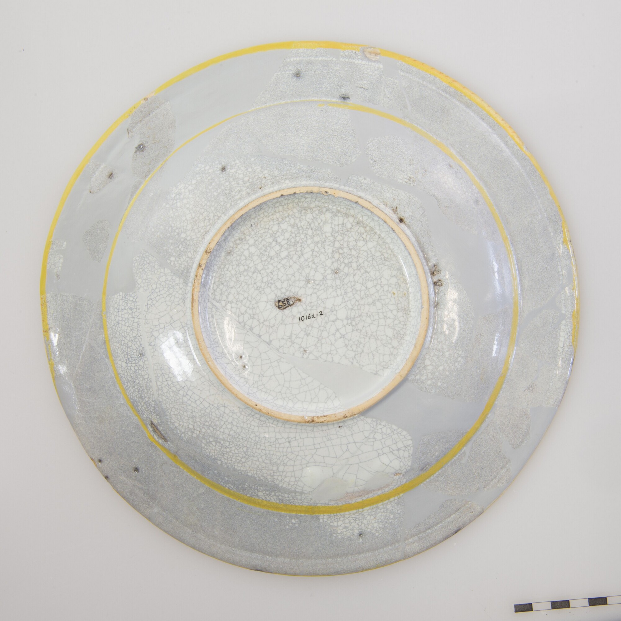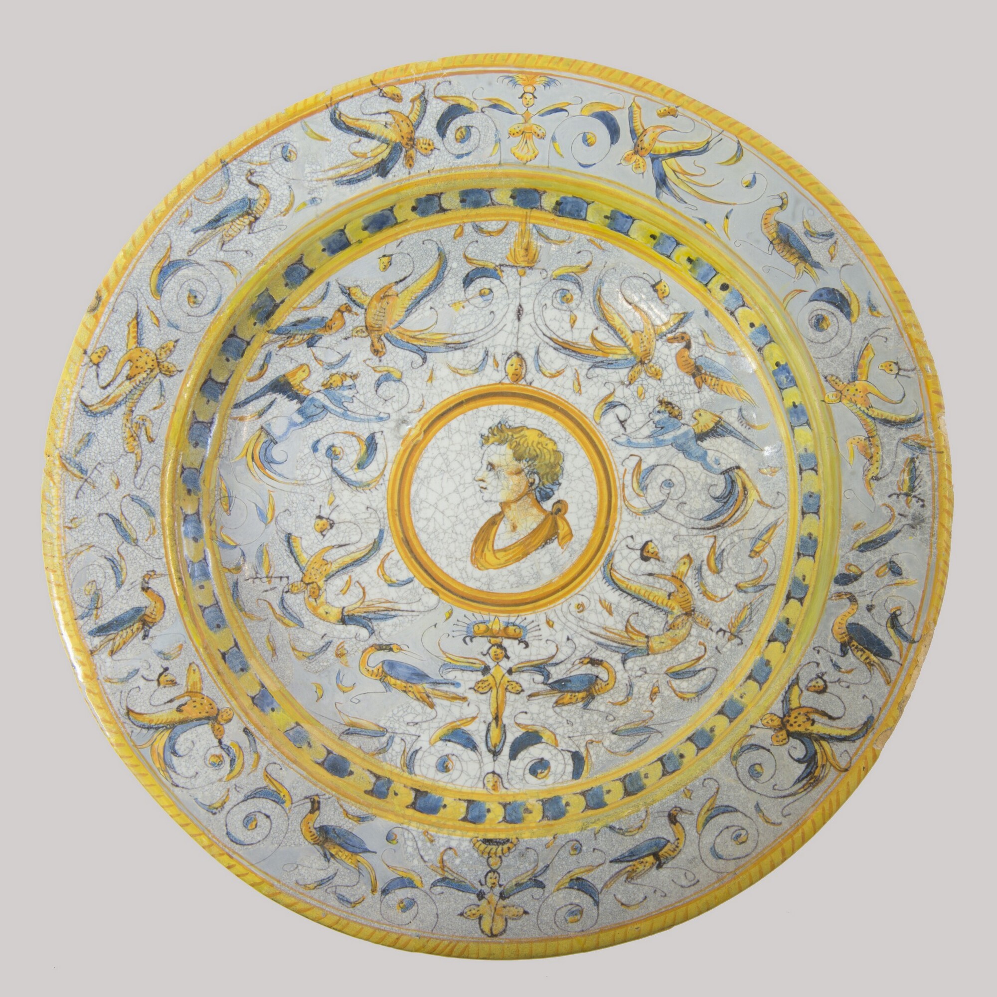 Bord; f-bor-; faience; tinglazuur; blauw/oranje/geel op wit: sp: in een medaillon staat een buste naar links afgebeeld en hierbuiten grotesken, bestaande uit engelen en fabeldieren, plateaus met bloemen en draperieen. vl: een baan met fabeldieren met vrouwenkopjes en pauwen, verbonden door ranken met bloemen; A Raffaellesca’-stijl; standring; herkomst: Italië, Frankrijk of Nederland (Haarlem, atelier Verstraeten)
