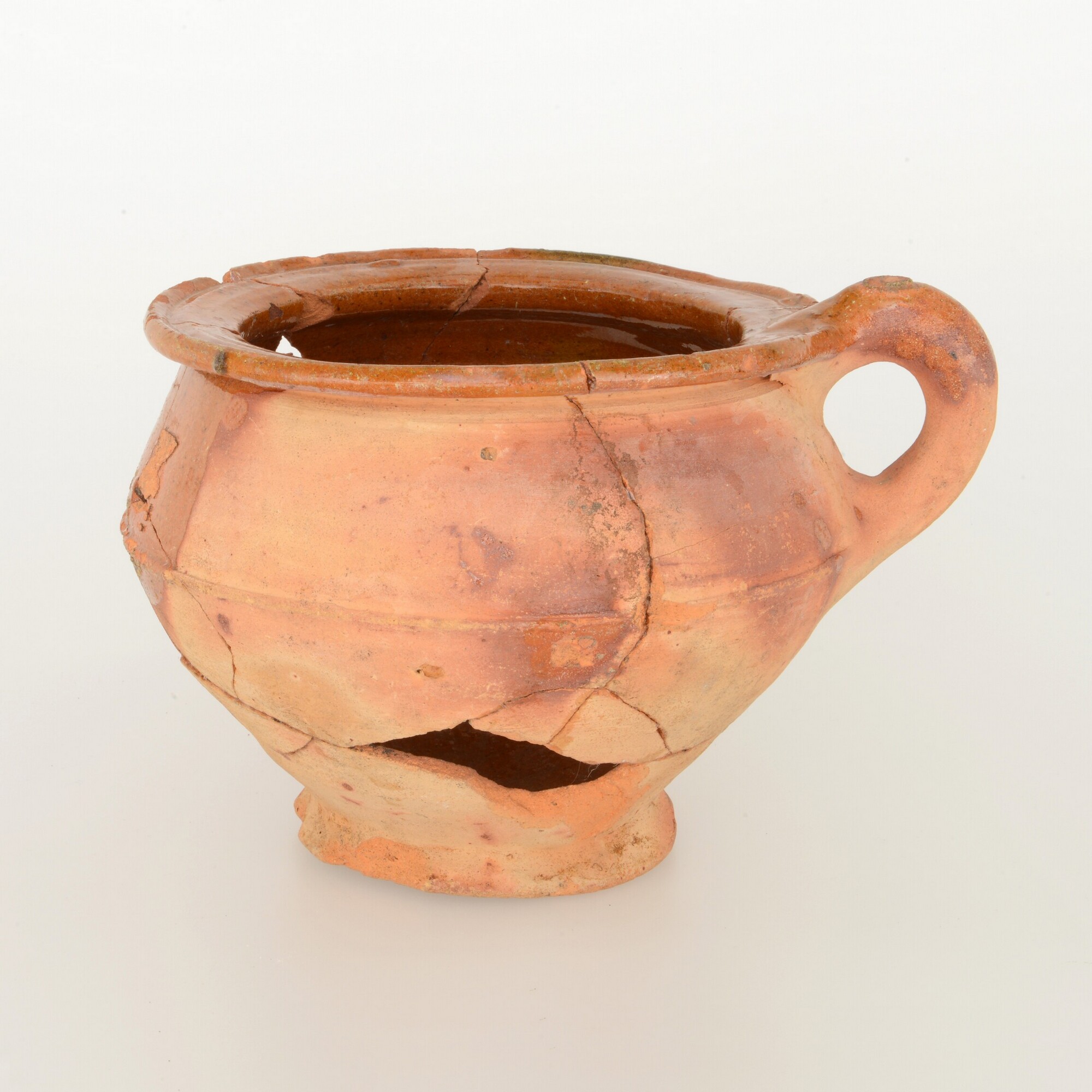 Pispot; r-pis-5; pispot met scherpe buikknik en platte rand; roodbakkend aardewerk; inwendig loodglazuur; standring; één worstoor