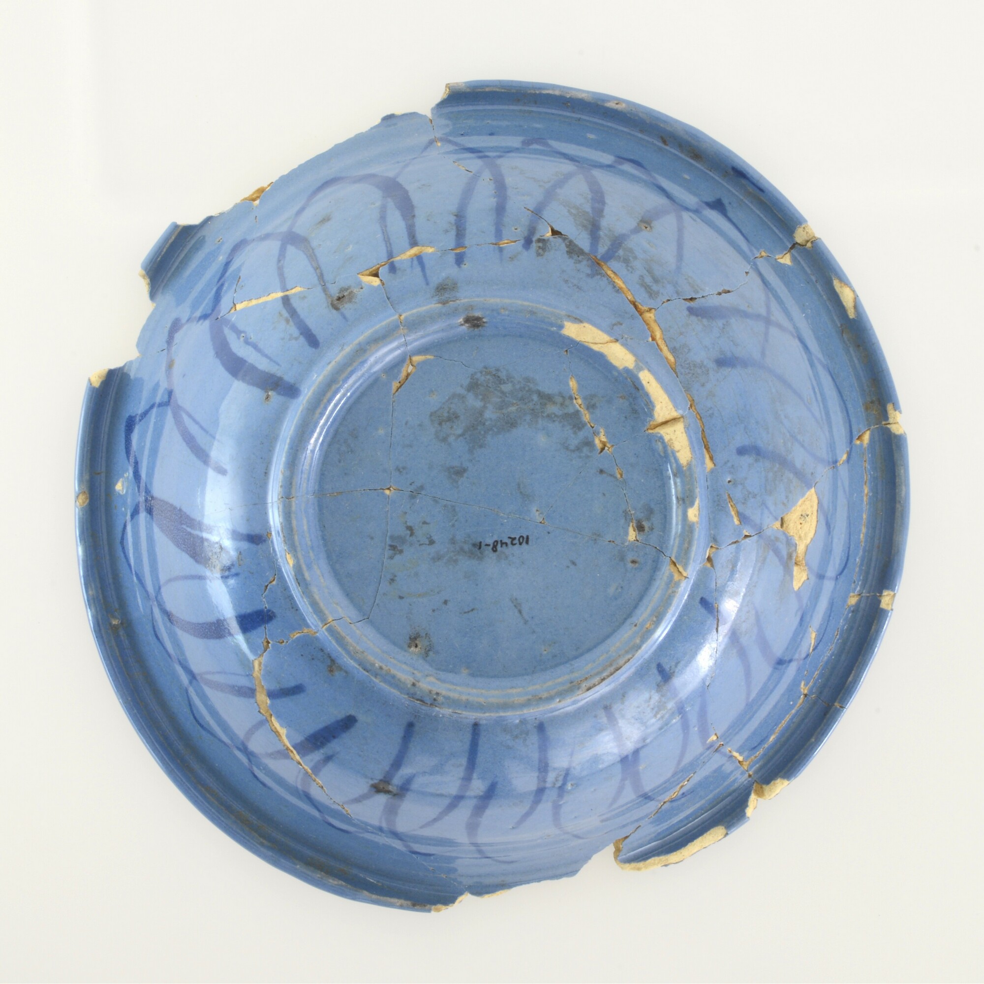 Kom; i-kom-1; kom met vloeiende overgang spiegel naar vlag en uitgebogen rand; Italiaanse faience; boven- en onderzijde tinglazuur met kobaltoxide; blauwe beschildering op lichtblauw fond: spiegel: bladmotief, vlag: Ju-i-motief; onderzijde wand: kruisende bogen; standring met secundaire doorboring; herkomst: Italië, Ligurië