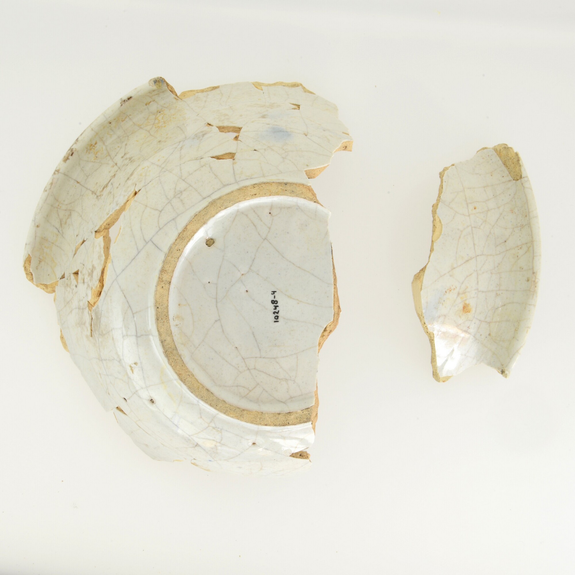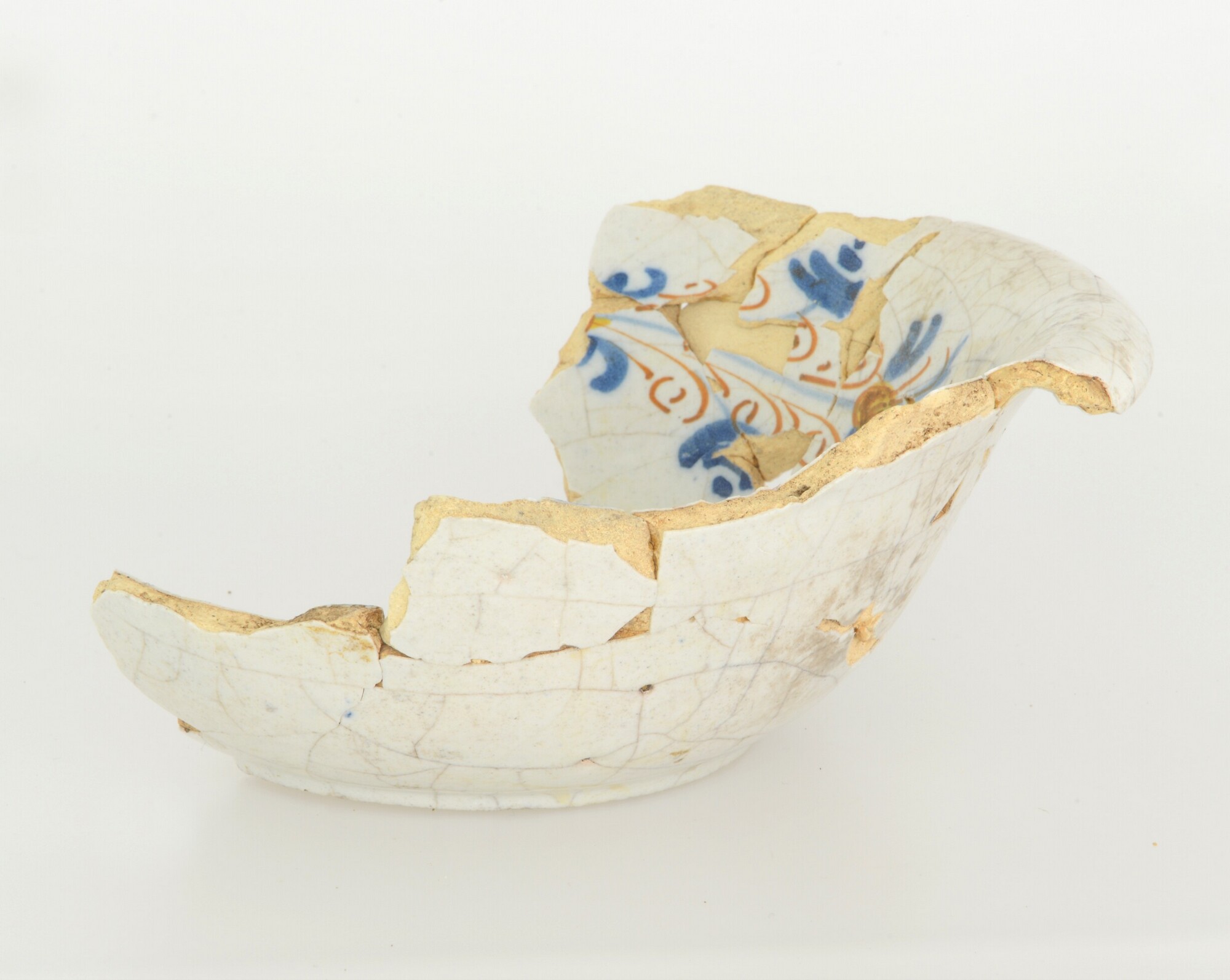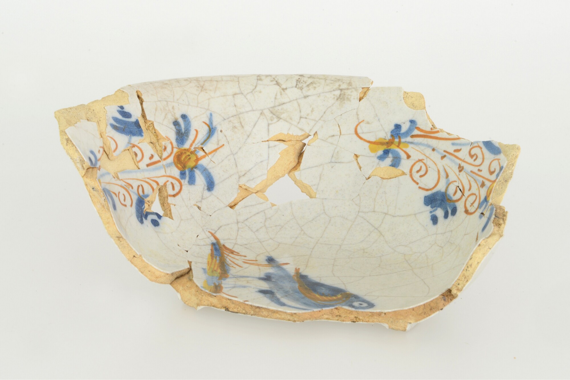 Kom; i-kom-1; kom met vloeiende overgang spiegel naar vlag en uitgebogen rand; Italiaanse faience; boven- en onderzijde tinglazuur; beschildering in blauw, geel en oranje; spiegel: vogel op grondje, vlag: losse aigrette-motieven; standring; herkomst: Italië, Ligurië