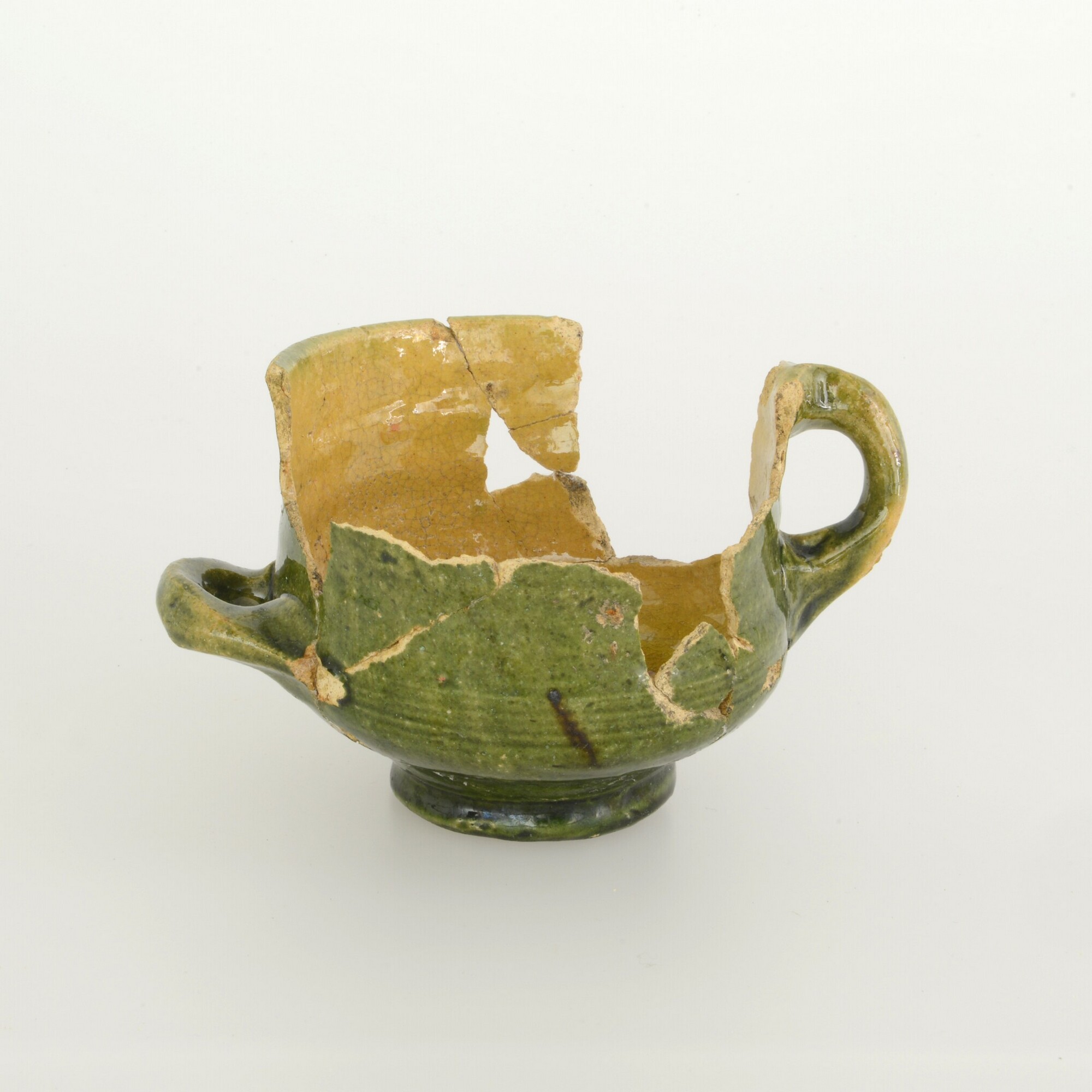 Kop; w-kop-52; kop met afgeronde knik bodem naar wand, steile wand met rechte rand; witbakkend aardewerk; loodglazuur met koperoxide; standvoet; één horizontaal worstoor en één verticaal worstoor