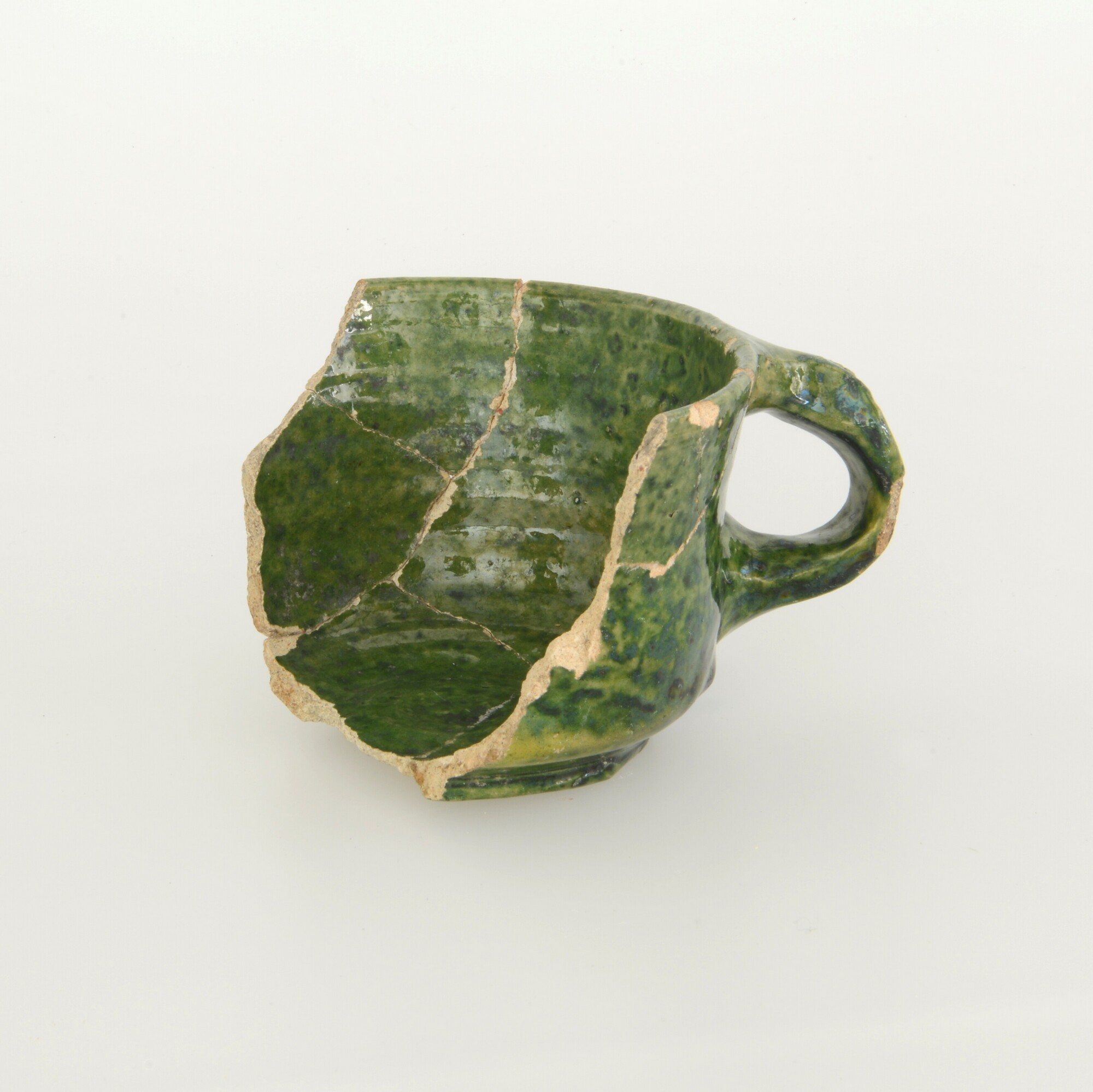 Kop; w-kop-3; kop met uitstaande wand en rechte rand; witbakkend aardewerk; in- en uitwendig loodglazuur met koperoxide; standvlak; één toegeknepen lintoor