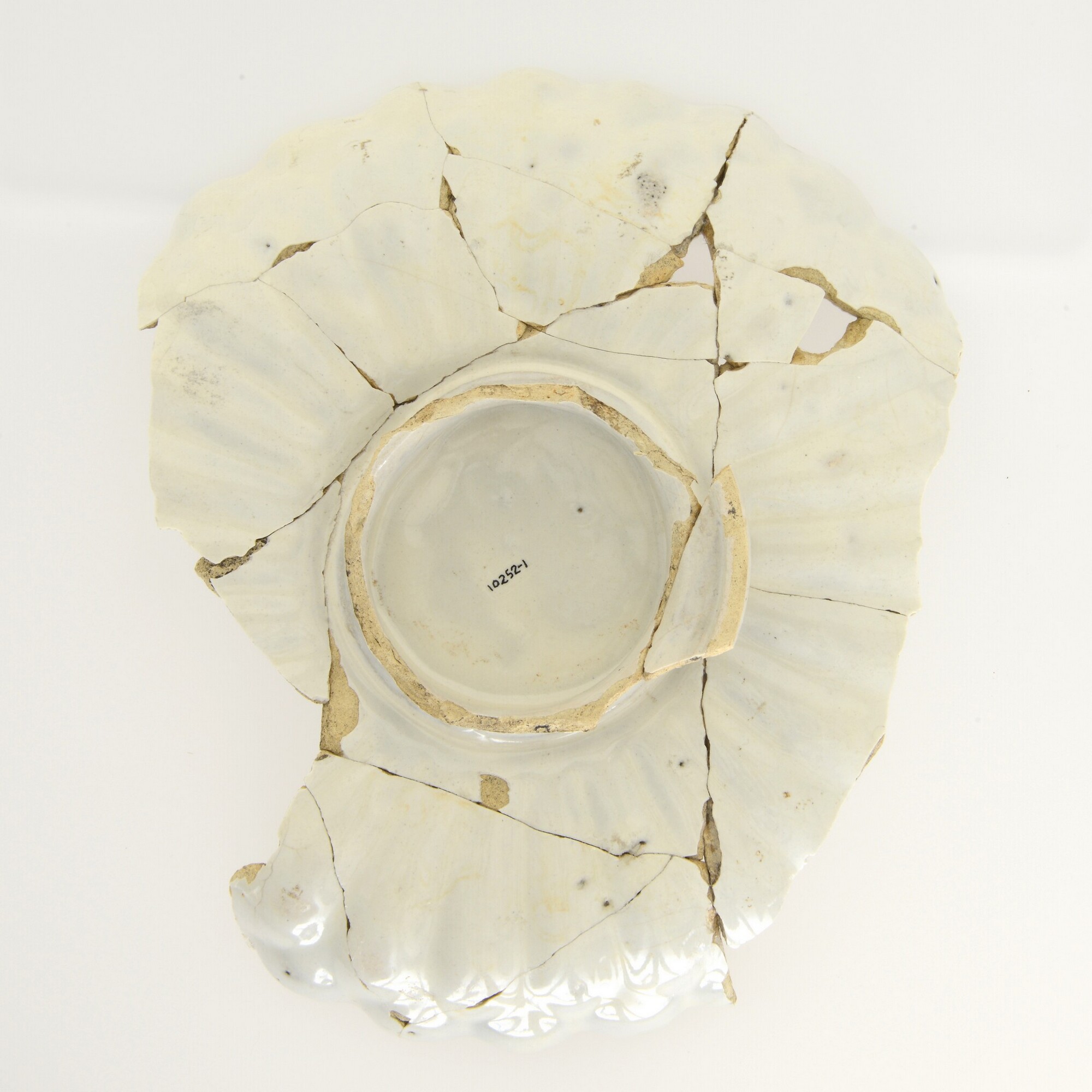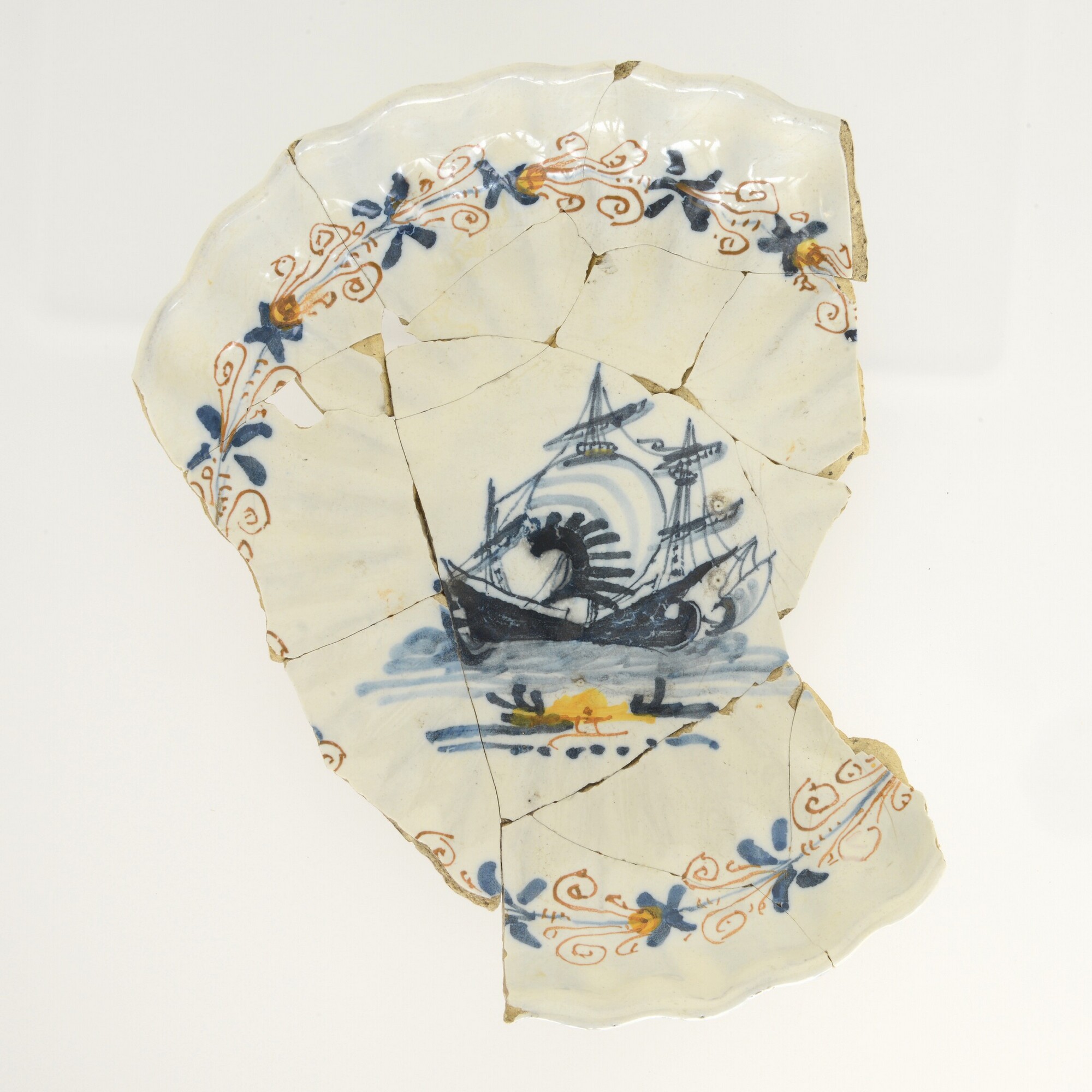 Plooischotel; i-plo-3; plooischotel met opstaande geplooide wand en rechte rand; Italiaanse faience; boven- en onderzijde tinglazuur; beschildering in blauw, geel, en oranje; spiegel: schip, vlag: aigretterand; standvoet; herkomst: Italië, Ligurië