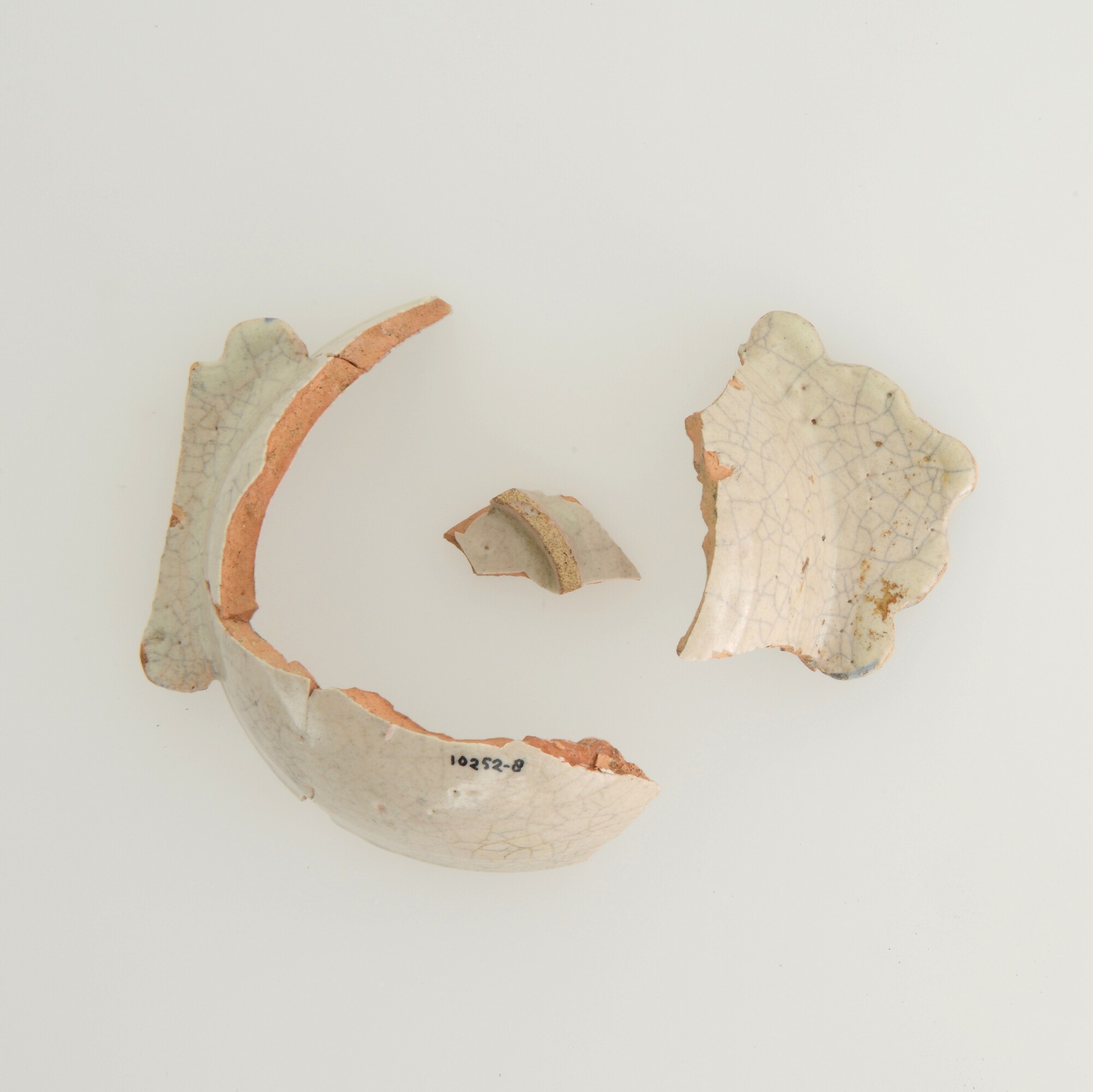 Kom; i-kom-5; kom met rechte rand; Italiaanse faience?; boven- en onderzijde tinglazuur; beschildering in blauw, geel oranje en rood; vlag: aigretterand; standring; twee vormoren (één ontbreekt); productiegebied: onbekend