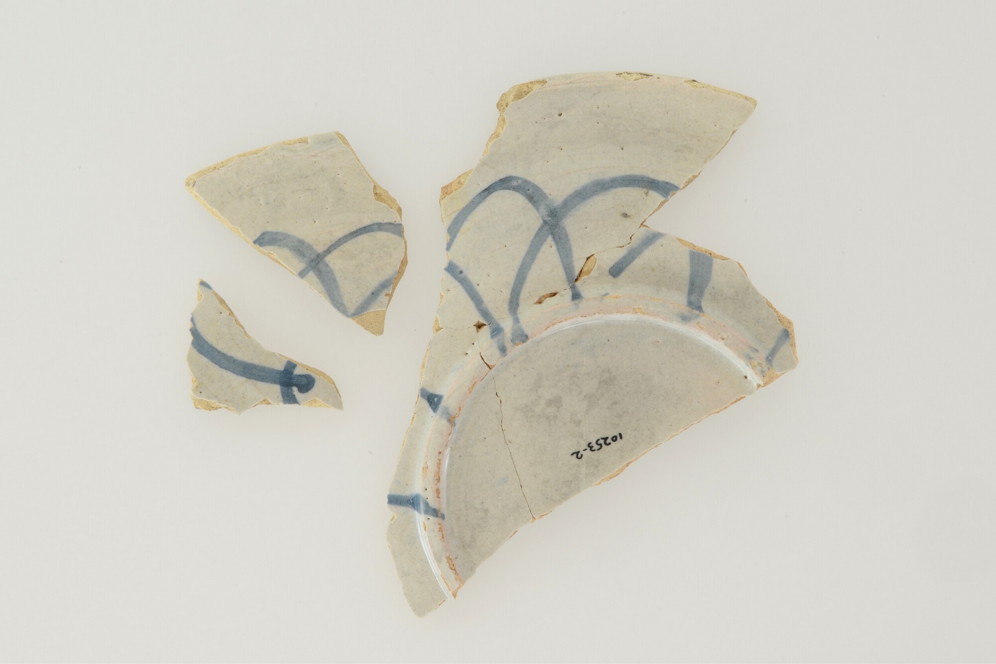 Bord; i-bor-1; bord met platte spiegel en platte vlag; Italiaanse faience; boven- en onderzijde tinglazuur; blauwe beschildering: spiegel en vlag: Ju-i-motief, onderzijde wand: kruisende bogen; standring; herkomst: Italië, Ligurië
