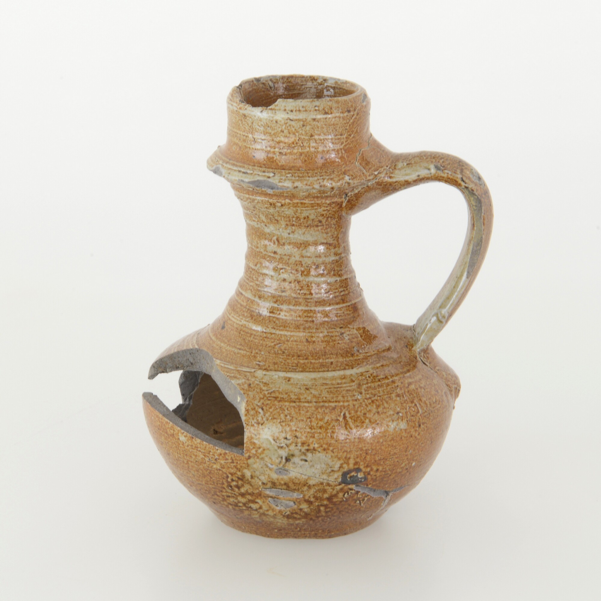 Kan; s2-kan-14; kleine bolle kan met schouder overgaand in hals, kraagrand, standvlak, verticaal lintoor; steengoed met oppervlaktebehandeling: uitwendig ijzerengobe, zoutglazuur; herkomst: Raeren, Rijnland