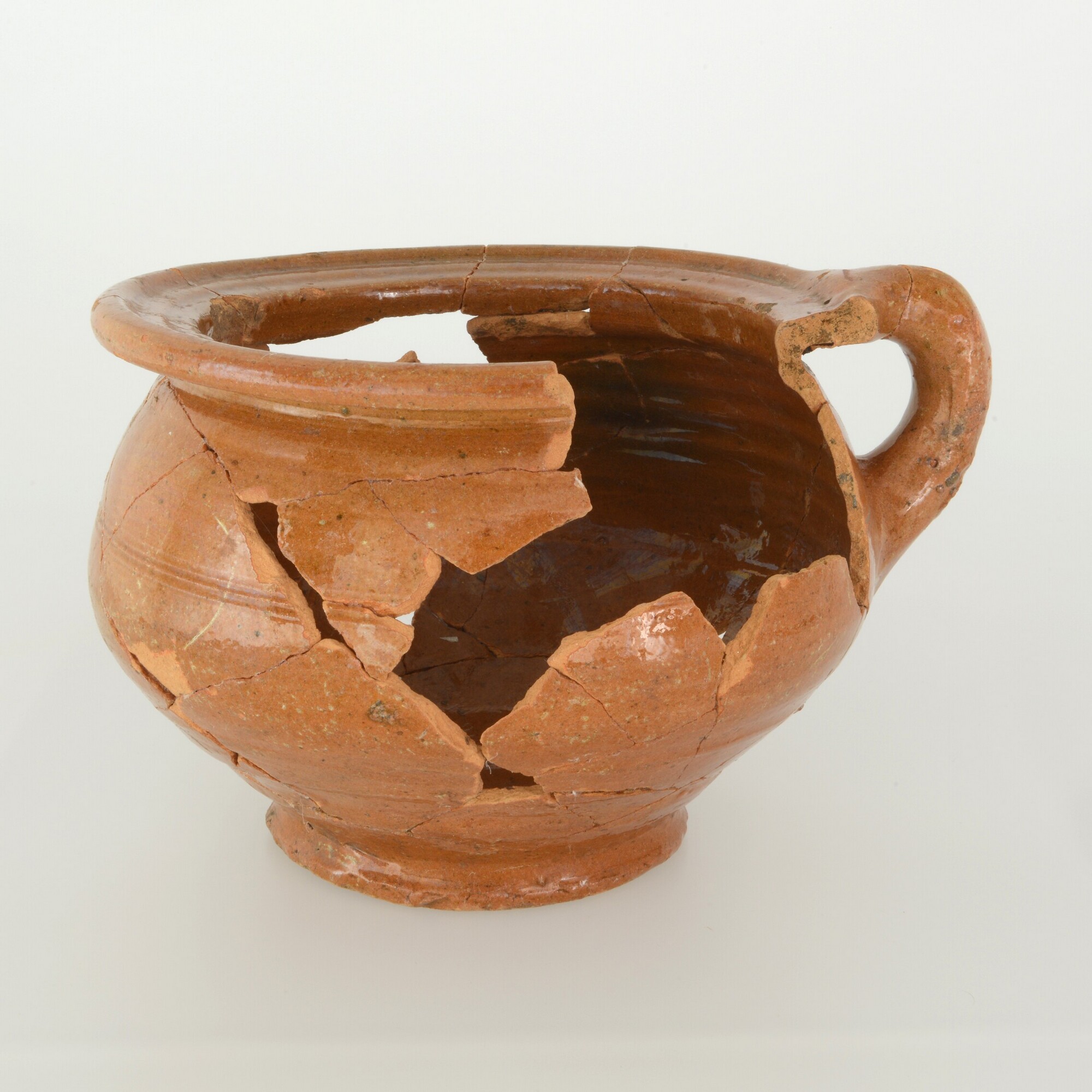 Pispot; r-pis-48; pispot met afgeronde buikknik en platte rand; roodbakkend aardewerk; in- en uitwendig loodglazuur; band met groeven op schouder; standring; één toegeknepen worstoor