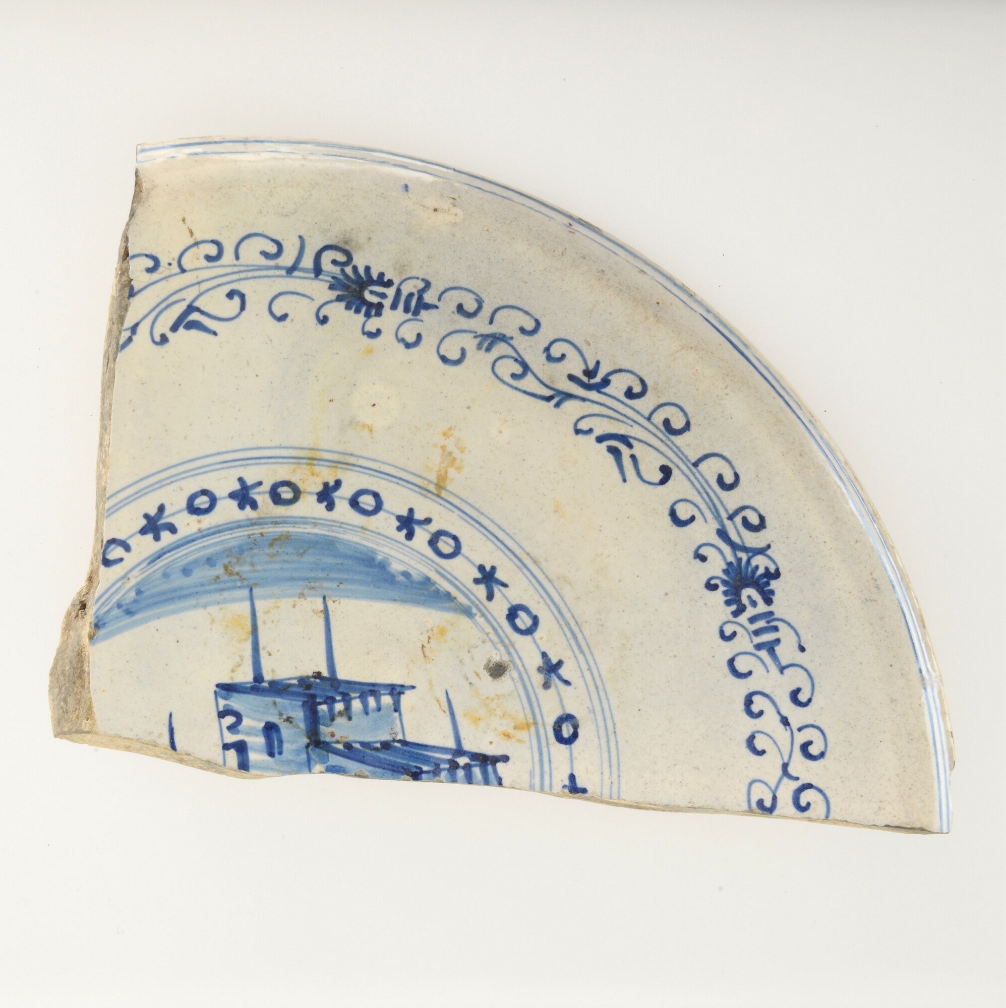 Bord; i-bor-9; Italiaans tinglazuur aardewerk; bovenzijde tinglazuur, onderzijde loodglazuur; blauwe beschildering: spiegel: huis, vlag: aigretterand; standvlak; herkomst: Montelupo, Italië