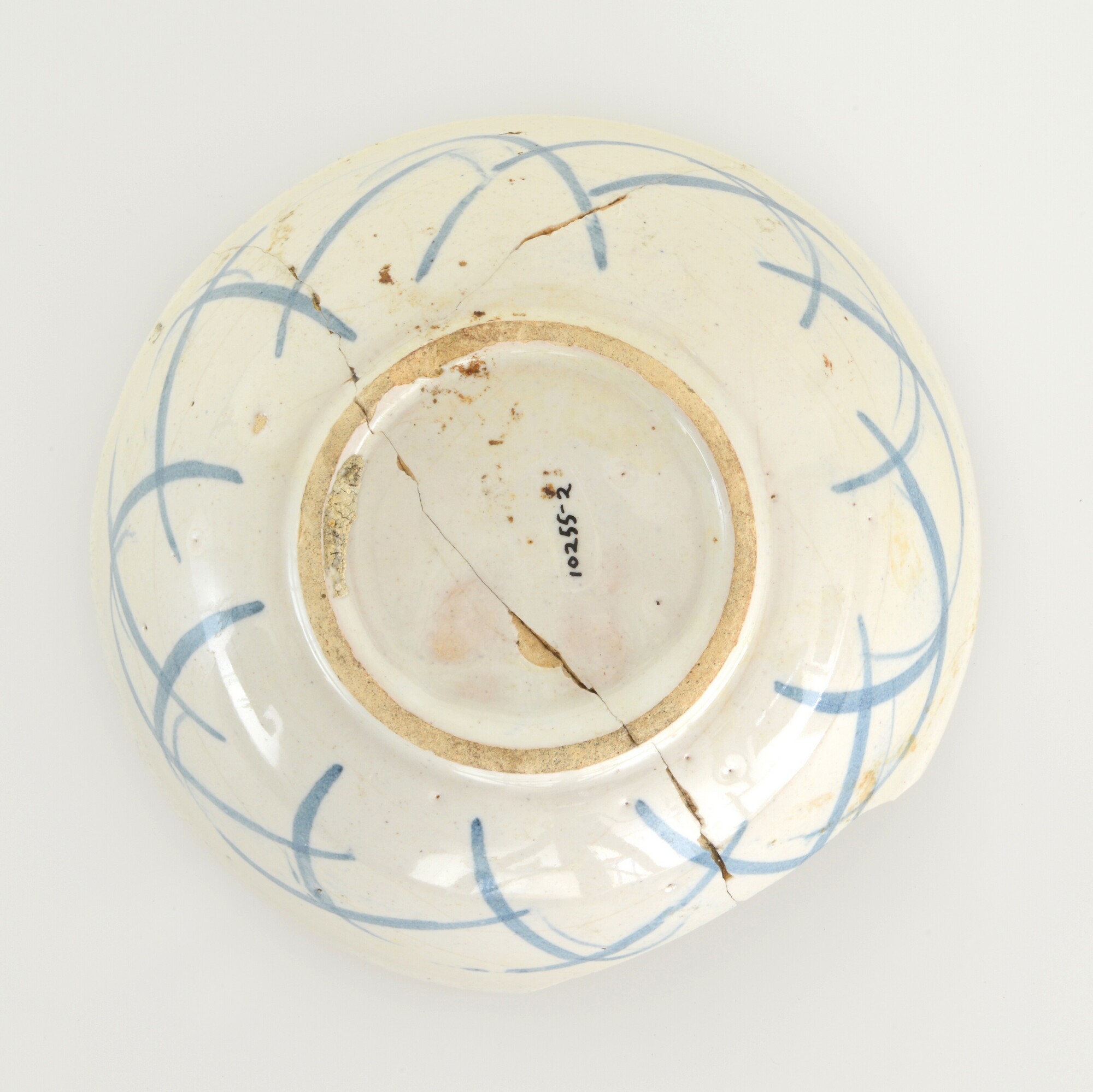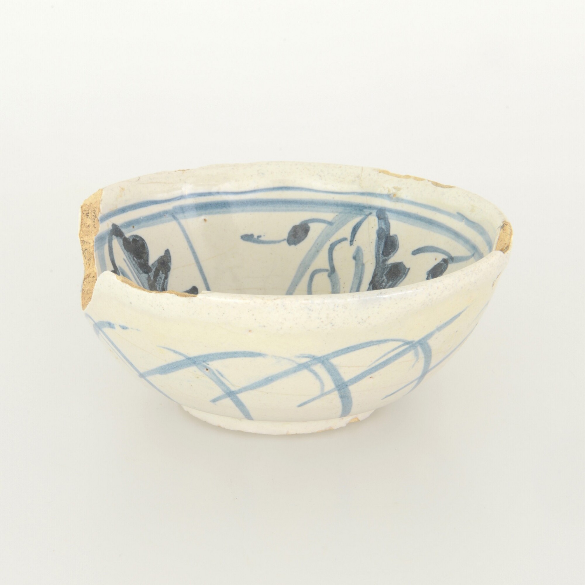 Kom; i-kom-5; kom met rechte rand; Italiaanse faience; boven- en onderzijde tinglazuur; blauwe beschildering; inwendig: bladeren, onderzijde wand: kruisende bogen; standring; herkomst: Italië, Ligurië