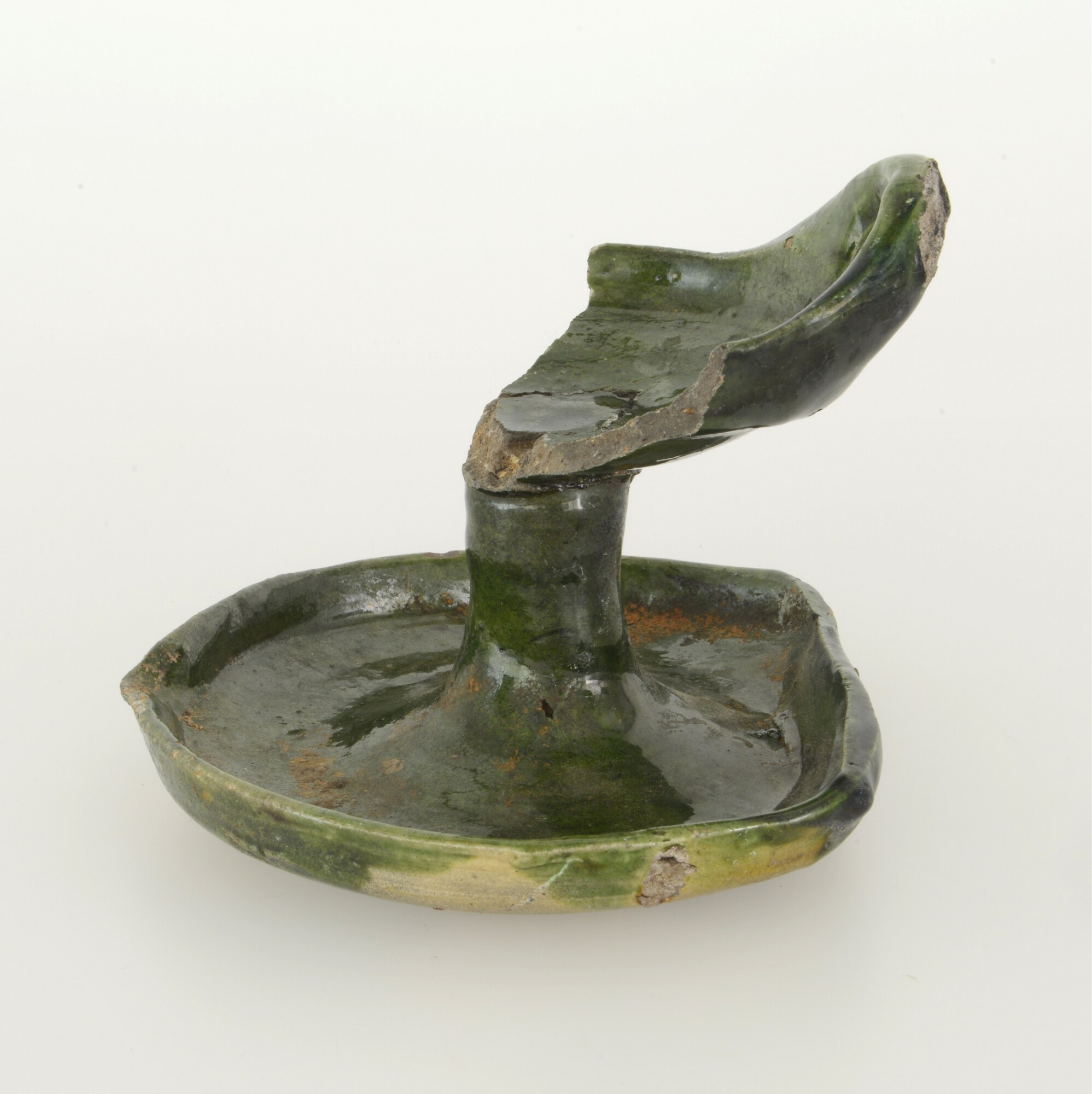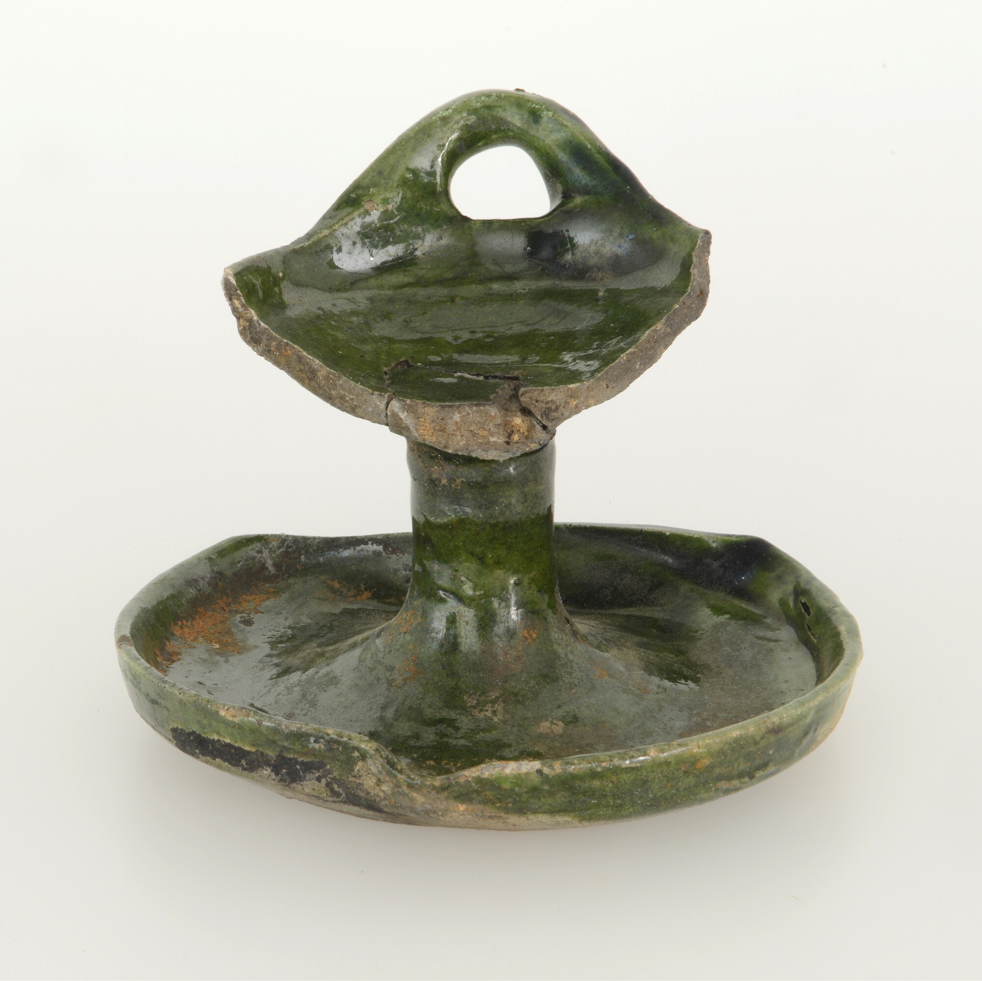 Olielamp; w-oli-2; olielamp met stam en twee schalen met geknikte rand; witbakkend aardewerk; loodglazuur met koperoxide; één opstaand worstoor