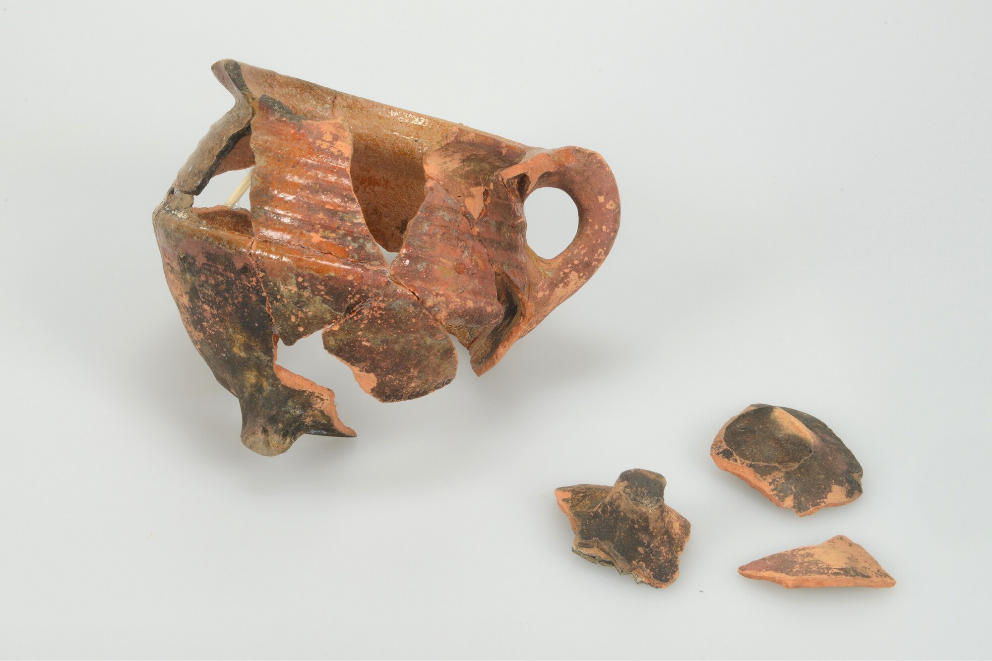 Grape; r-gra-33; grape met scherpe buikknik en uitstaande onverdikte rand; roodbakkend aardewerk; inwendig loodglazuur, uitwendig spaarzaam loodglazuur; drie poten; één worstoor; schenklip; uitwendig beroet