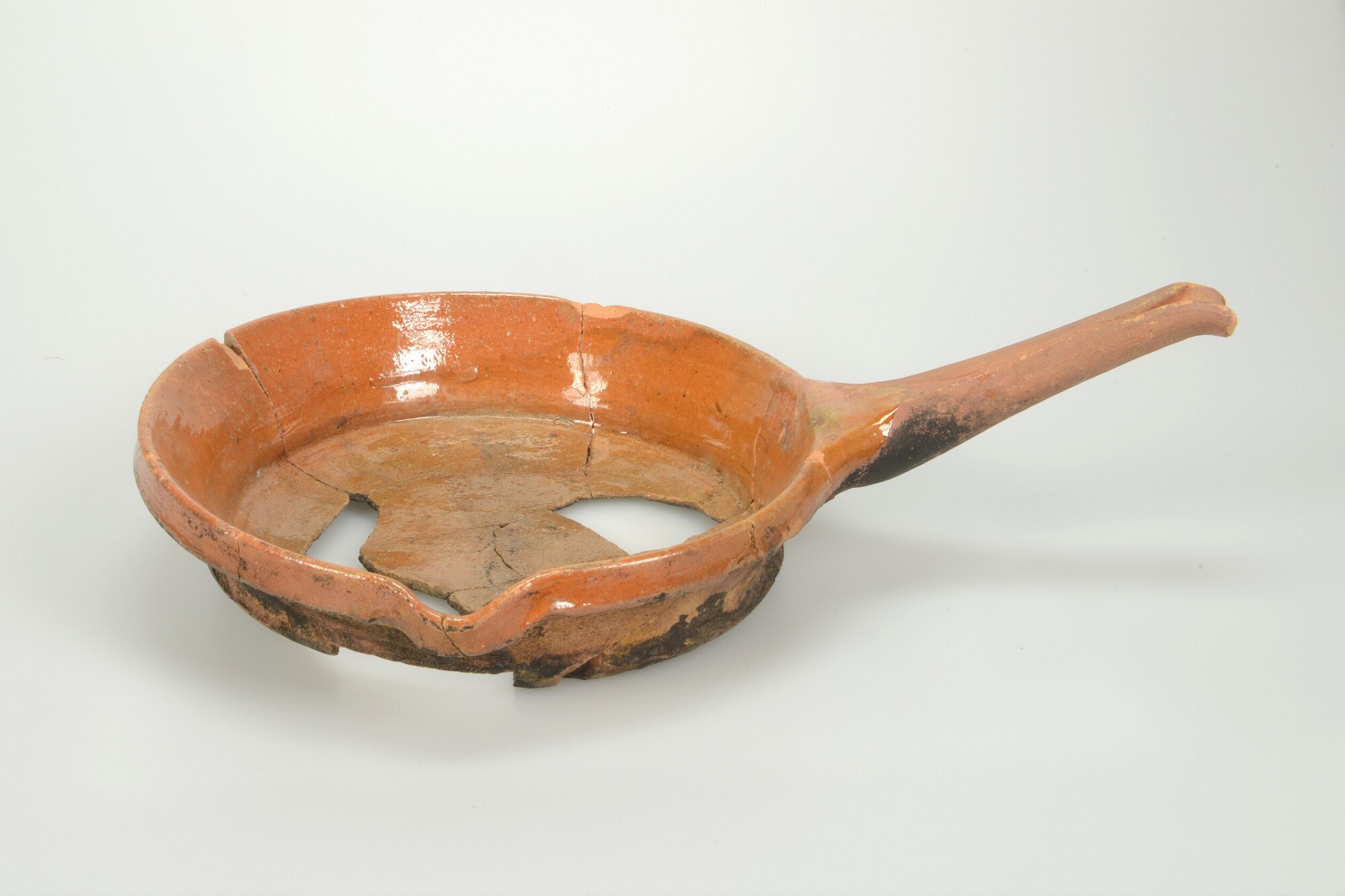 Steelpan; r-bak-4; bakpan met zijwand en kraagrand; roodbakkend aardewerk; inwendig loodglazuur; steel; schenklip; onderzijde beroet