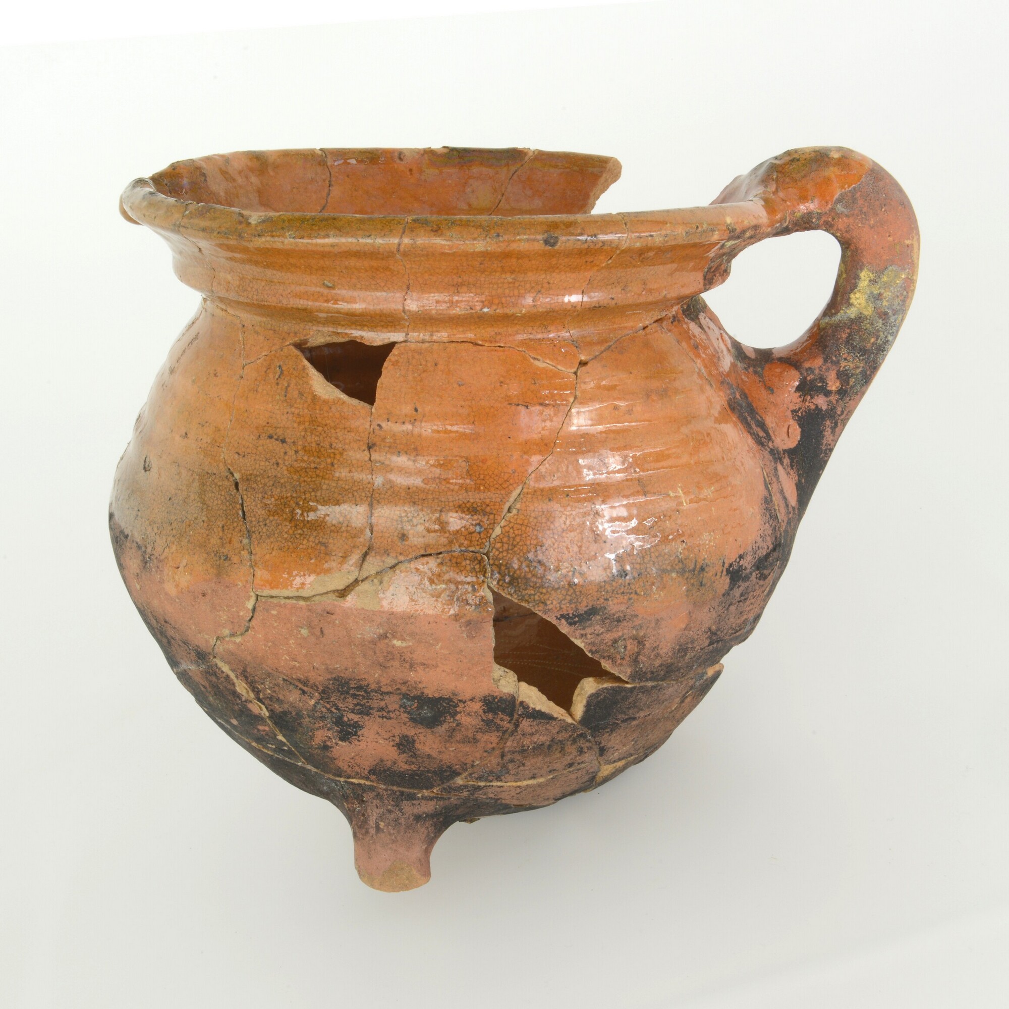 Grape; r-gra-10; grape met afgeronde buikknik en kraagrand met dekselgeul; roodbakkend aardewerk; inwendig loodglazuur, uitwendig loodglazuur op rand en schouder; drie poten; één toegeknepen worstoor; schenklip; uitwendig beroet