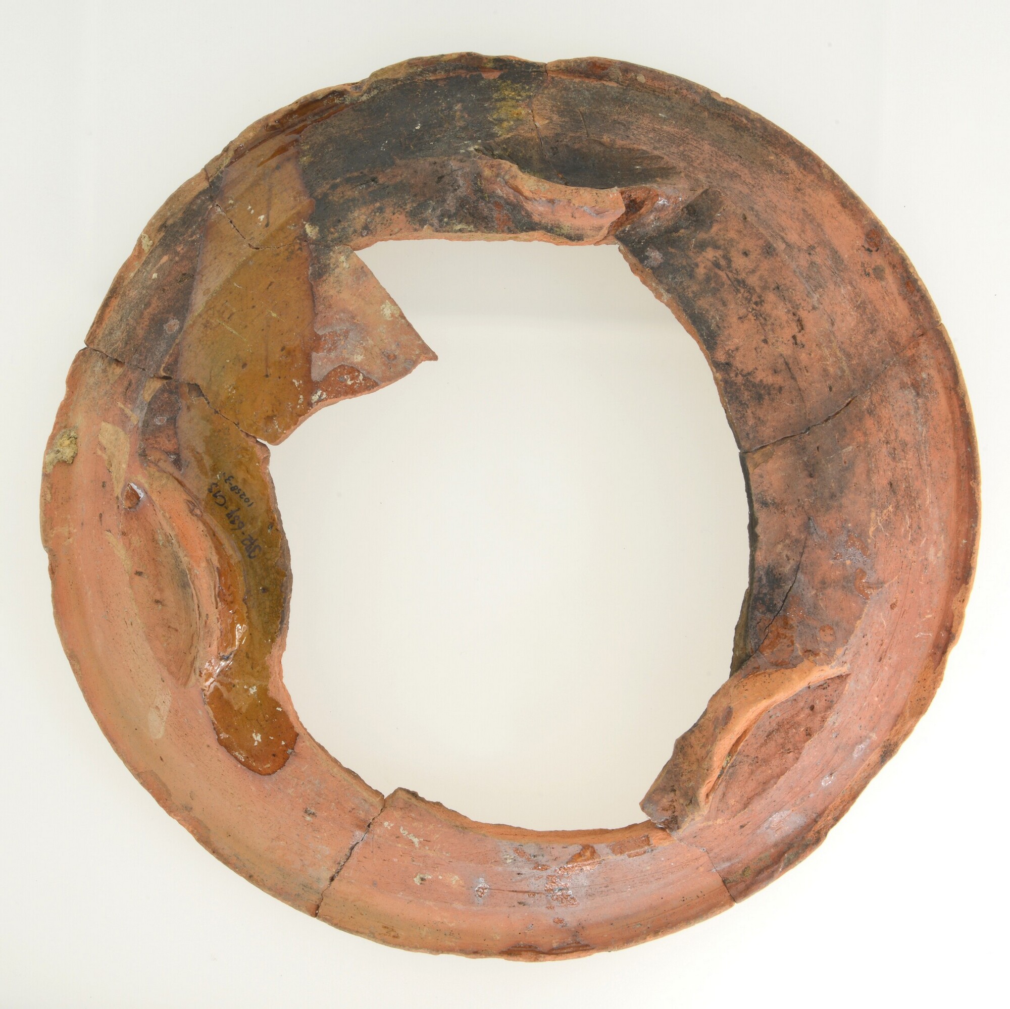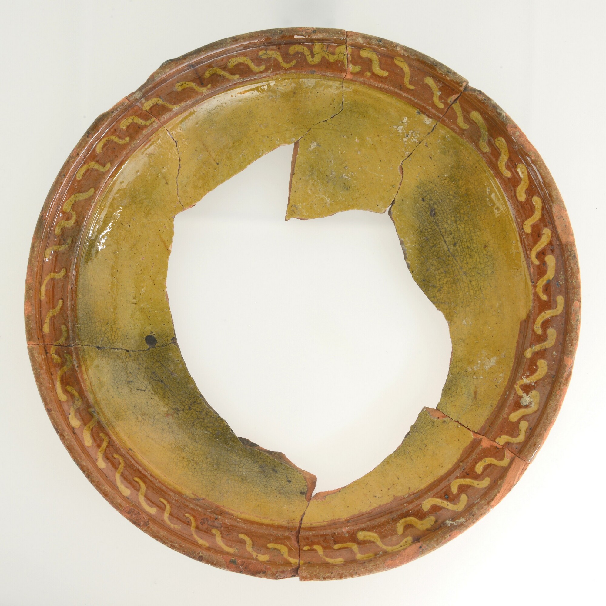 Bord; r-bor-6; bord met platte vlag; roodbakkend aardewerk; bovenzijde spiegel: witte slib en loodglazuur, vlag: loodglazuur; vlag: ringeloorboogjes in witte slib; drie standlobben