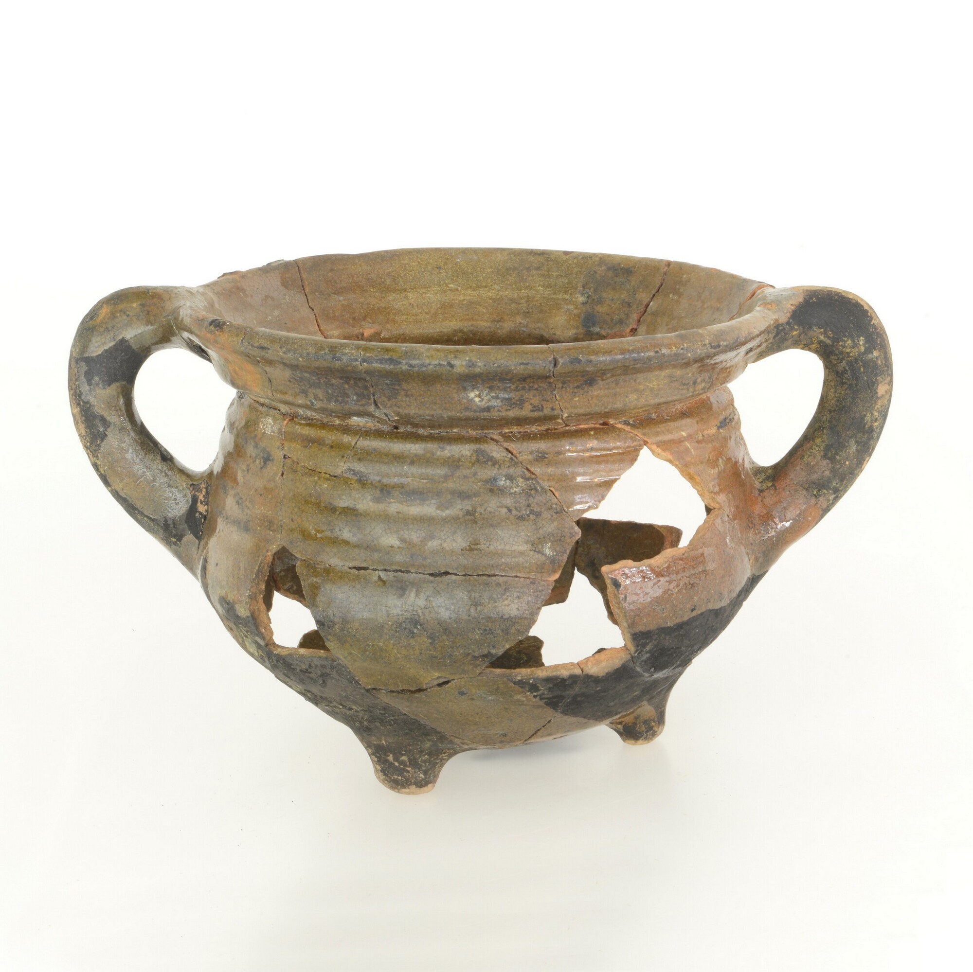 Grape; r-gra-10; grape met afgeronde buikknik en kraagrand met dekselgeul; roodbakkend aardewerk; inwendig loodglazuur, uitwendig loodglazuur op rand en schouder; drie poten; twee worstoren