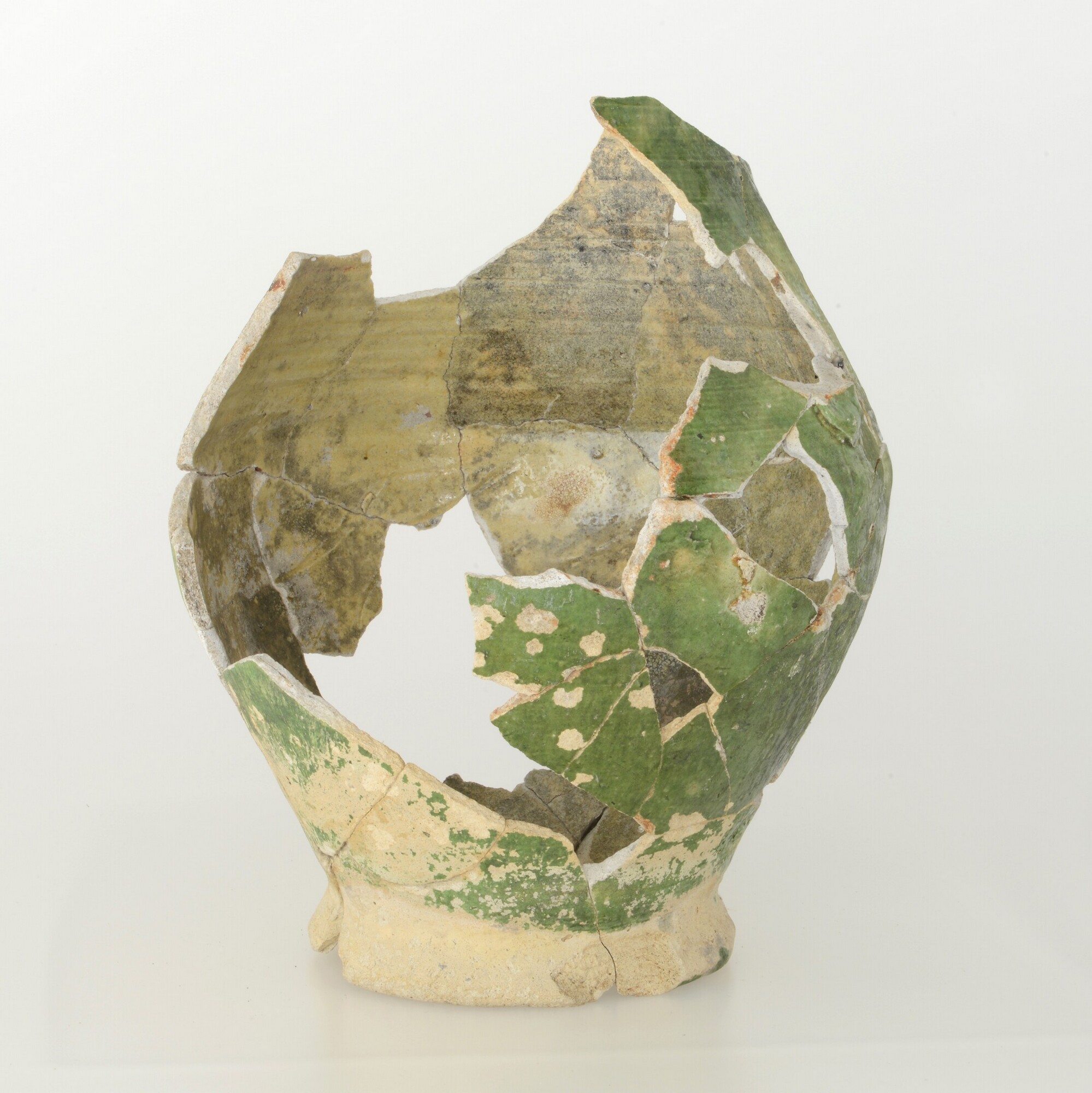 Kan; w-kan; witbakkend aardewerk; in- en uitwendig loodglazuur met koperoxide; standring; verticaal oor (ontbreekt)