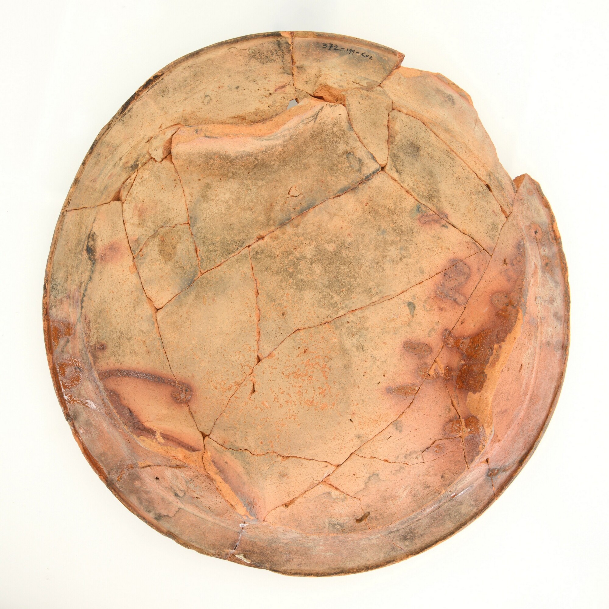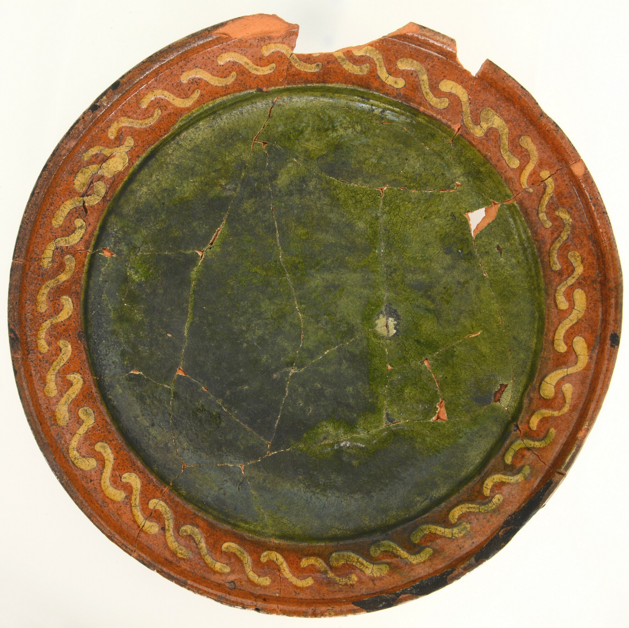 Bord; r-bor-6; bord met holle spiegel en platte vlag met van buiten aangedrukte rand; roodbakkend aardewerk; inwendig loodglazuur en koperoxide; vlag: ringeloorboogjes; drie voetlobben