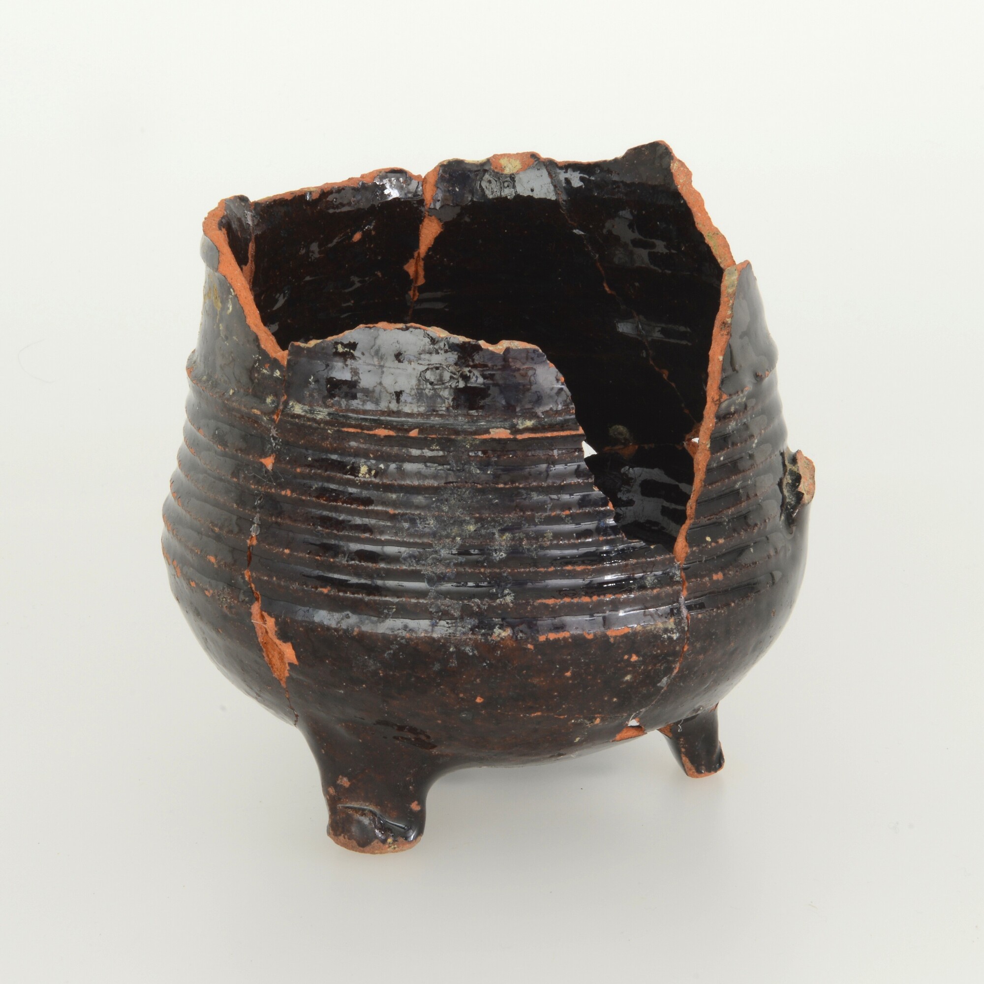 Grape; r-gra-; roodbakkend aardewerk; loodglazuur met mangaanoxide; drie poten; één lintoor (ontbreekt)