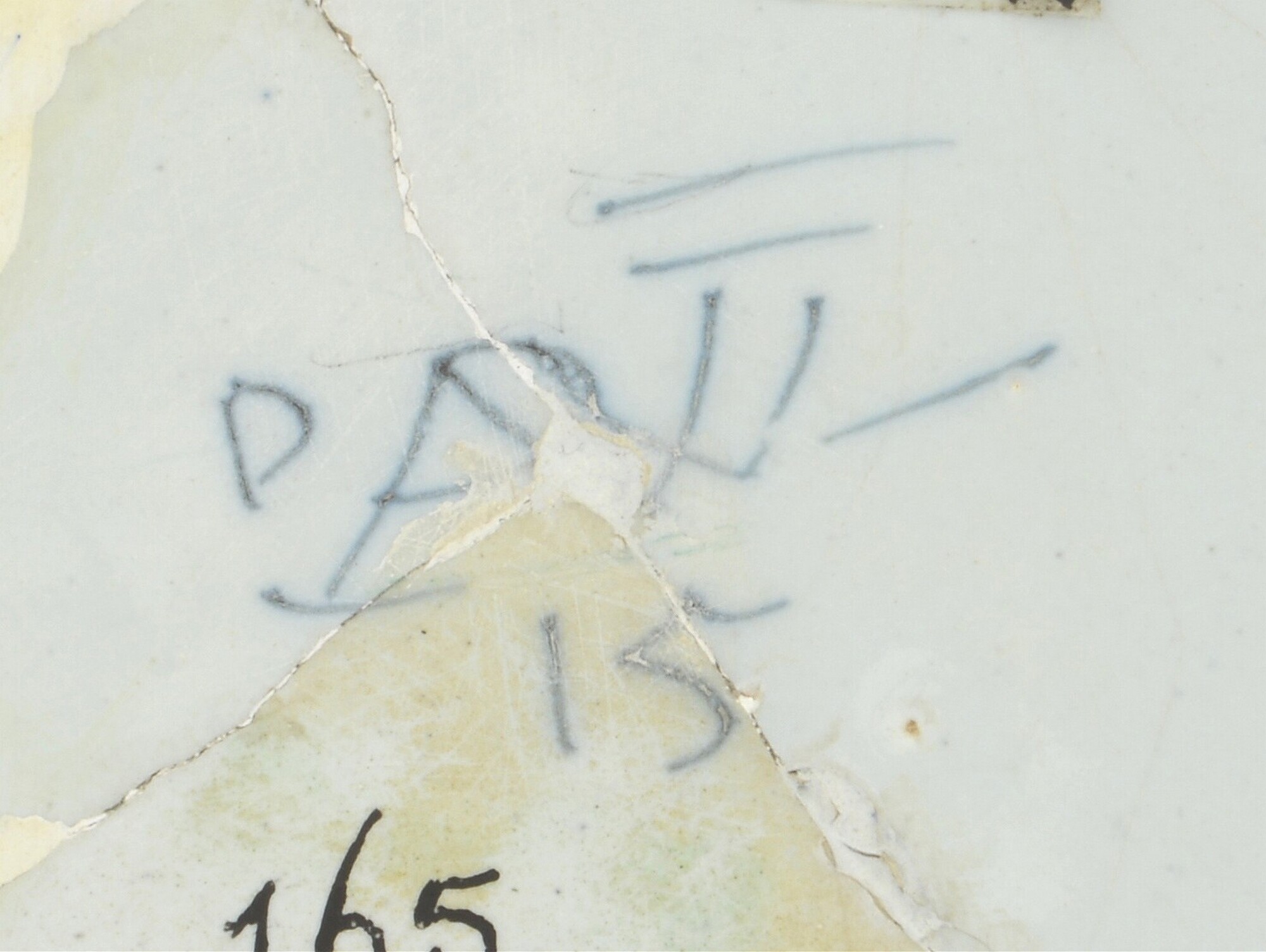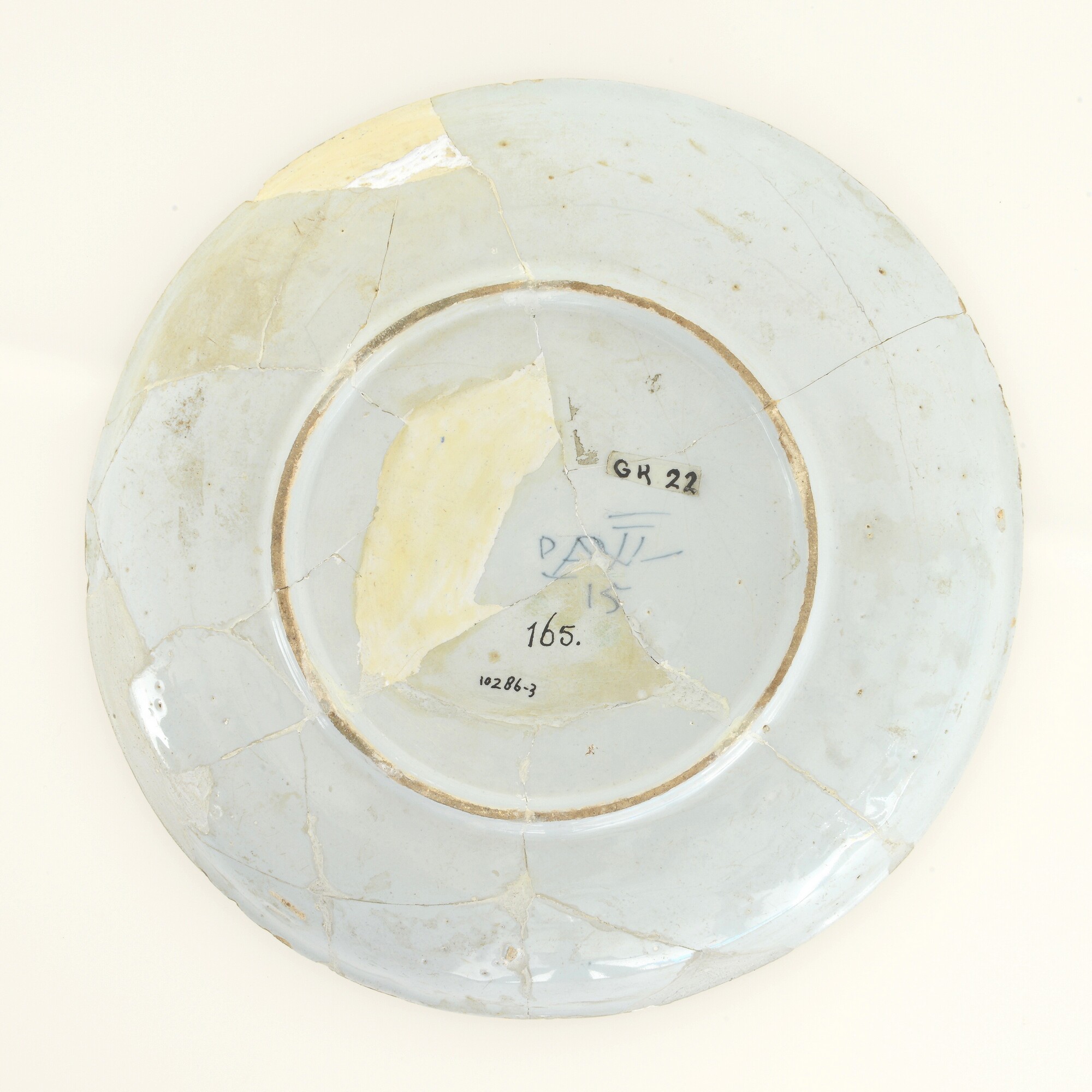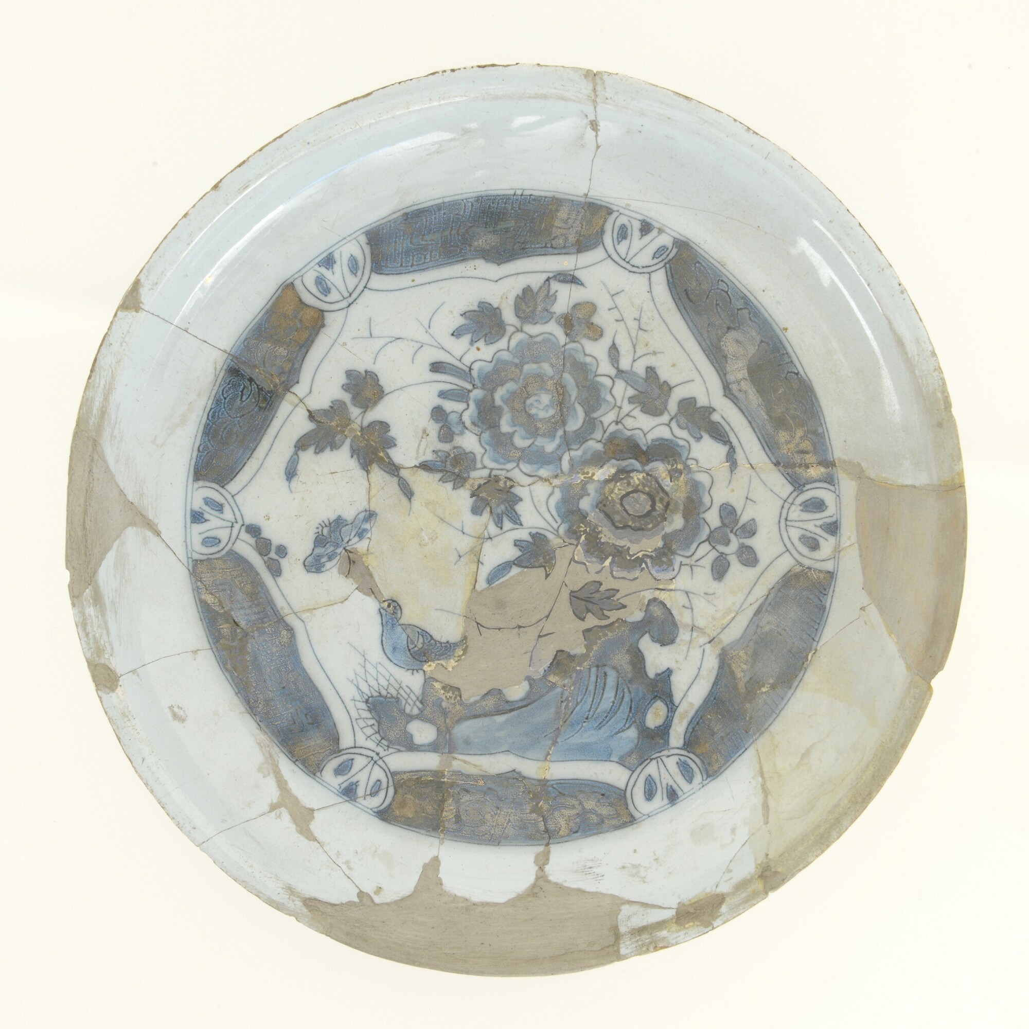Bord; f-bor-8; diep afgerond bord met rechte rand; faience; tinglazuur; blauw, sp: vogel en bloemen; standring; merk: DPAW_15; productieplaats: plateelbakkerij de Paauw, Delft