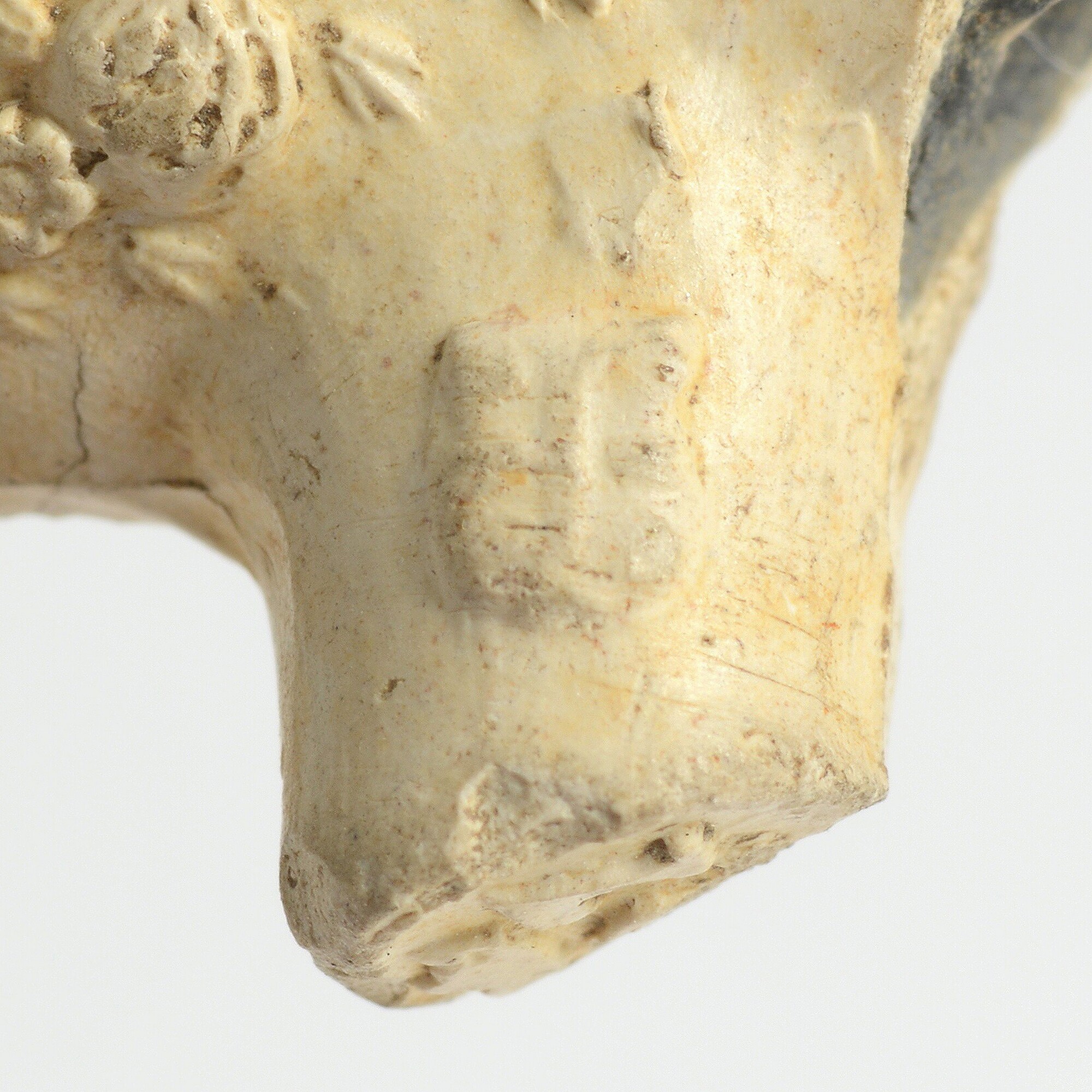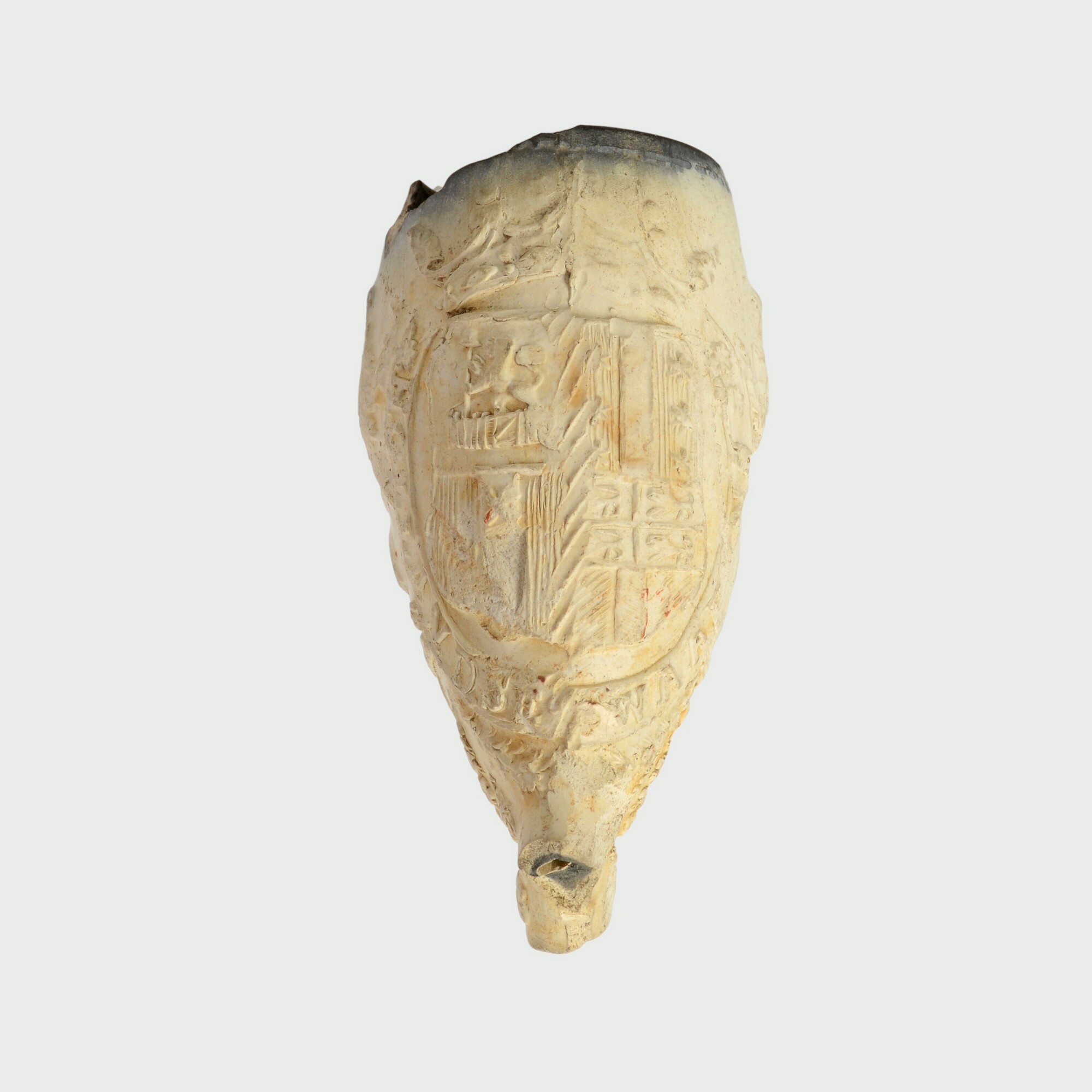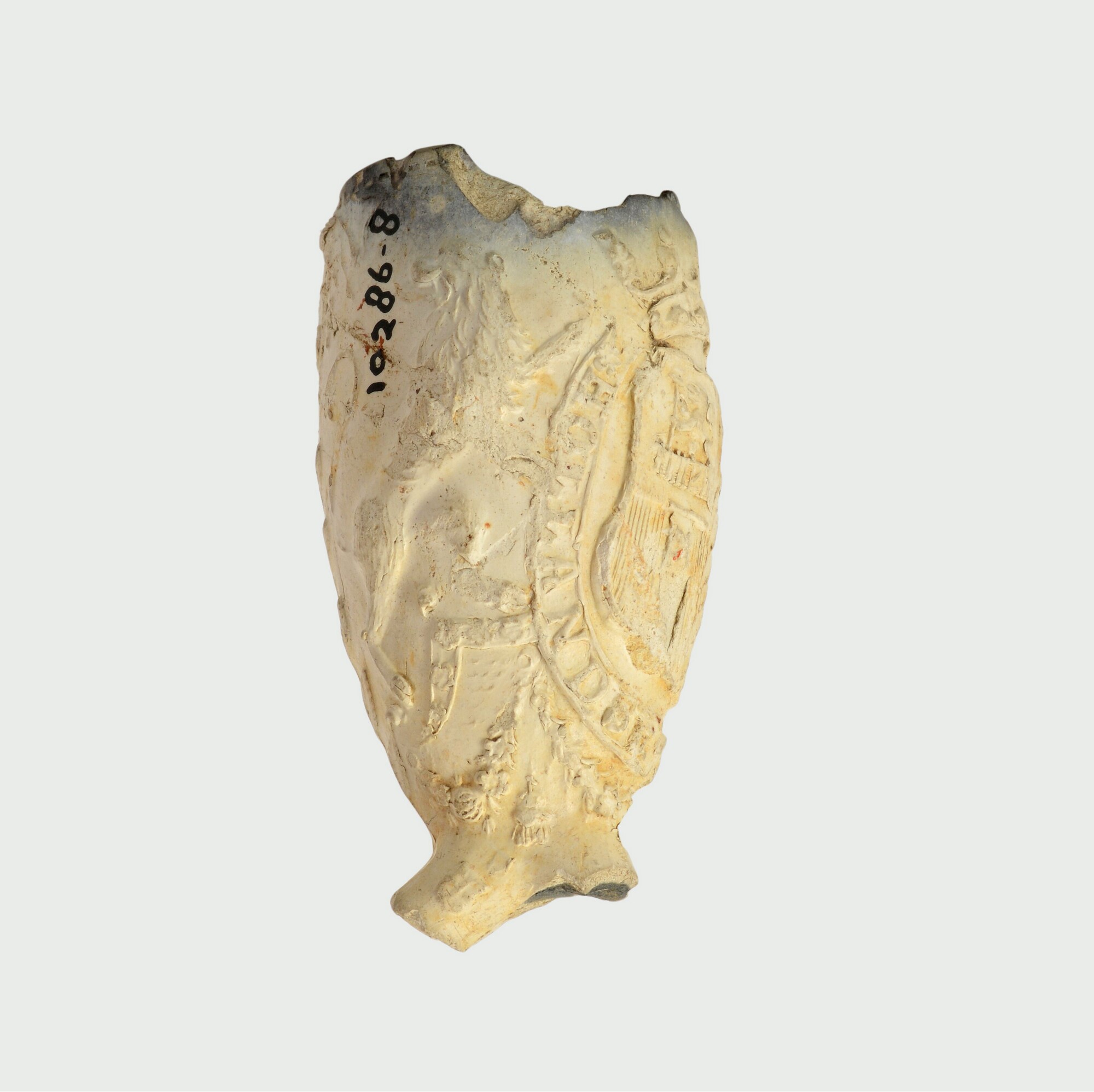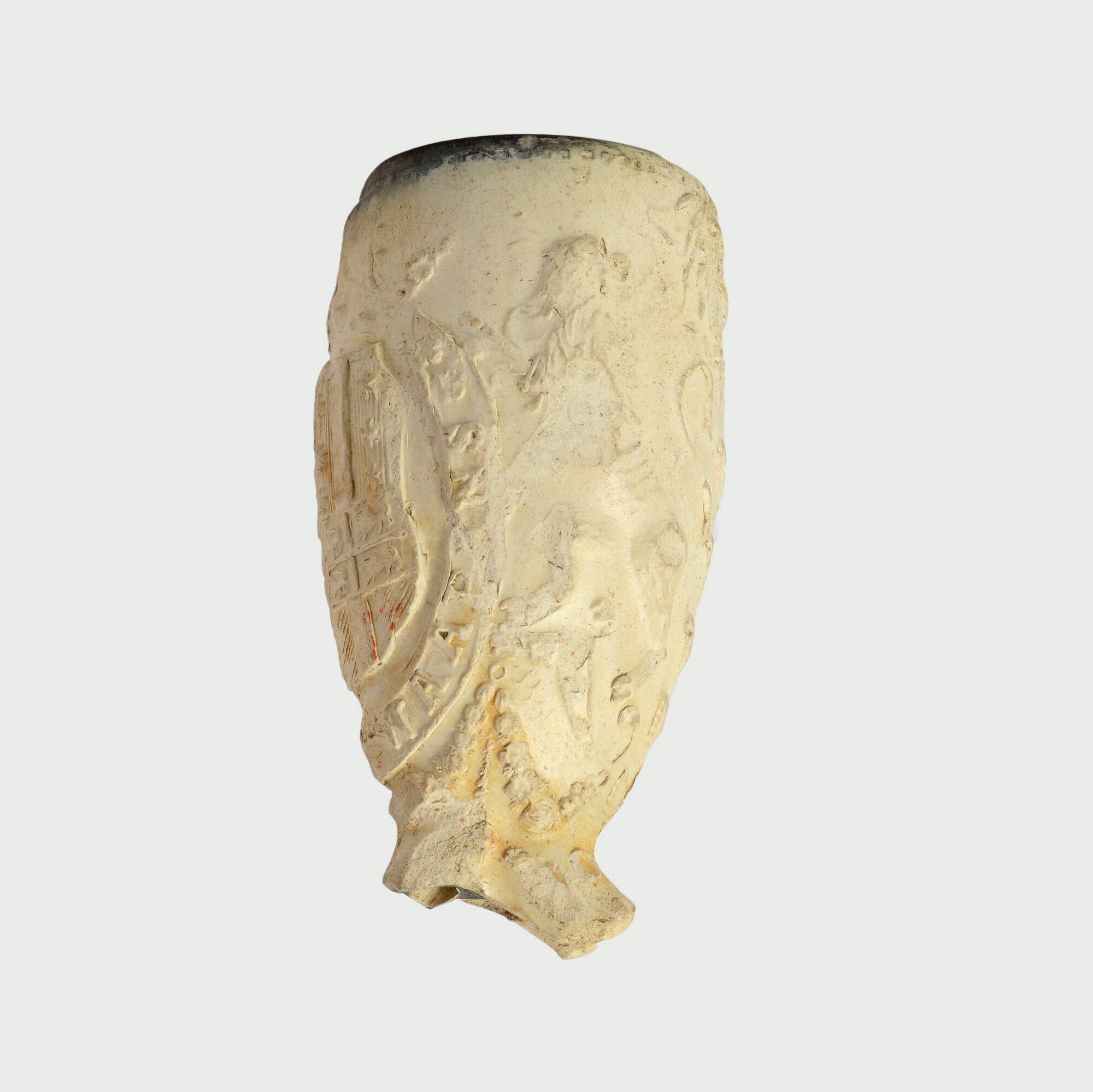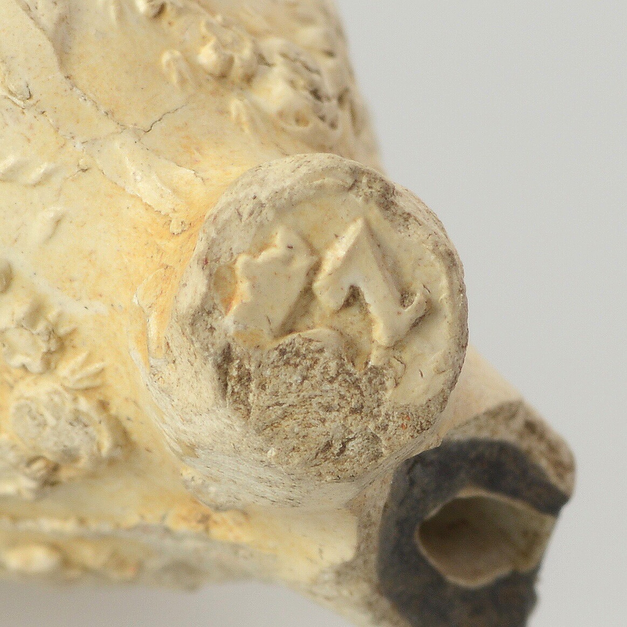 Pijpenkop; ovoïde reliëfpijp; met afbeelding gekroond wapenschild met vier kwartieren die wordt gehouden door twee staande leeuwen. Het gevierendeelde wapenschild bestaat uit: de leeuw in de Hollandse tuin, wapen van Gouda, wapen van Amsterdam en het wapen van Rotterdam. Randschrift rondom dit wapenschild: 'HOLLANDSE WAAPENS'. Op achterzijde in reliëf waarschijnlijk het merk gekroonde 27. Herkomst: ...
