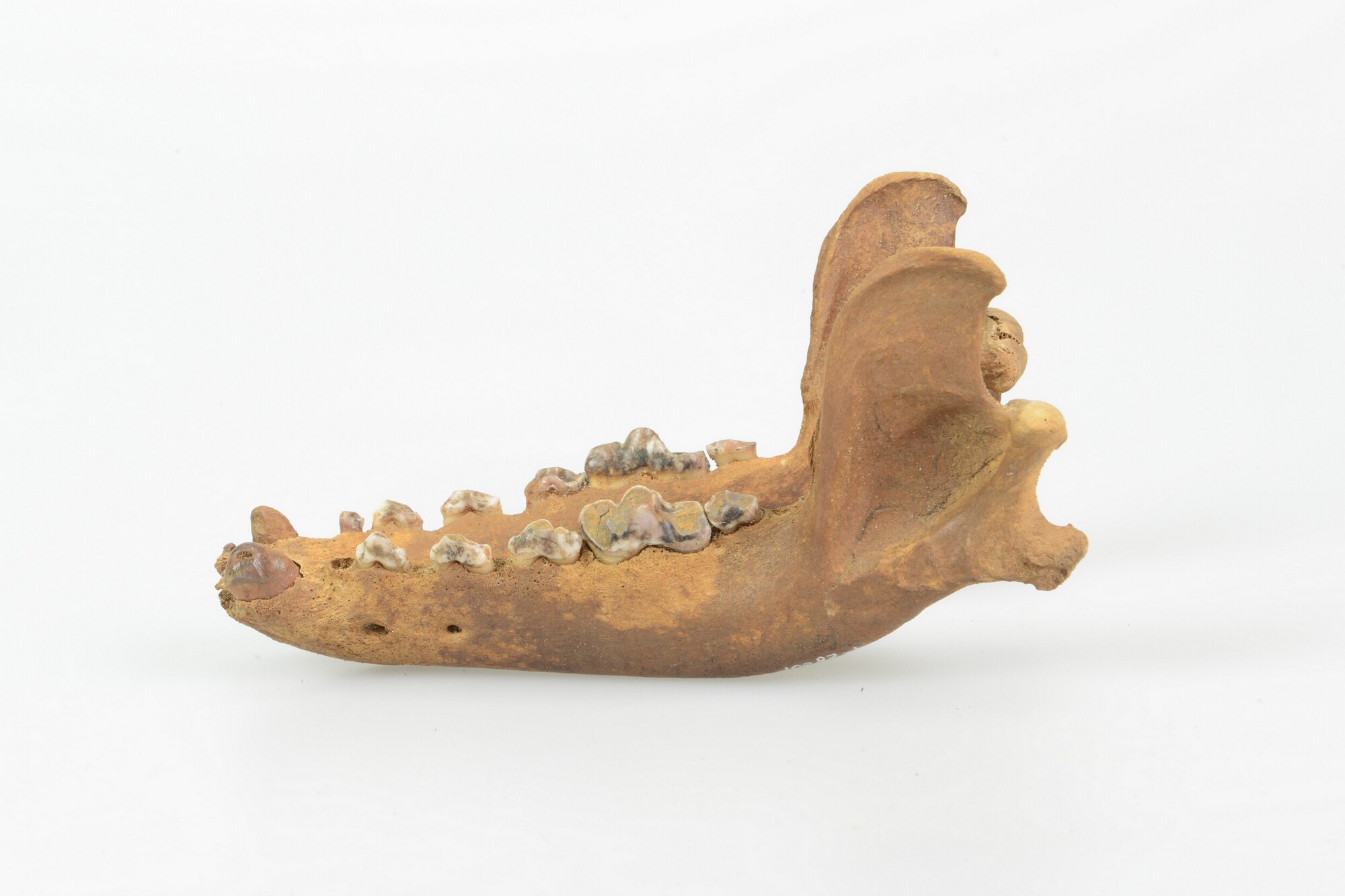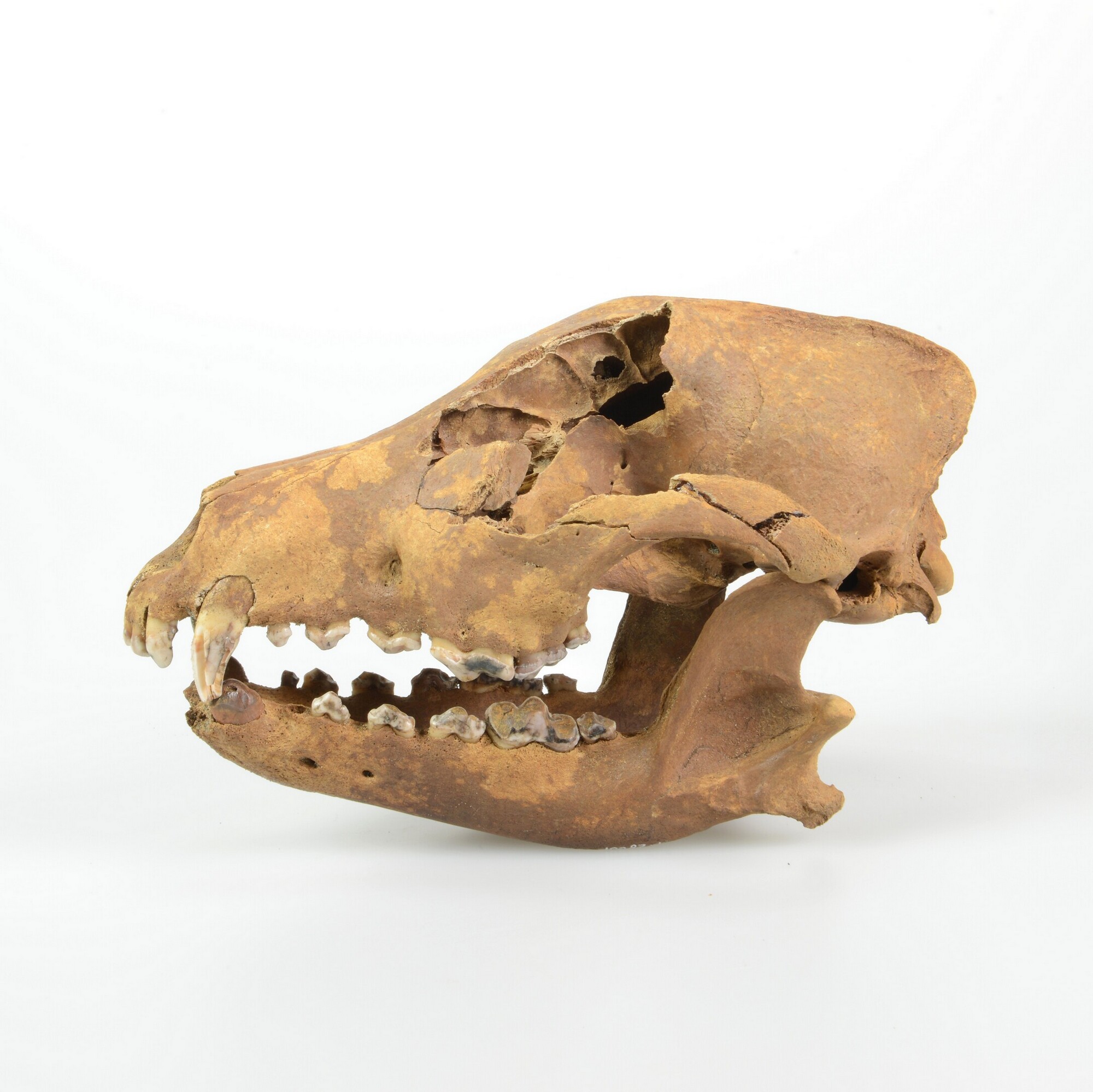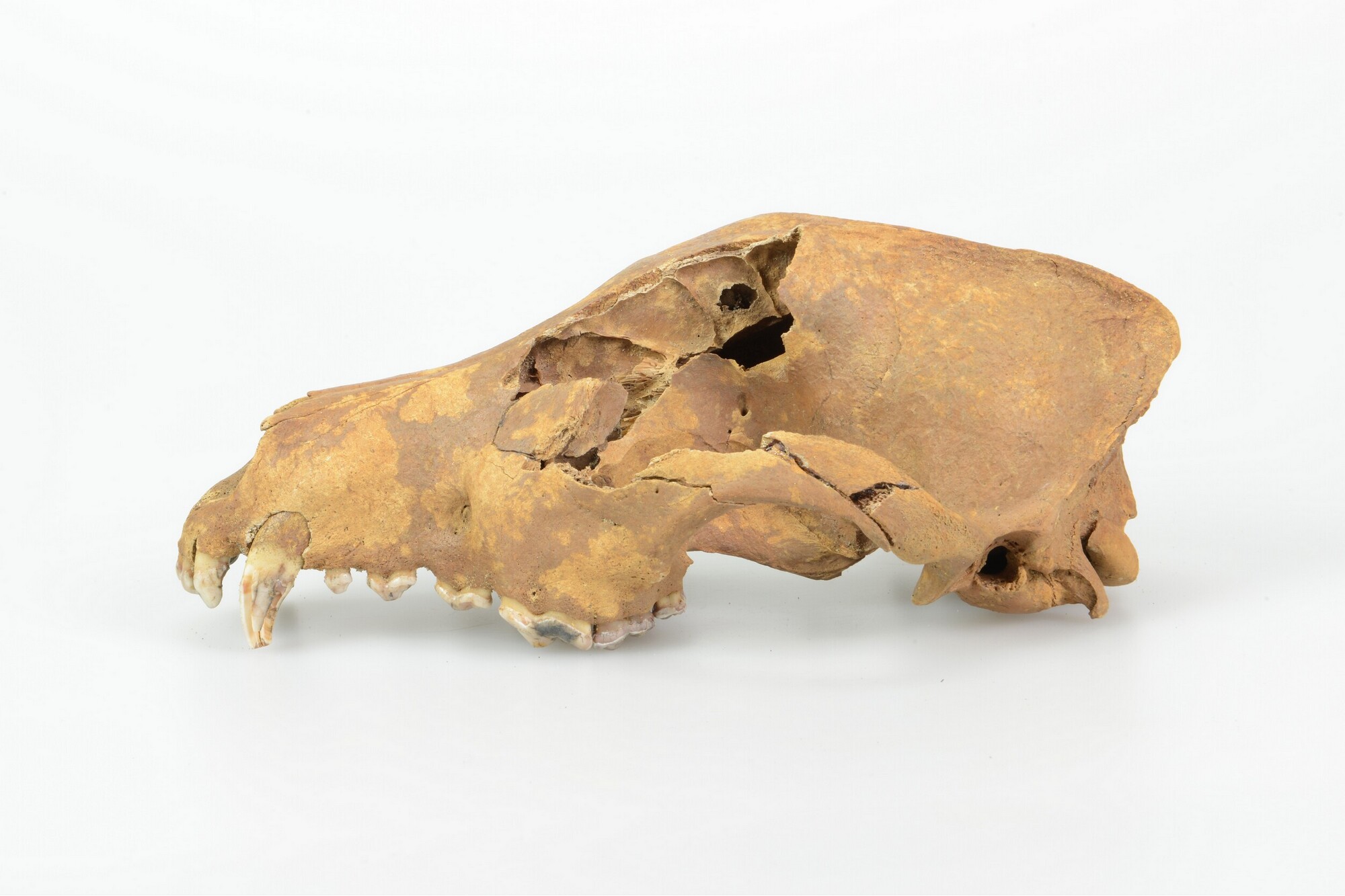 Hondenskelet van een 10-12 jaar oude hond; schofthoogte 57 cm; sterk versleten kiezen; linker- en rechterzijde van de schedel vertonen trauma's, waarvan het onduidelijk is of deze post danwel ante mortem zijn ontstaan.