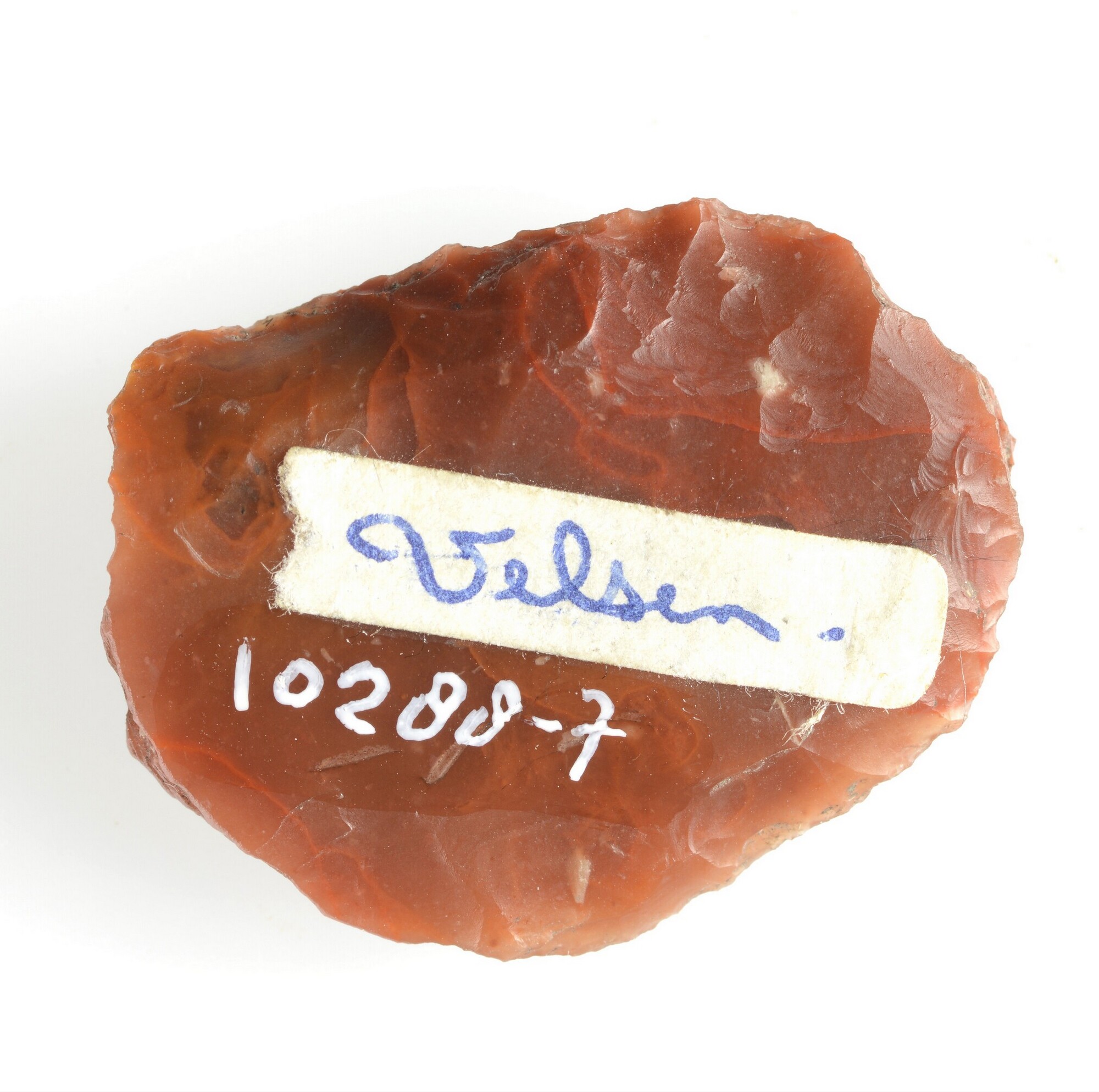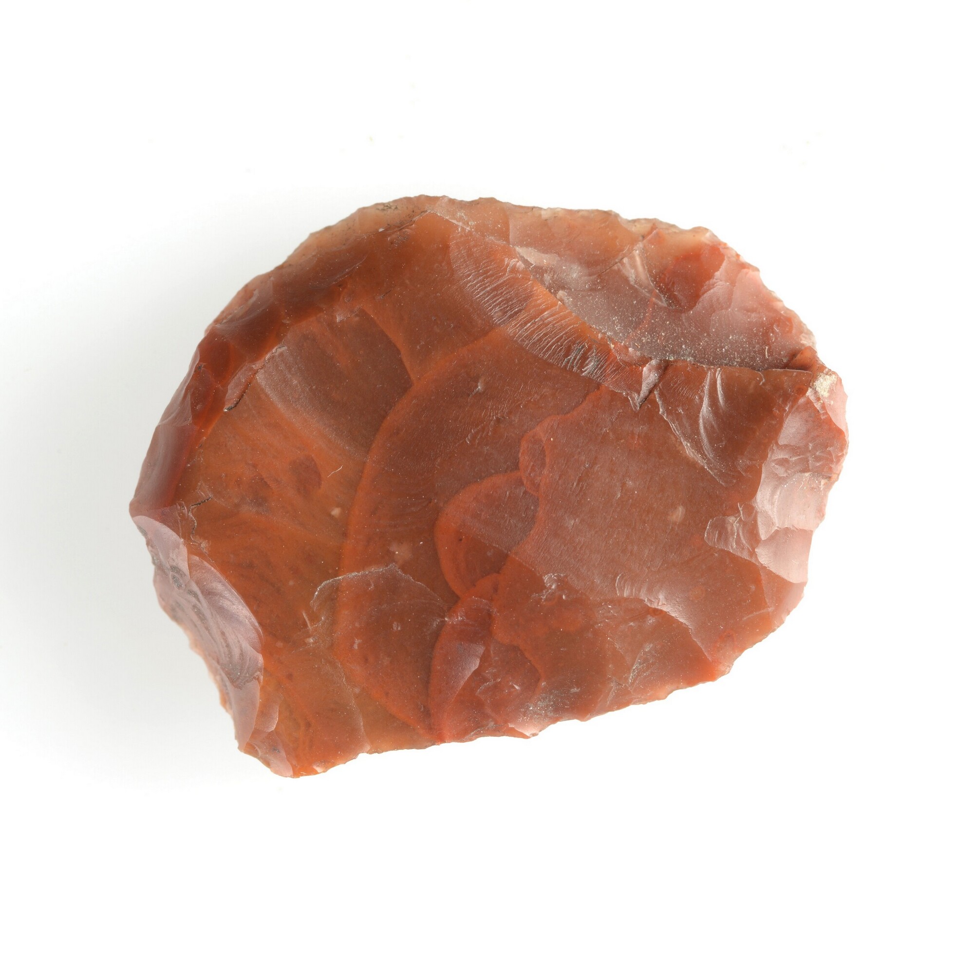 Schrabber; rood vuursteen; geretoucheerd; waarschijnlijk een fragment van een dolk of sikkel; herkomst: Helgoland