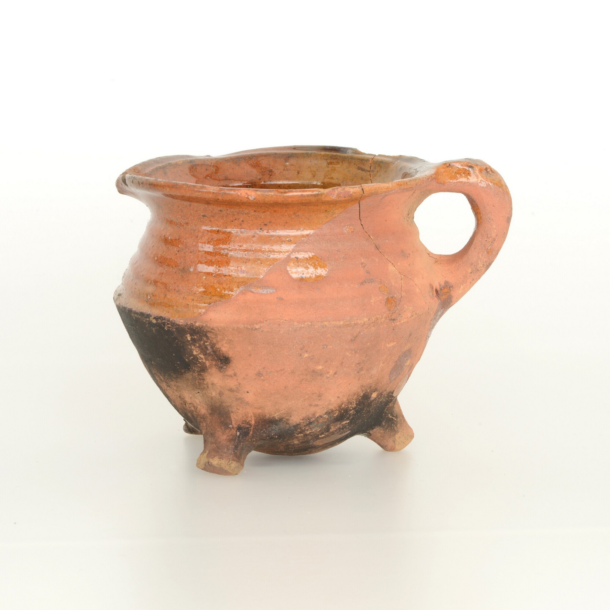 Grape; r-gra-33; grape met scherpe buikknik en iets uitgebogen rand; roodbakkend aardewerk; inwendig loodglazuur en uitwendig spaarzaam loodglazuur; drie poten; verticaal worstoor; schenklip; uitwendig beroet