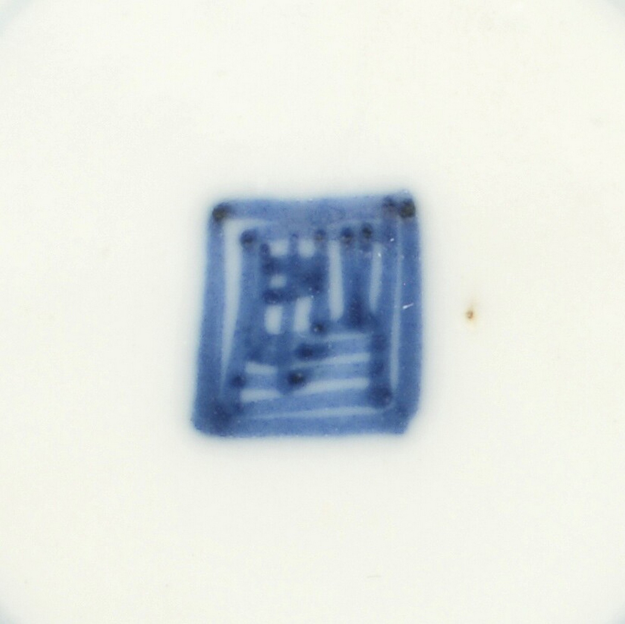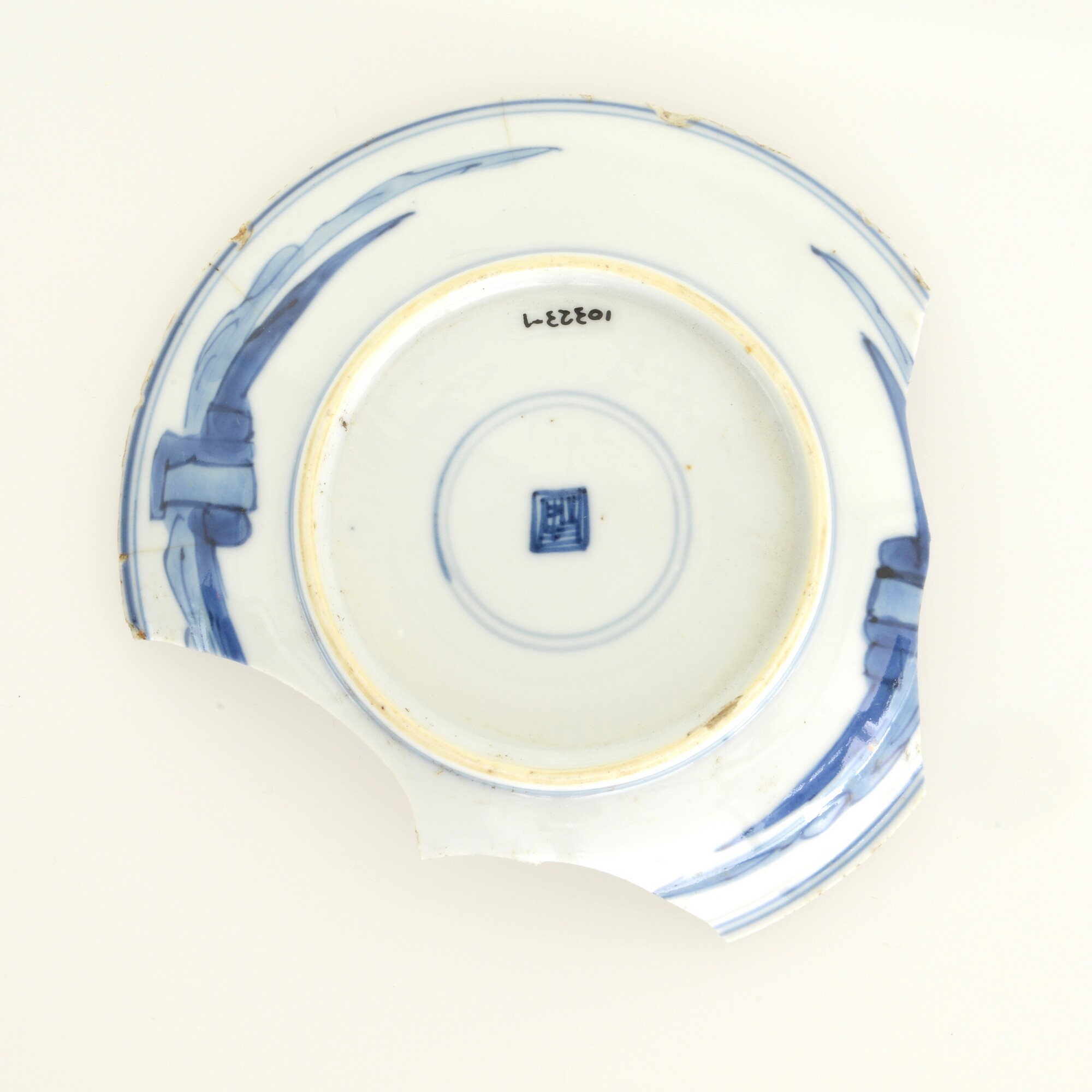 Bord; p-bor-1; klein diep bord zonder vlag met uitgebogen rand; veldspaatglazuur, onderglazuur blauw; inw.: figuur aan het meer, uitw.: landschap; standring; zegelmerk; herkomst: China