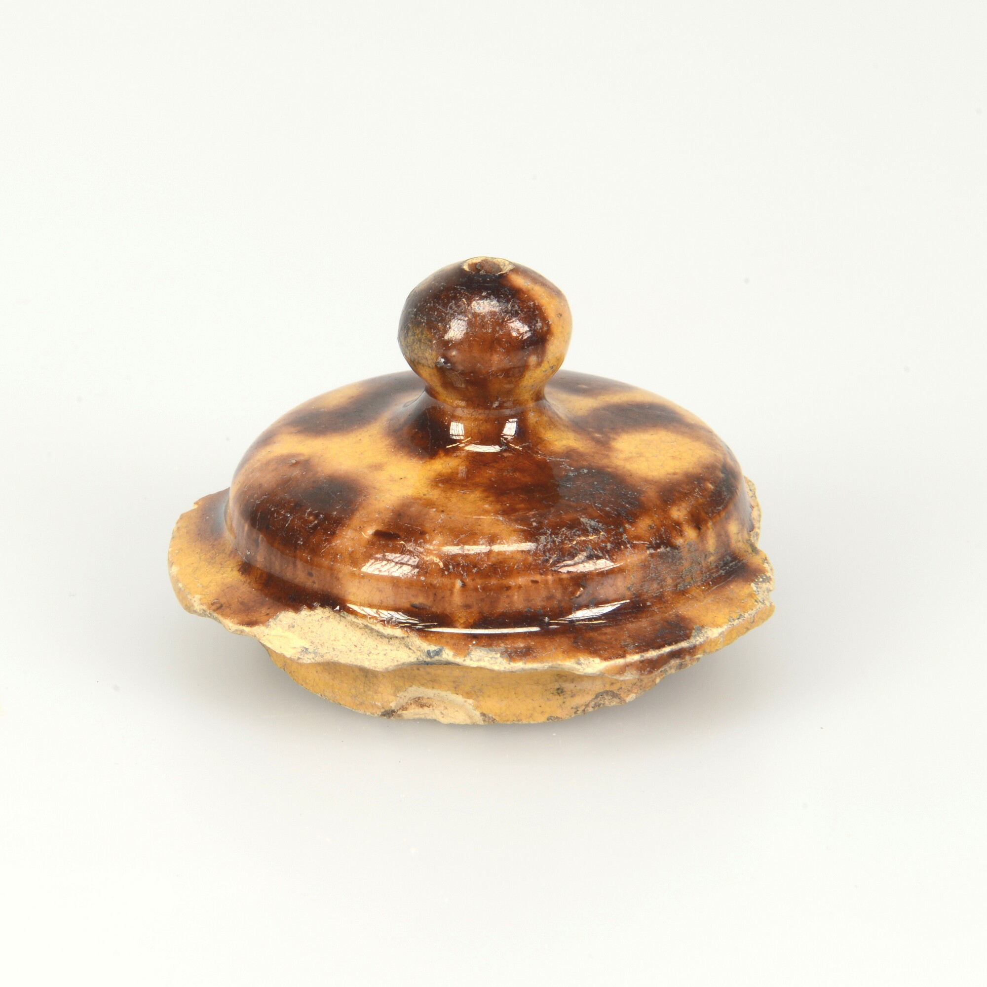 Deksel; w-dek-; witbakkend aardewerk; loodglazuur, mangaan; bruine stippen; stoomgat; vlekkengoed