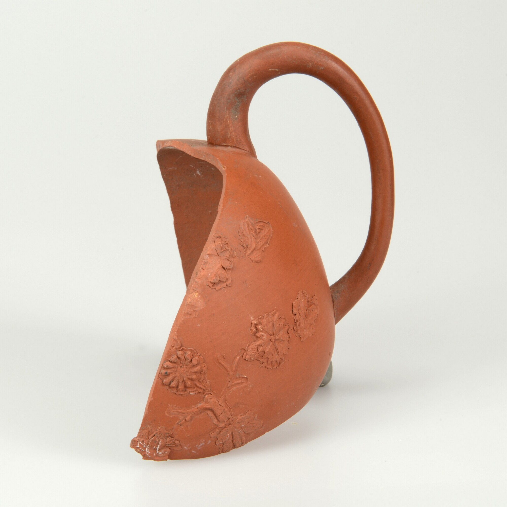 Theepot; ir-the-5; peervormige theepot zonder rand; Aziatisch rood steengoed; één verticaal worstoor; florale appliques; herkomst: Yixing, China