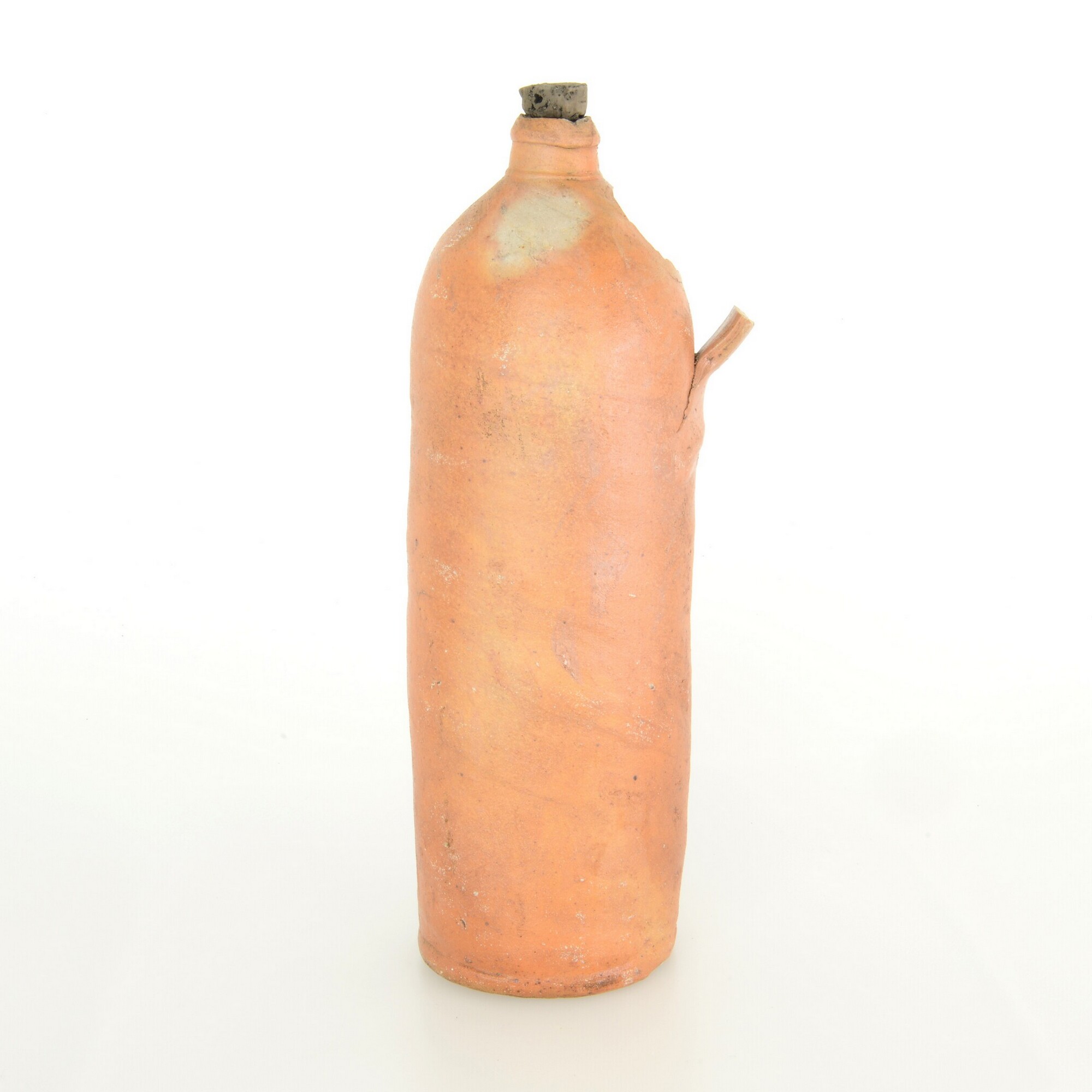 Mineraalwaterfles; s2-fle-4; cilindrische fles met afgeronde schouder, korte cilindrische nek met verdikte lip; verticaal lintoor (ontbreekt); holle bodem; herkomst: Westerwald; kurk aanwezig