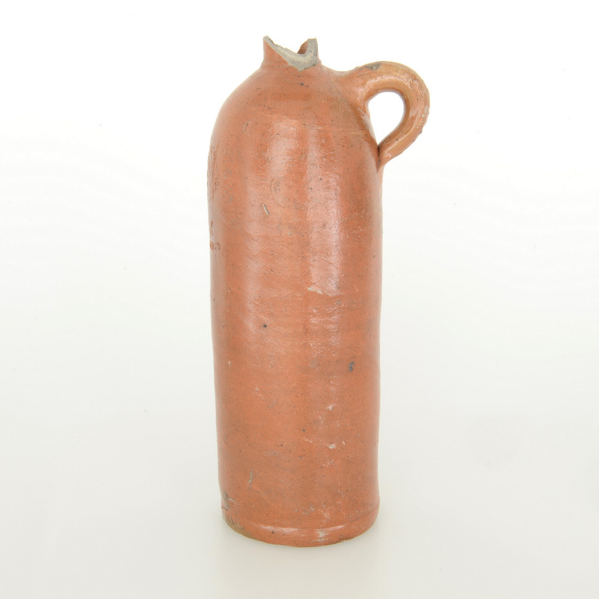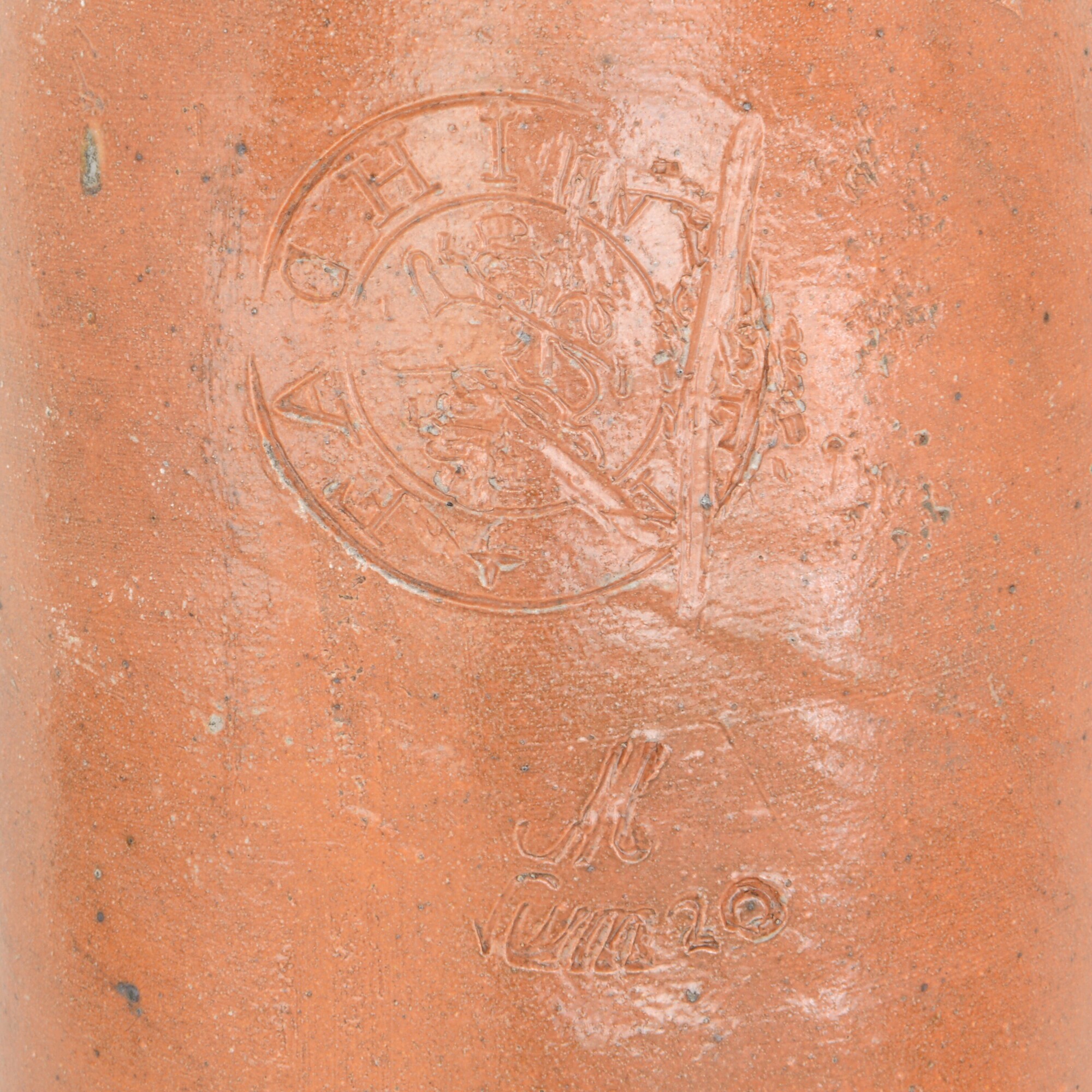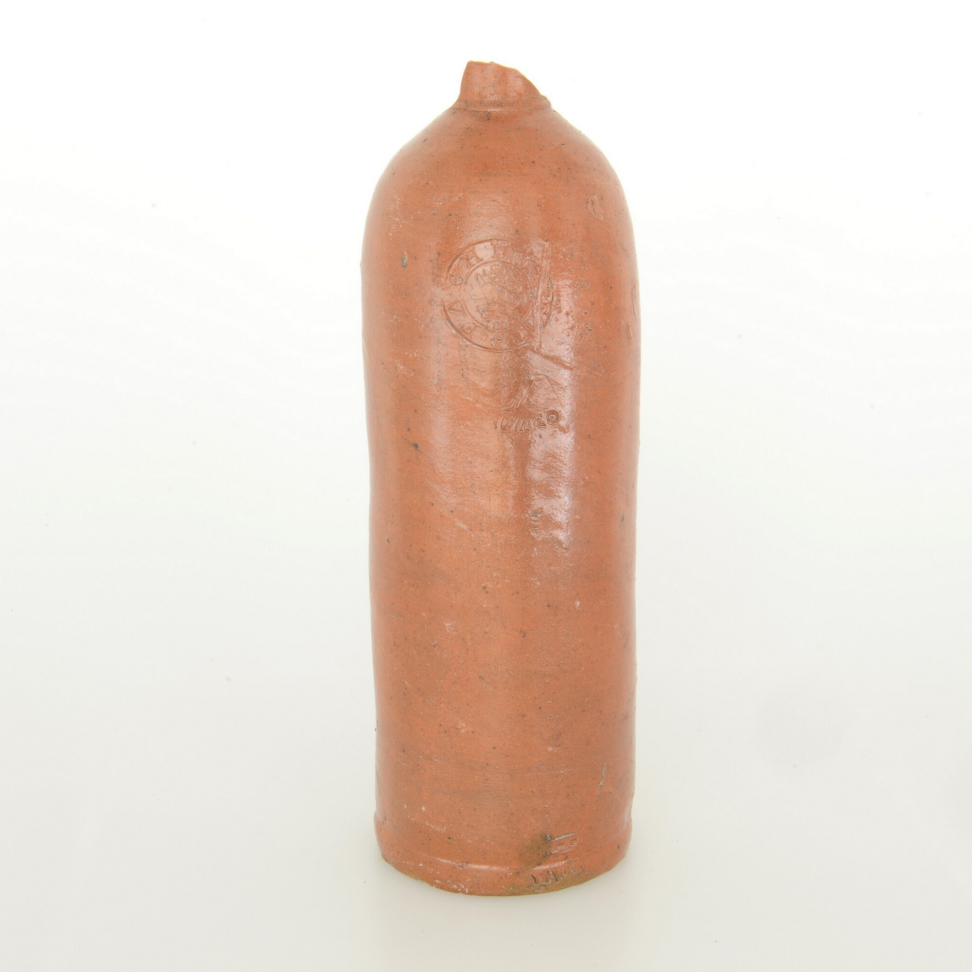 Mineraalwaterfles; s2-fle-4; cilindrische fles met afgeronde schouder, korte cilindrische nek met verdikte lip; verticaal lintoor; holle bodem; rondmerk: FACHINGEN met in centrum leeuw en stempel N num 20; herkomst: Westerwald