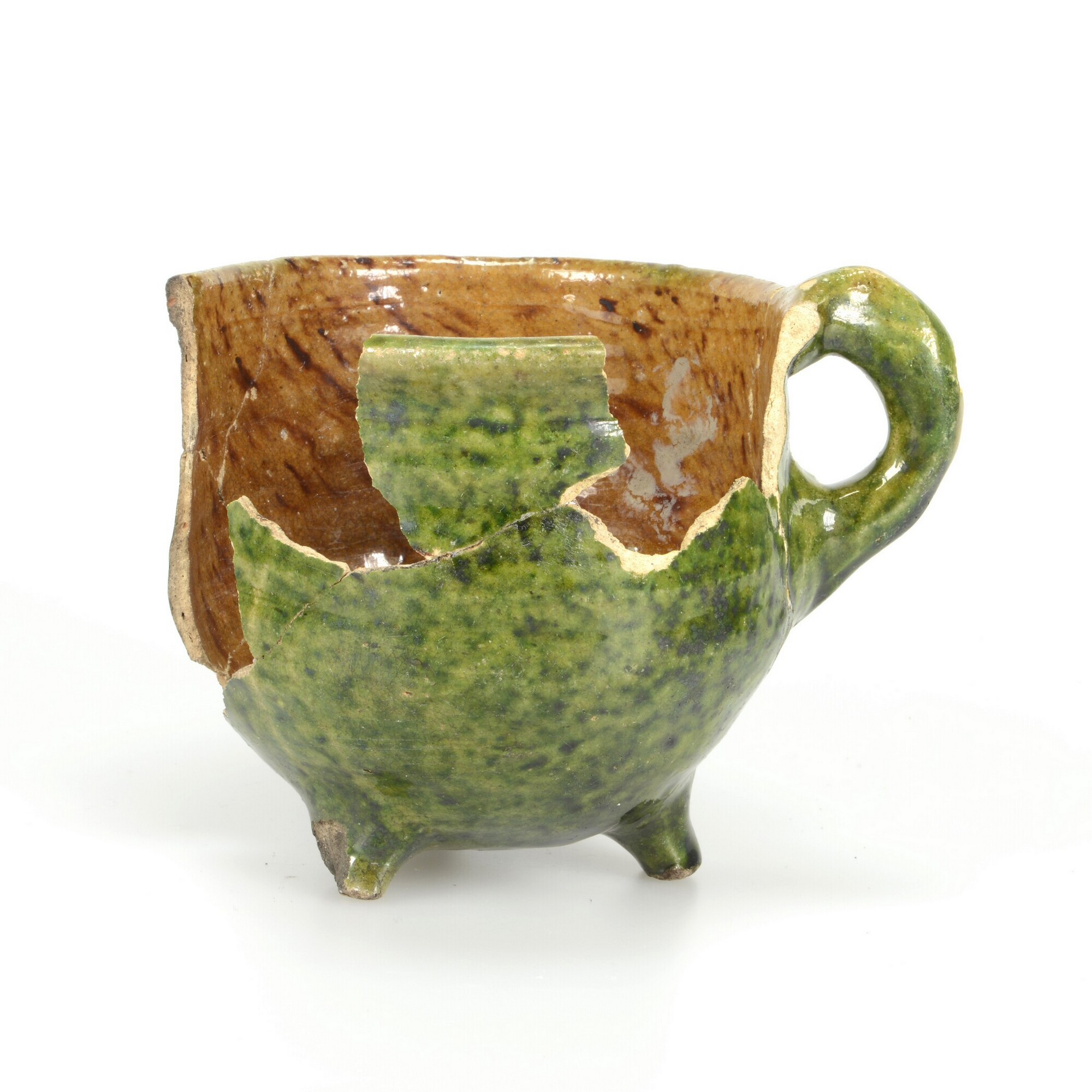 Grape; w-gra-22; wijdmondige grape met afgeronde buikknik en licht uitgebogen rand; witbakkend aardewerk; loodglazuur met koperoxide; drie poten; verticaal worstoor