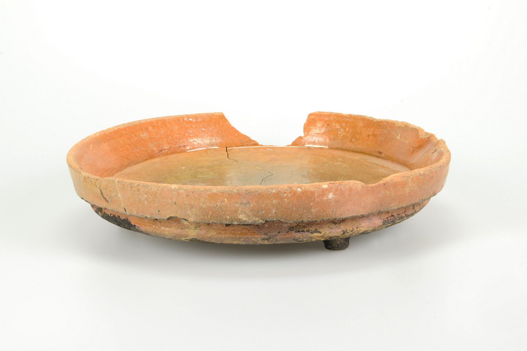 Steelpan; r-bak-12; bakpan met lage zijwand en hoge kraagrand; roodbakkend aardewerk; loodglazuur; drie poten; steel (ontbreekt); drie poten; uitwendig beroet