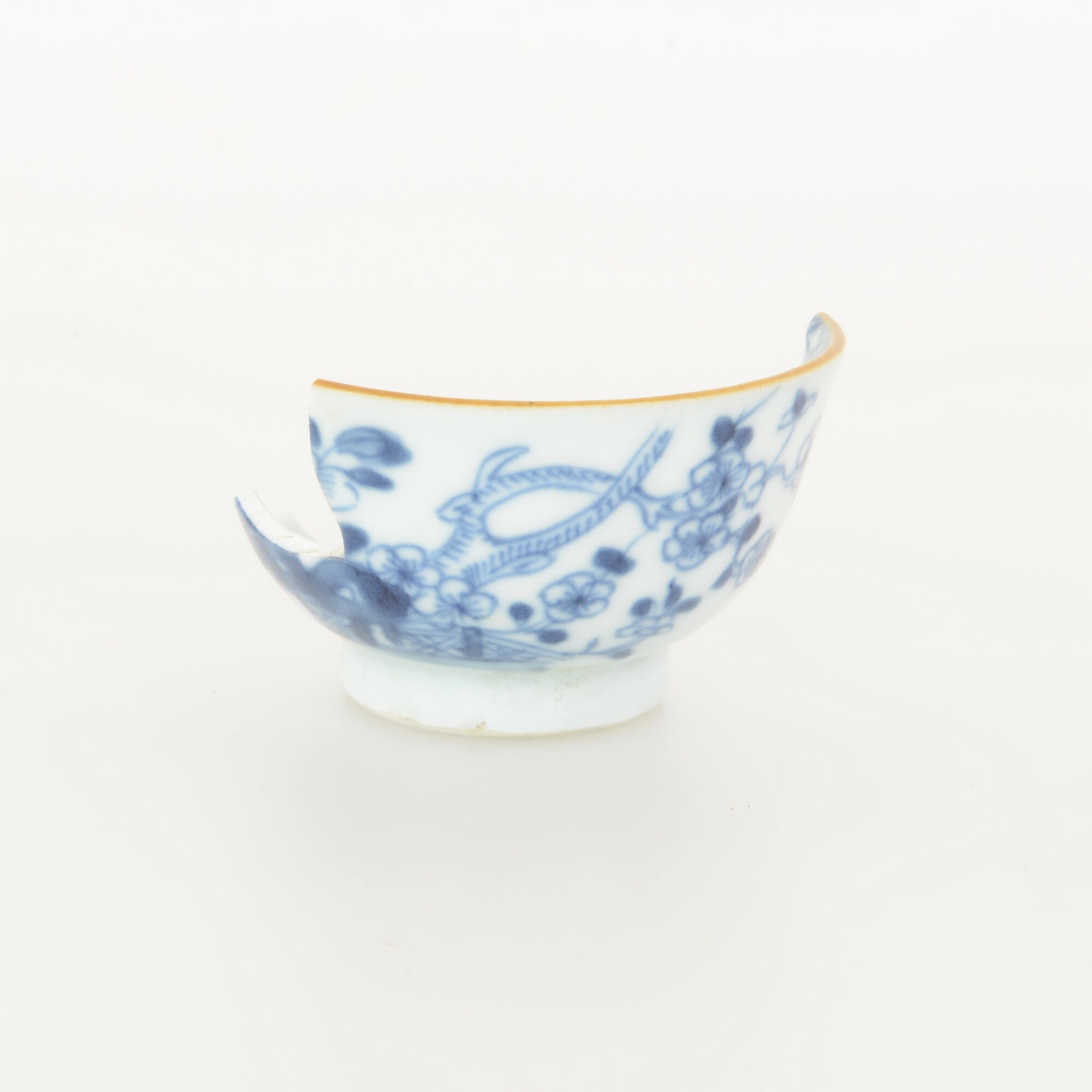Kop; p-kop-4; afgeronde kop met rechte rand; Aziatisch porselein; veldspaatglazuur; blauw op wit: uitw.: florale beschildering, vl: bloem, roodbruin randje; standring; herkomst: China