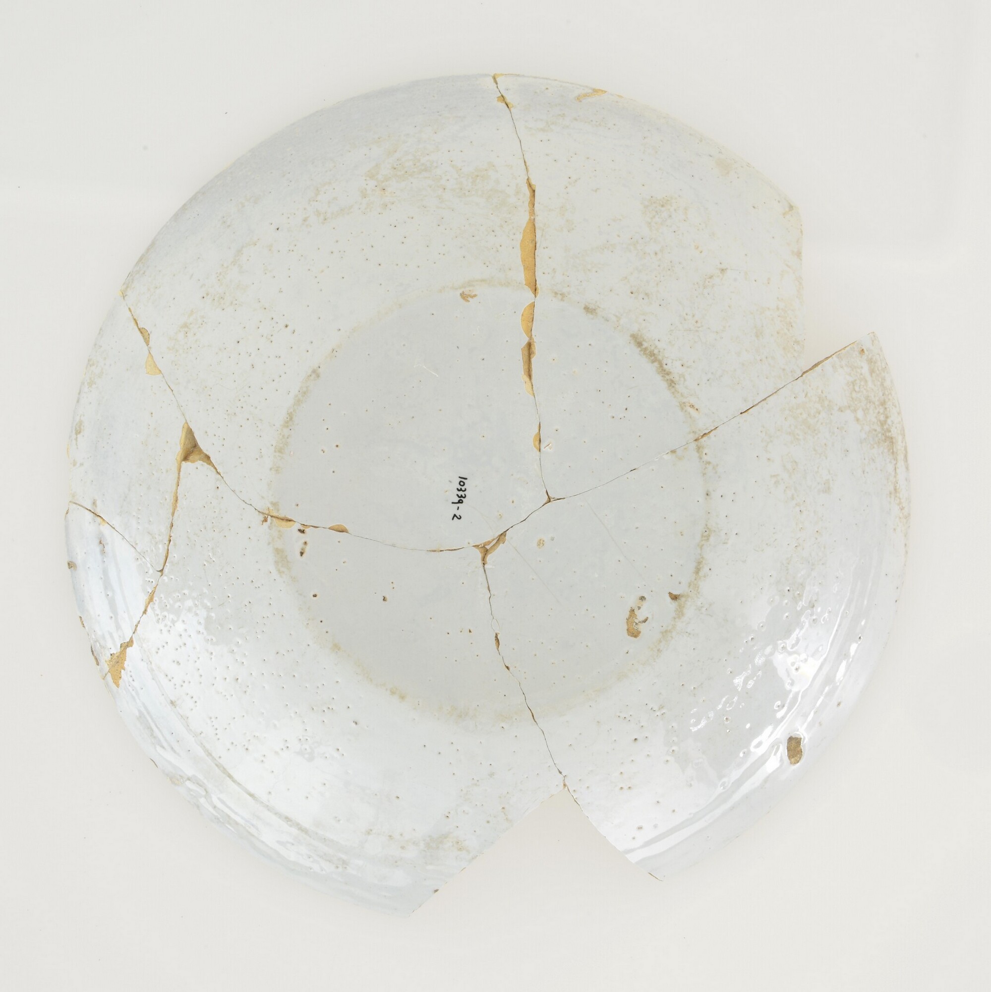 Bord; f-bor-5; afgerond bord met platte bodem en smalle vlag; faience; tinglazuur; versiering van zes groepjes van zes blauwe stippen; standvlak