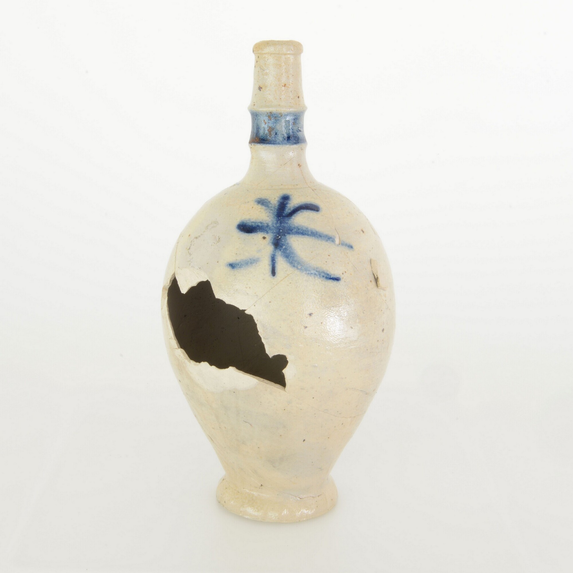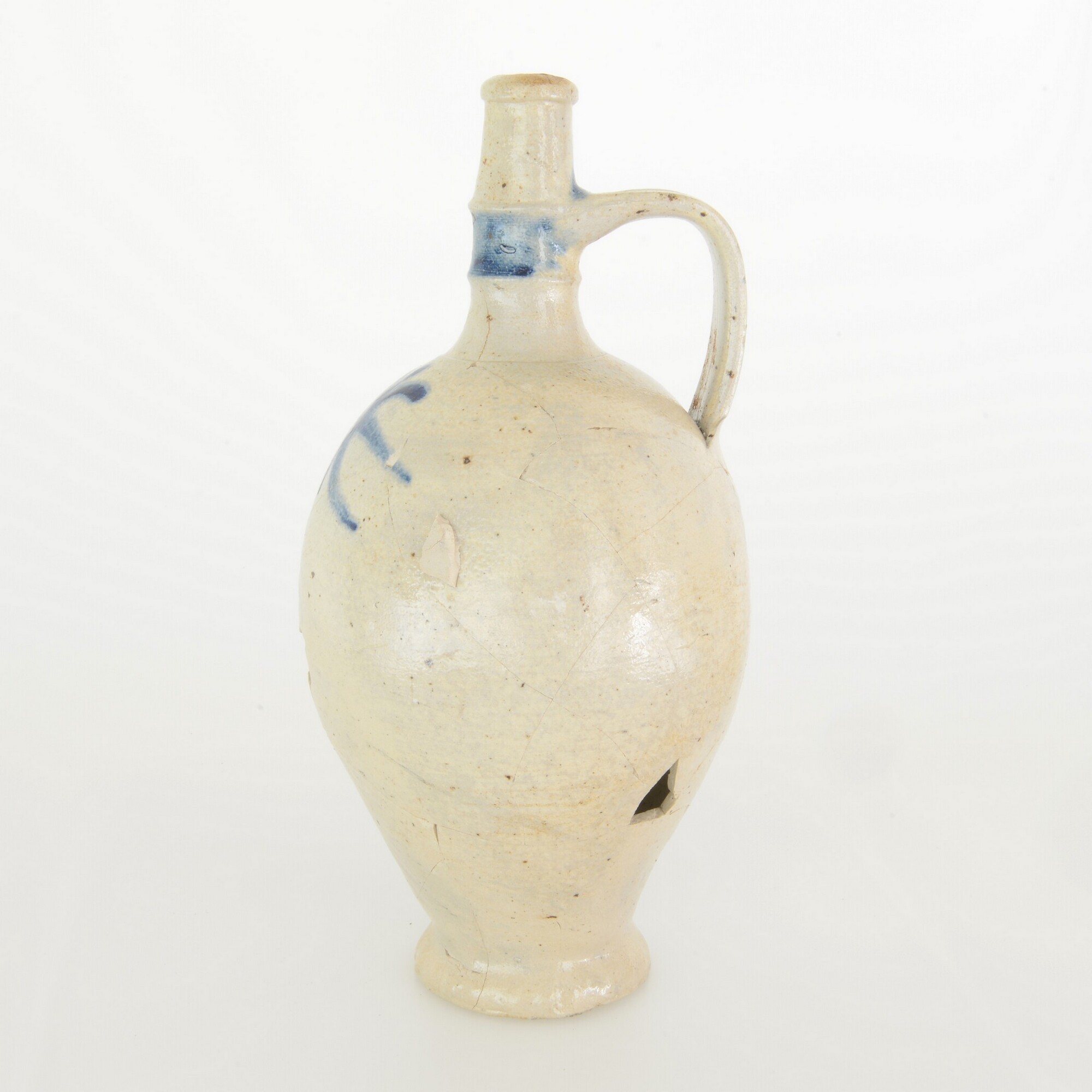 Mineraalwaterfles; s2-fle-5; P-kruik: zeer bolle fles met hoge hals met ribbels; steengoed; zoutglazuur, kobaltoxide; blauwe ster; standvlak; één verticaal lintoor; herkomst: Westerwald