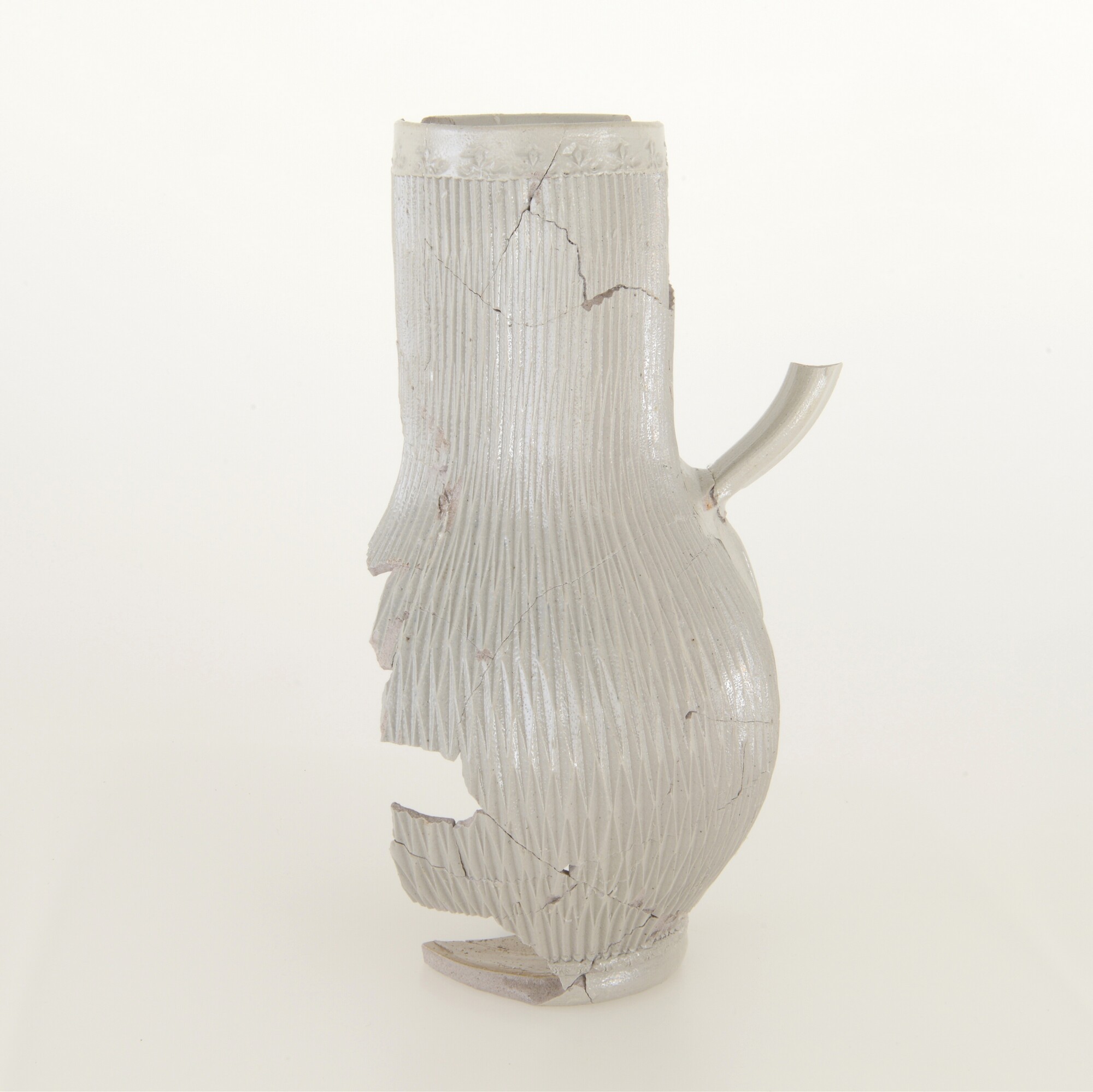 Kan; s2-kan-25; bolle drinkkan met wijde en hoge cilindrische hals en rechte rand; steengoed; in- en uitwendig zoutglazuur; wafelpatroon en bloemstempeltjes langs rand; standvoet; één lintoor; herkomst: Westerwald