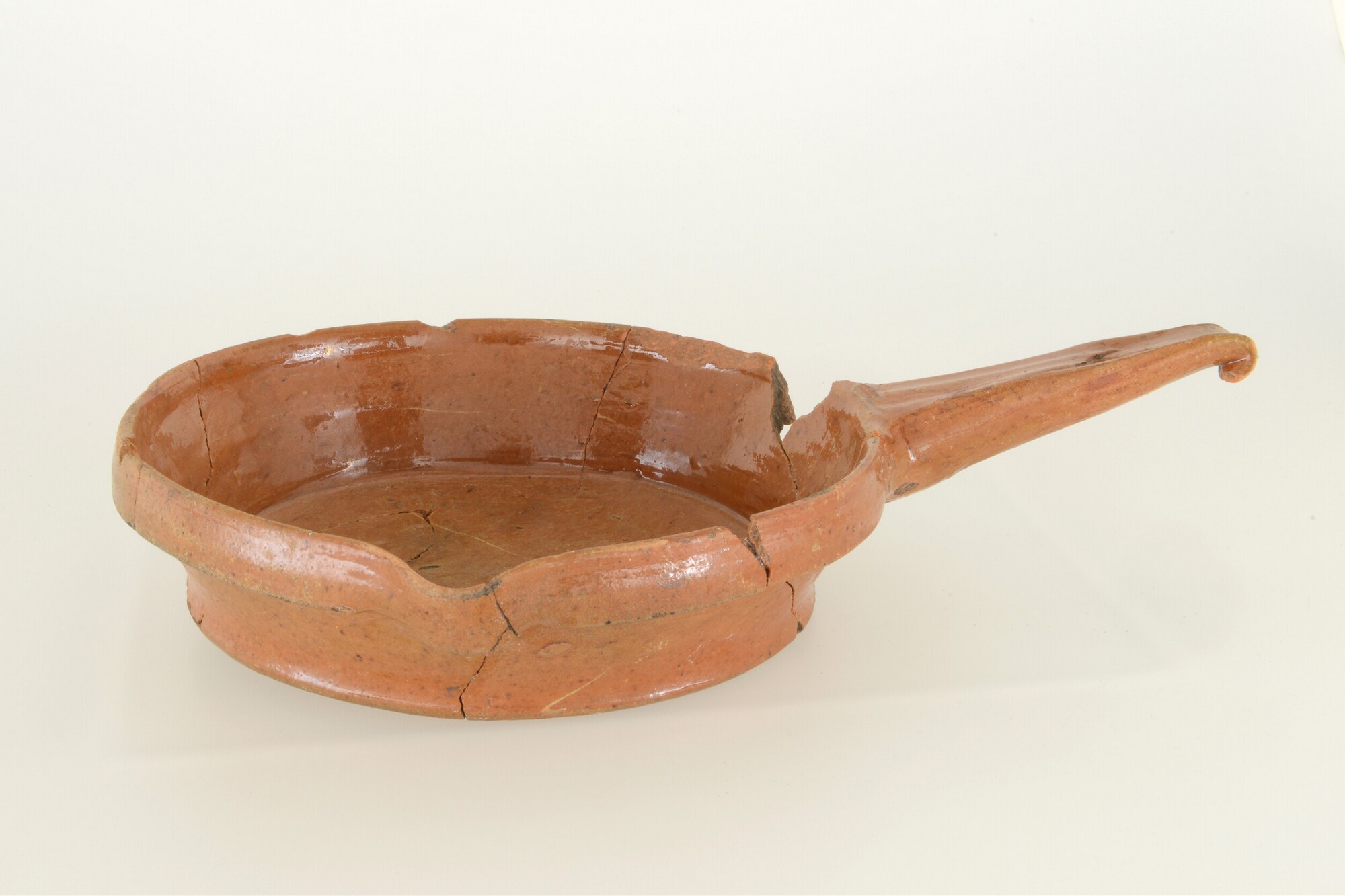 Steelpan; r-bak-4; bakpan met kraagrand; roodbakkend aardewerk; in- en uitwendig loodglazuur; één toegevouwen steel met omgekruld uiteinde; schenklip