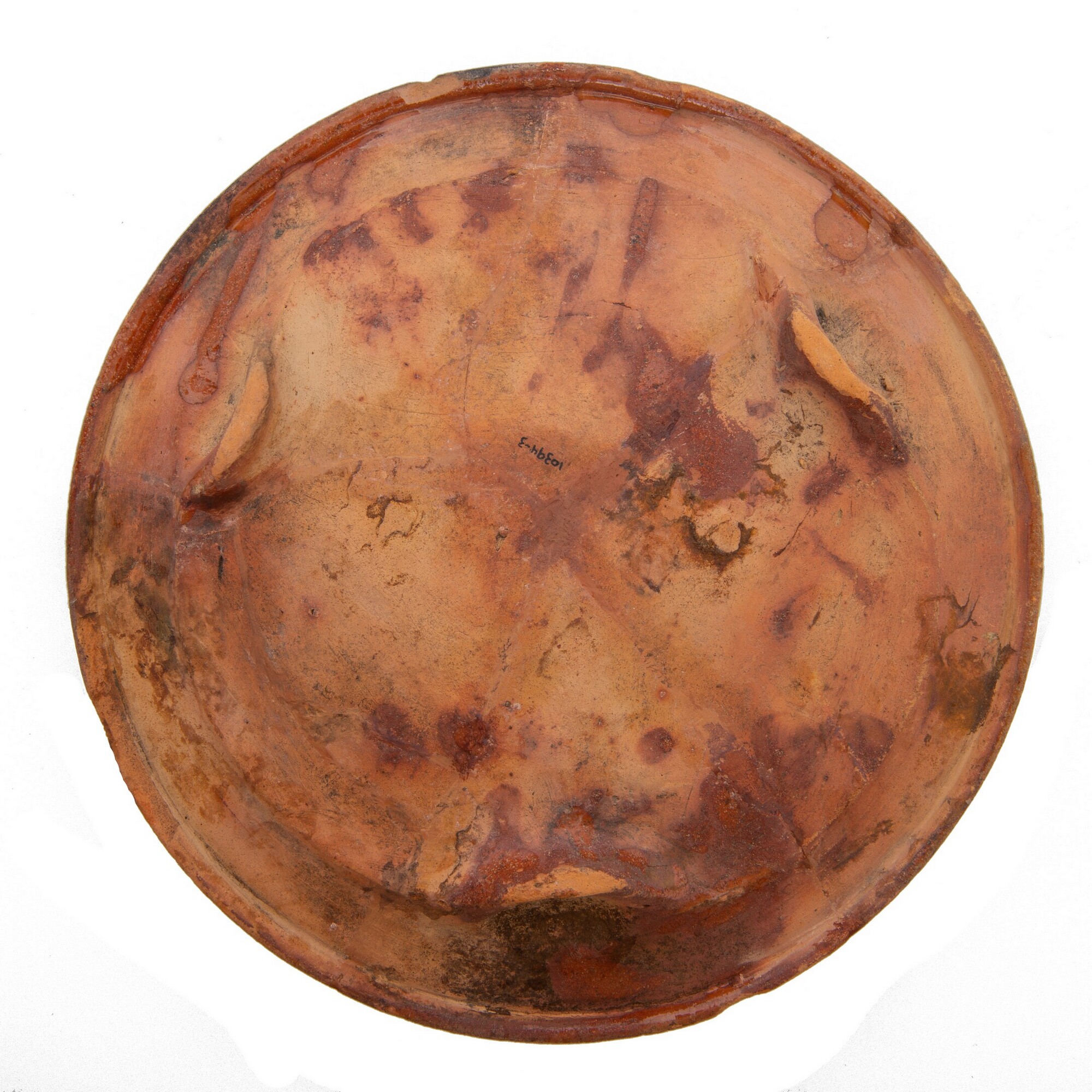 Bord; r-bor-50; bord met holle spiegel en platte vlag met buiten aangedrukte rand, drie standlobben; roodbakkend aardewerk (Noord-Hollands slibaardewerk); inwendig loodglazuur; slibversiering: witte kleislib met accenten in koperoxide; spiegel: wapen van Alkmaar met jaartal 1641 en bladeren, vlag: patroon van vier slingerlijnen in vijfhoek met ertussen telkens een cirkelvormig motief van acht stippen; gevlekt loodglazuur ...