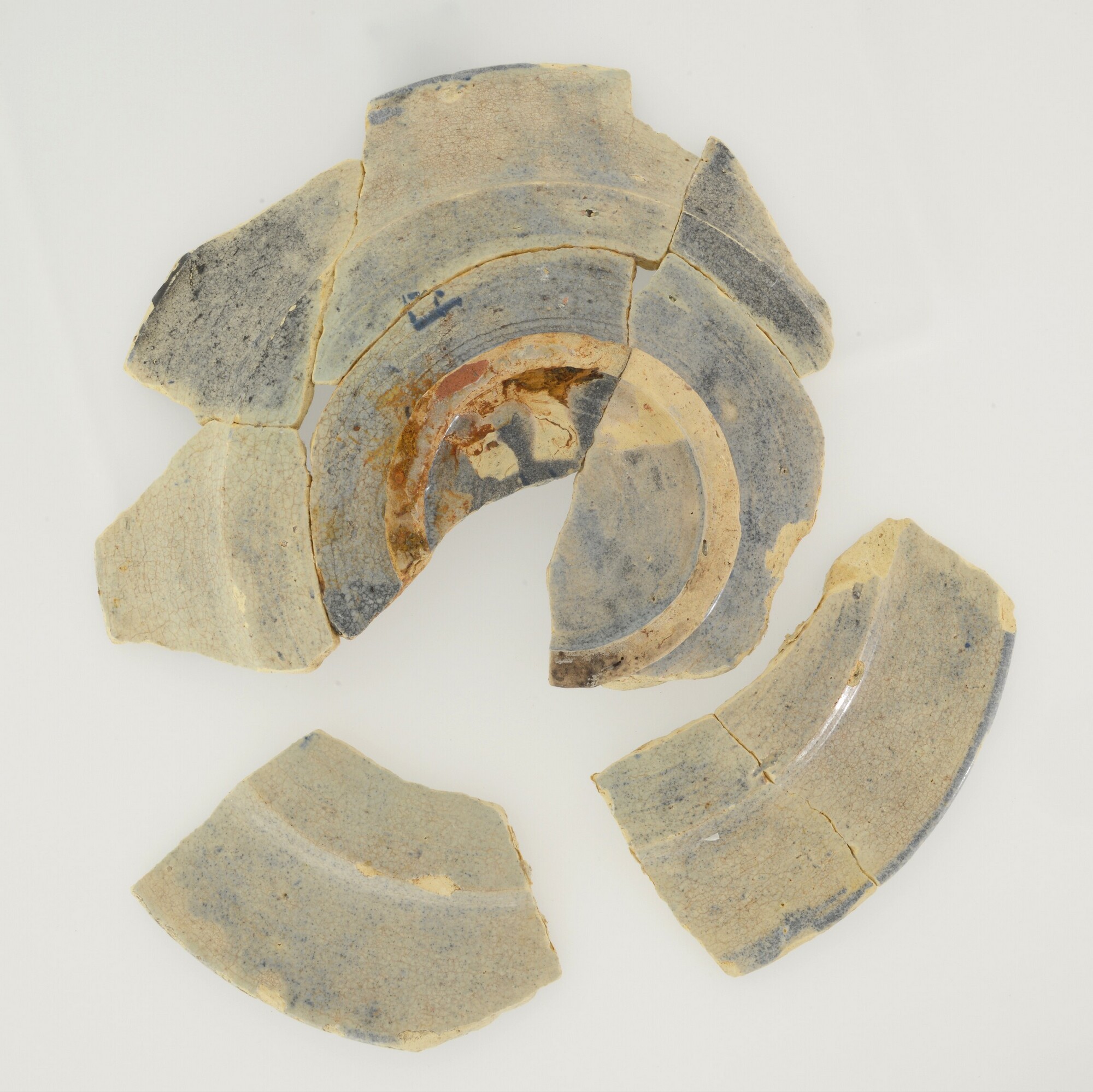 Bord; m-bor-3; bord met vlakke spiegel, knik spiegel-vlag en uitgebogen rand; Nederlandse majolica; bovenzijde tinglazuur, onderzijde loodglazuur; beschildering in blauw, groen, geel; spiegel: tekst EERT GOD; vlag: blauw lijstwerk en kabelrand; standring; onderzijde merkteken?