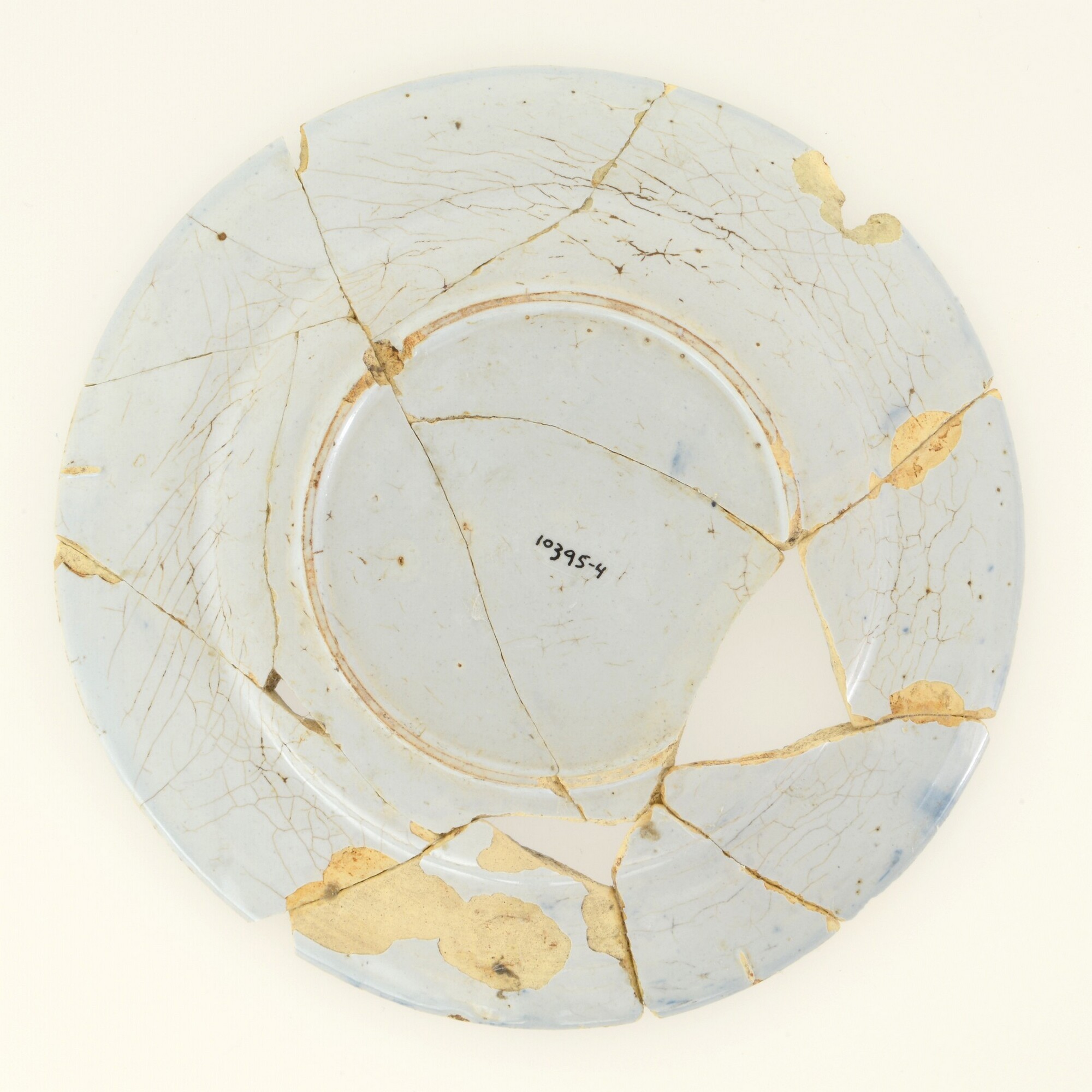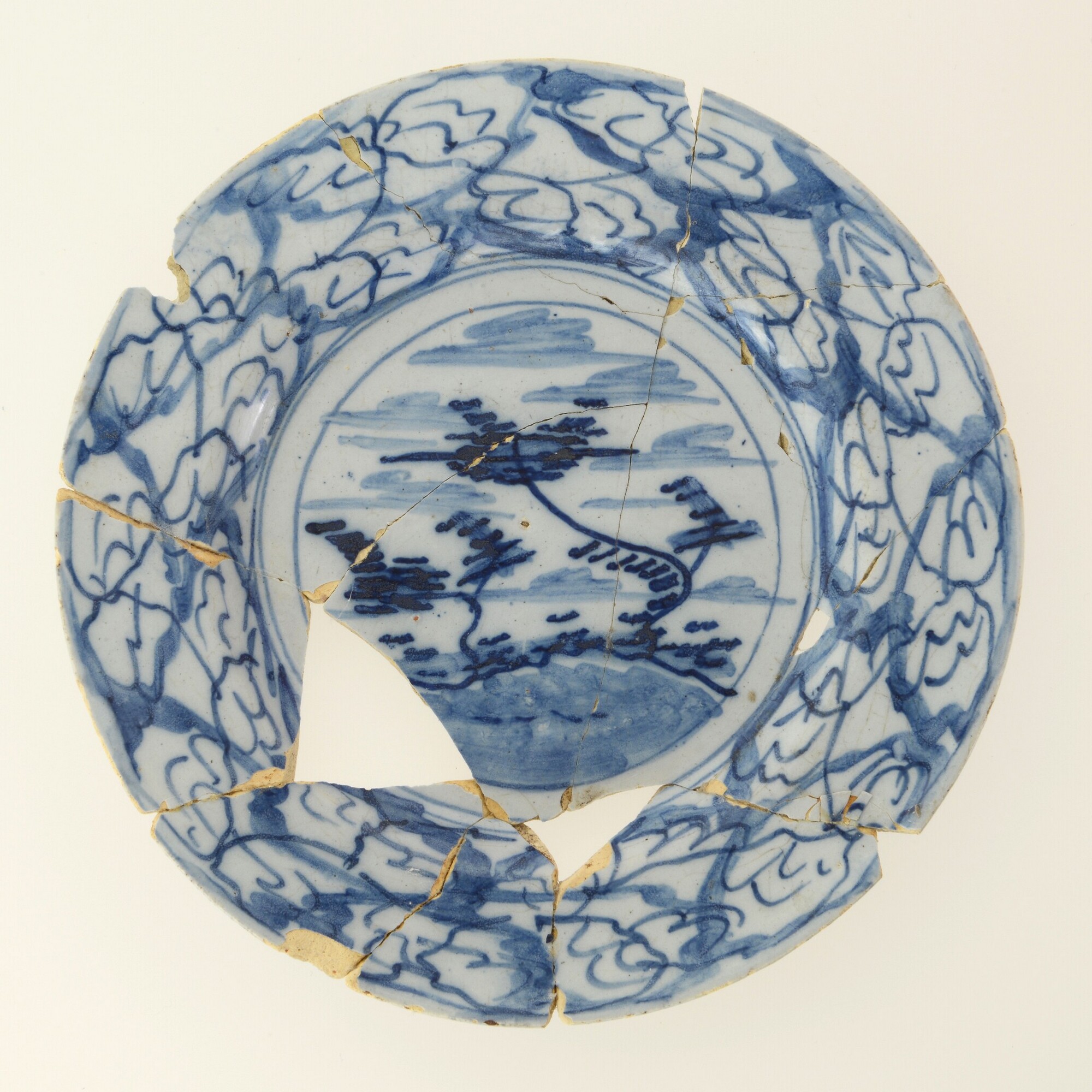 Bord; f-bor-1; bord met knik spiegel-vlag; Nederlandse faience; boven- en onderzijde tinglazuur; beschildering in blauw; spiegel: landschap, vlag: kriebellijntjes; standring; herkomst: Delft