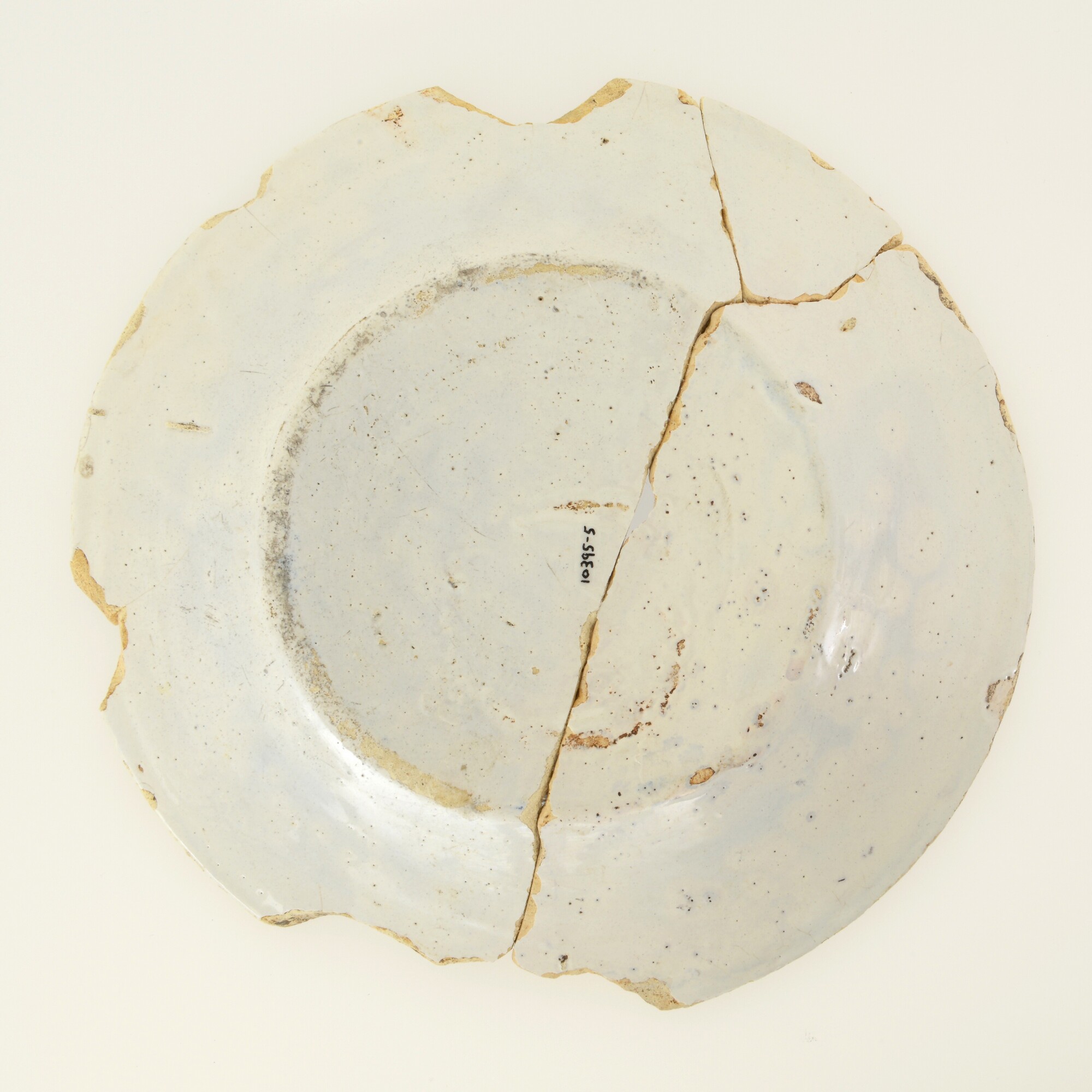 Bord; f-bor-2; plat bord met platte spiegel; Nederlandse faience; boven- en onderzijde tinglazuur; beschildering in blauw; spiegel: bloemtafereel; vlag: wit; standvlak; herkomst: Delft
