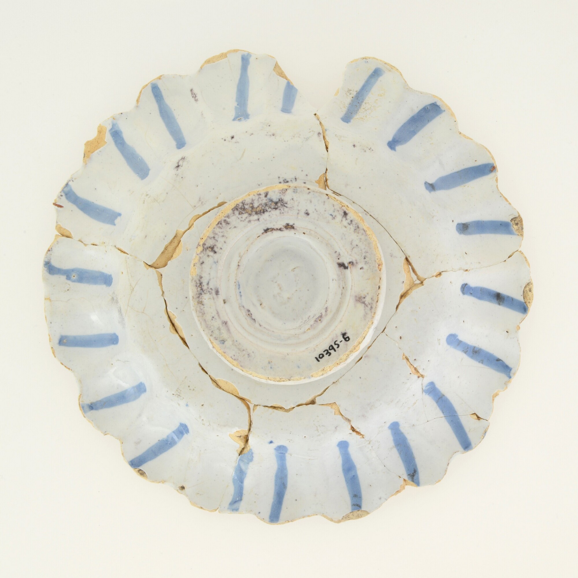 Plooischotel; f-plo-2; plooischotel met knik van spiegel naar vlag; Nederlandse faience; boven- en onderzijde tinglazuur; beschildering in blauw, oranje: spiegel: kievitsbloem, vl: aigretterand, onderzijde: blauwe strepen; standring; herkomst: Delft