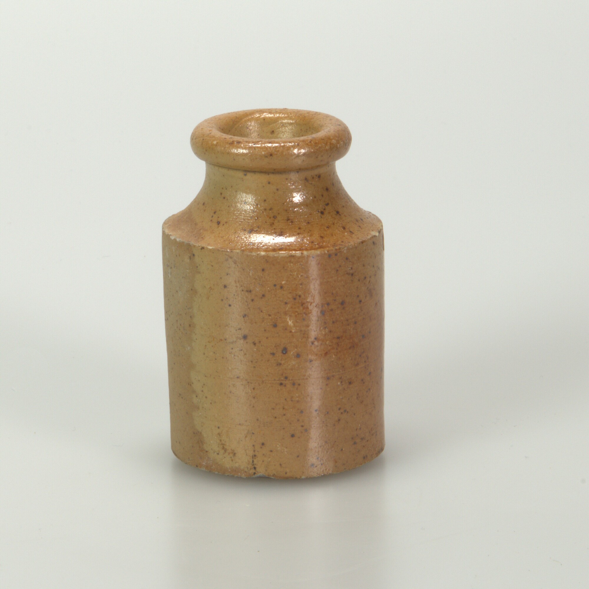 Fles/inktpot; s2-fle-1; cilindrische fles met knik wand-schouder; convexe schouder/hals; steengoed; zoutglazuur; standvlak