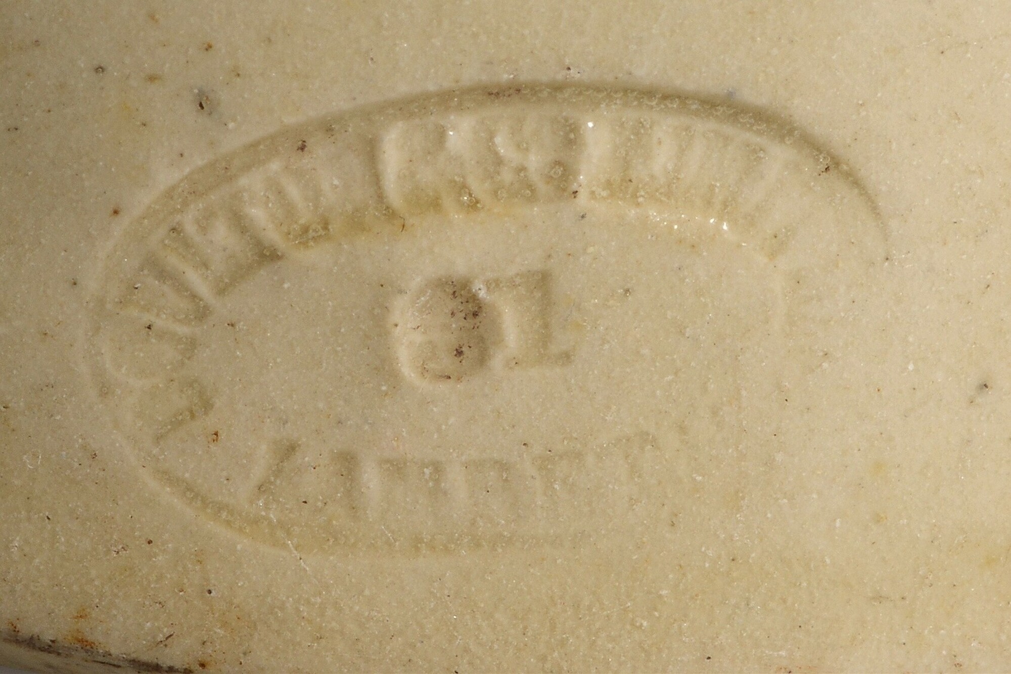 Fles; s3-fle-1; cilindrische fles met knik wand-schouder; convexe schouder/hals; saltglazed stoneware; zoutglazuur; onduidelijke ovale stempel; standvlak; herkomst: Engeland