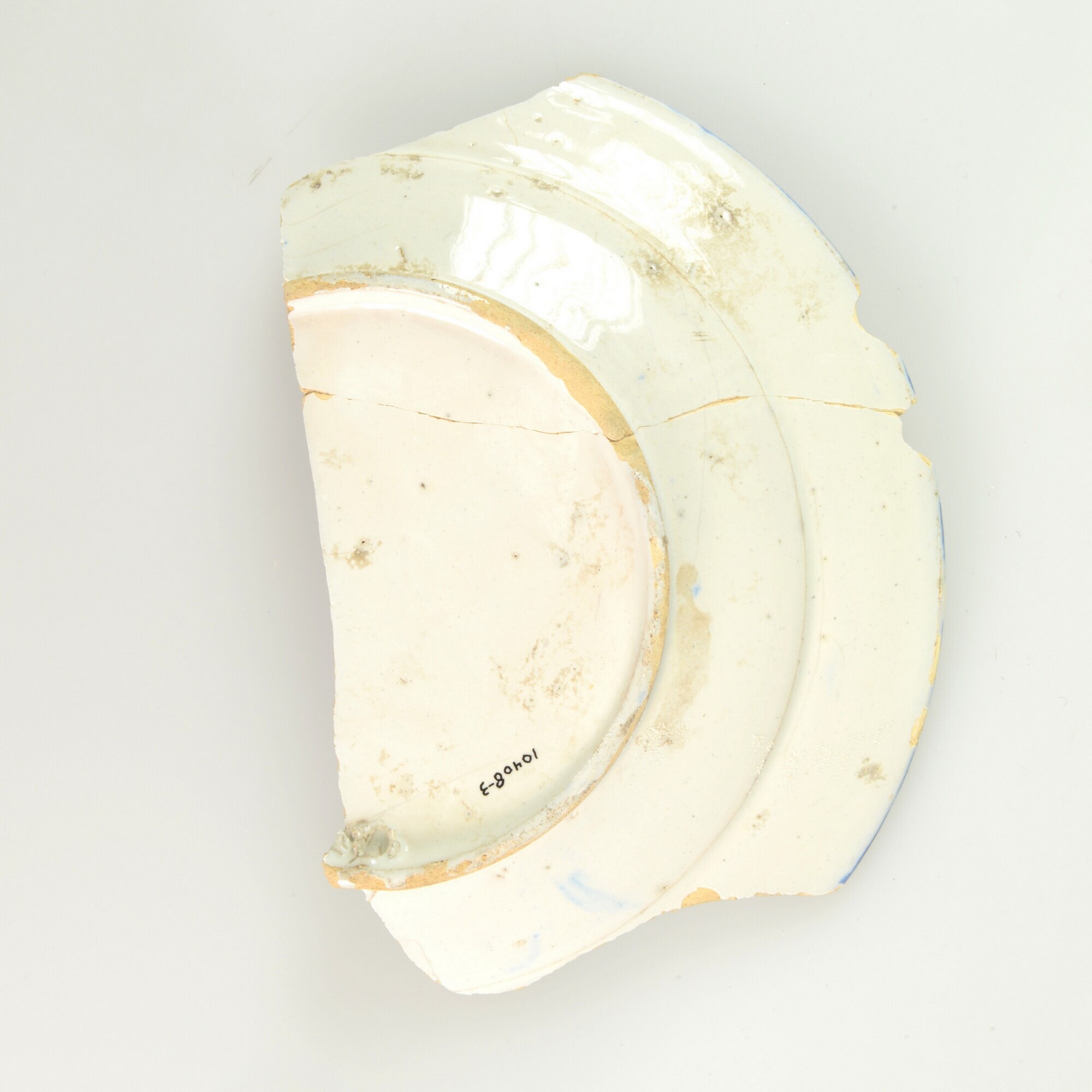 Bord; f-bor-10; bord met platte spiegel, overgaand in uitgebogen vlag; Nederlands faience; voor- en achterzijde tinglazuur; blauw op wit: spiegel: bloemenvaas, vlag: Wan-li decoratie; standring (secundaire doorboring); herkomst: Delft