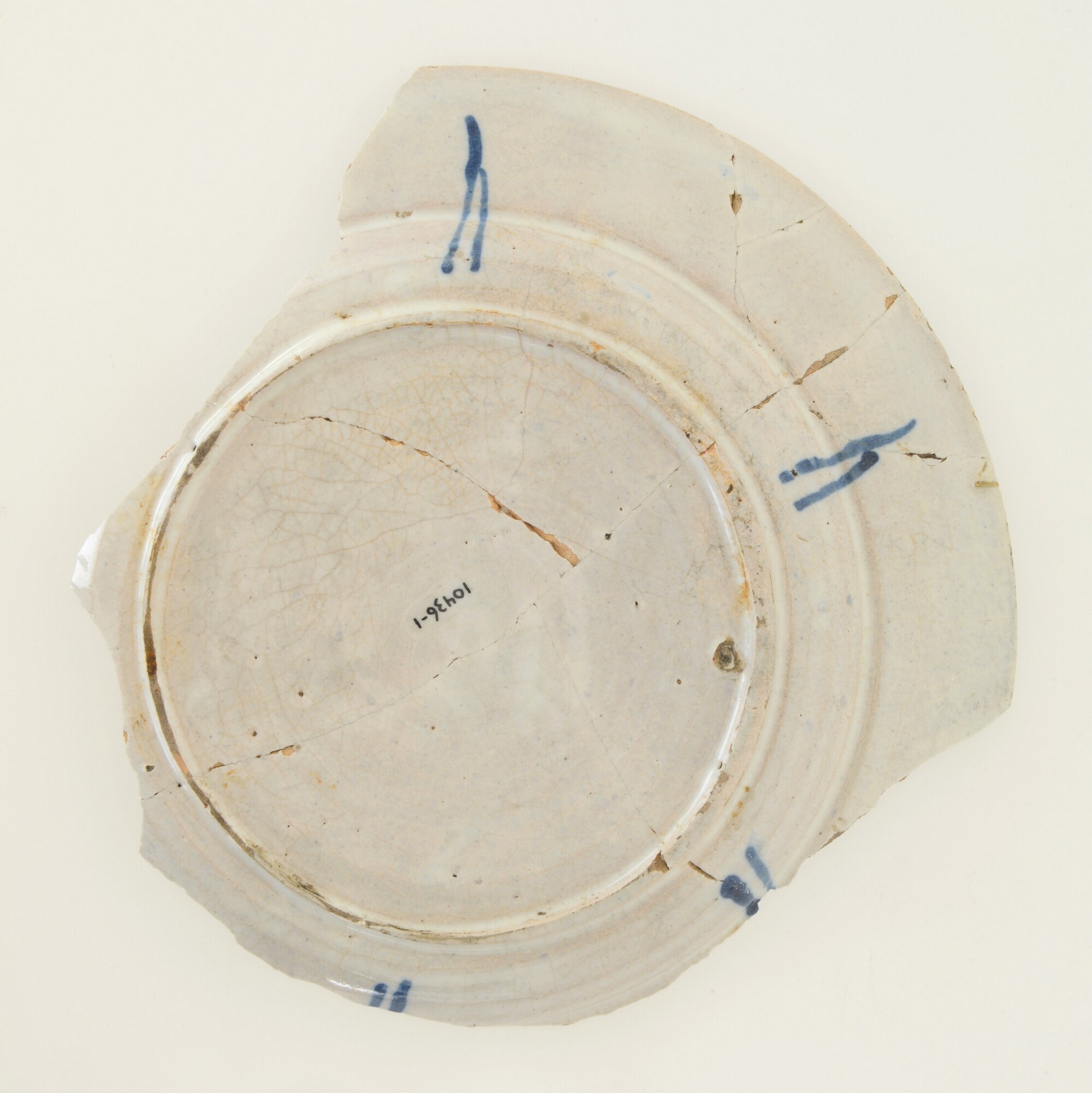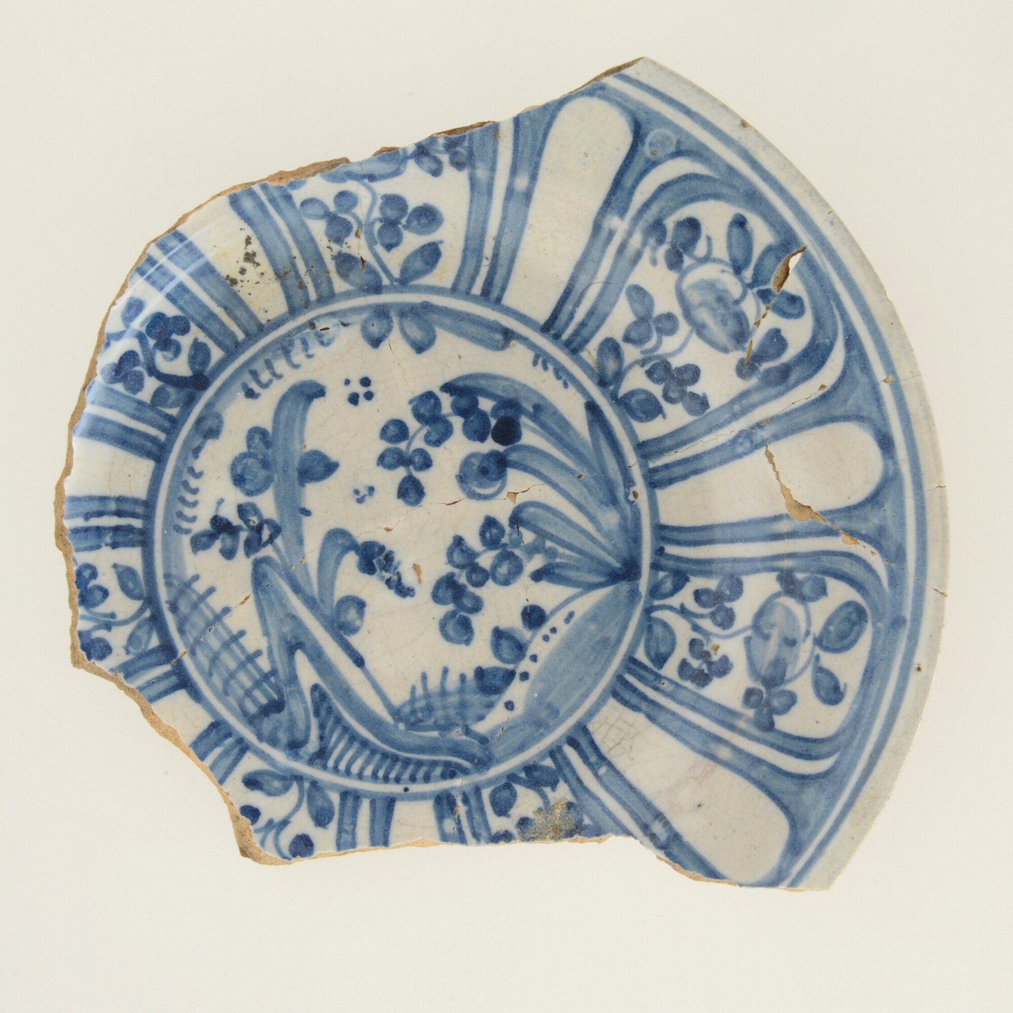 Bord; po-bor-3; bord met spiegel overgaand in uitgebogen vlag; Portugese faience; tinglazuur; blauwe beschildering: Chinese tuin, vlag: panelen met bloemen, achterzijde: strepen; standring; herkomst: Portugal