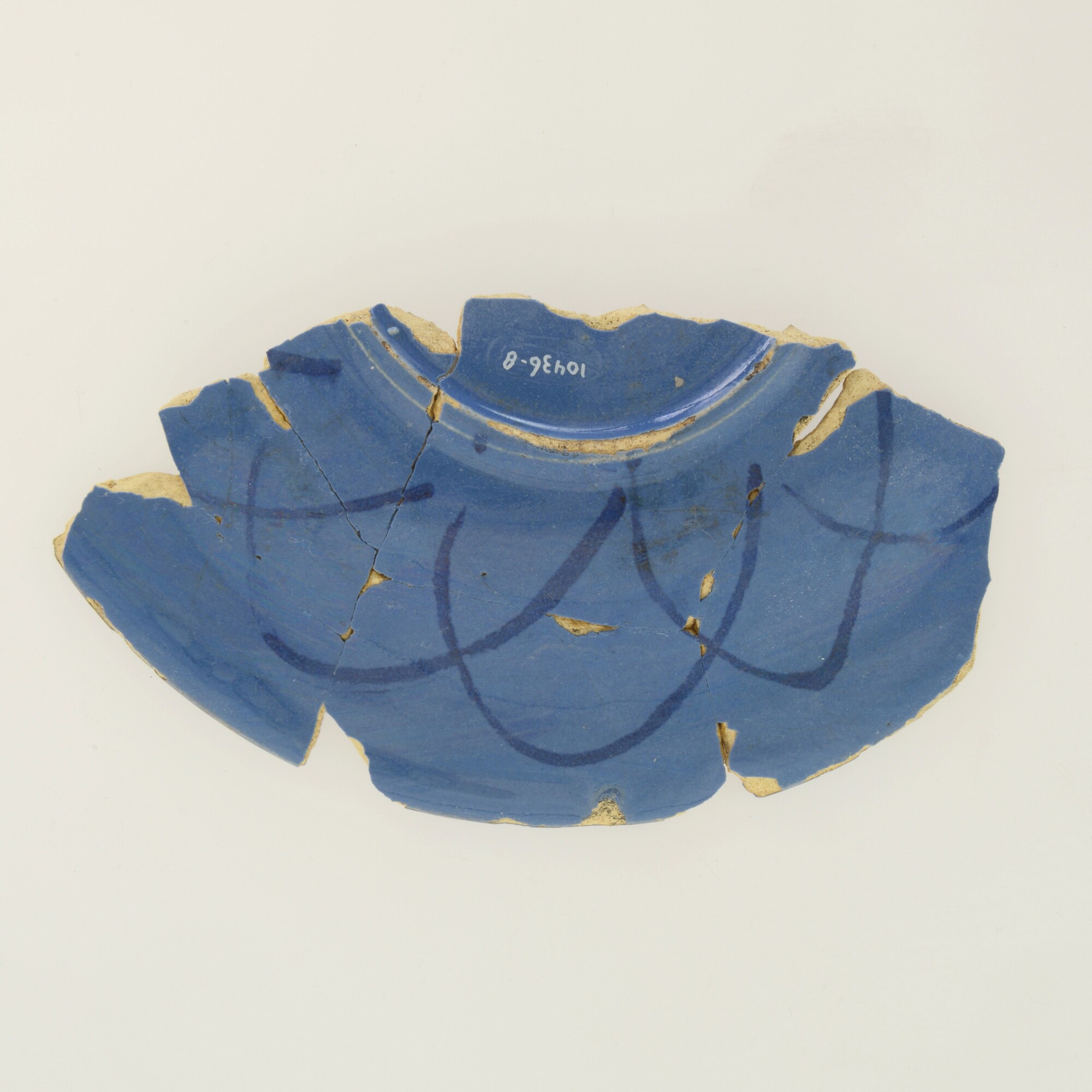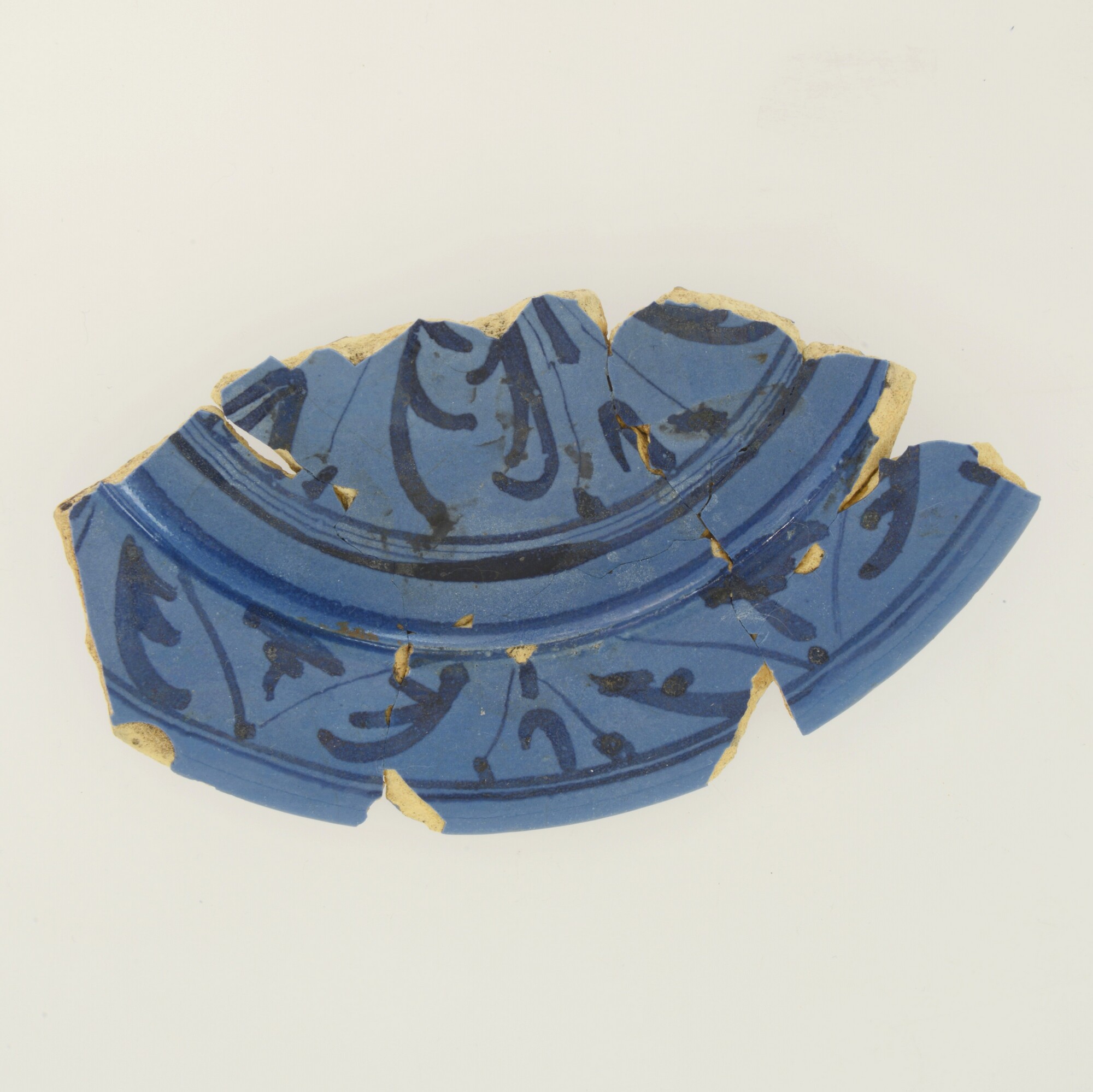 Bord; i-bor-1; bord met platte spiegel en naar buiten geknikte vlag; Italiaanse faience; tinglazuur; donkerblauwe beschildering op blauwe ondergrond: voorzijde: palmbladeren, achterzijde: bogen; standring; herkomst: Italië, Ligurië